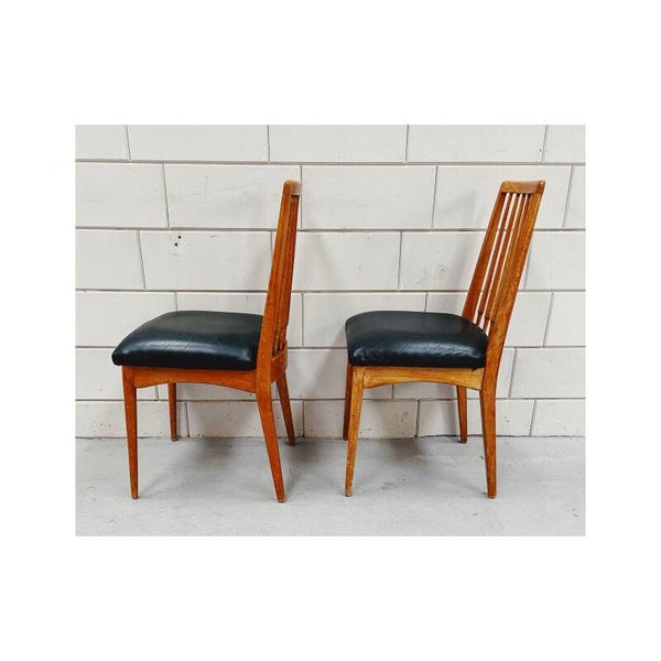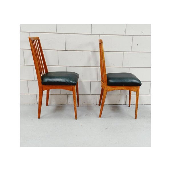 Stijlvolle houten vintage spijlenstoelen met een skai lederen zitting (kleur: donker groen) en spijlen rug. De stoelen hebben een Scandinavisch design. De stoelen hebben wat gebruikssporen overeenkomstig met de leeftijd. In het skai leer zitten wat kleine barstjes, maar de stoelen zien er nog prachtig uit en zitten nog heerlijk!