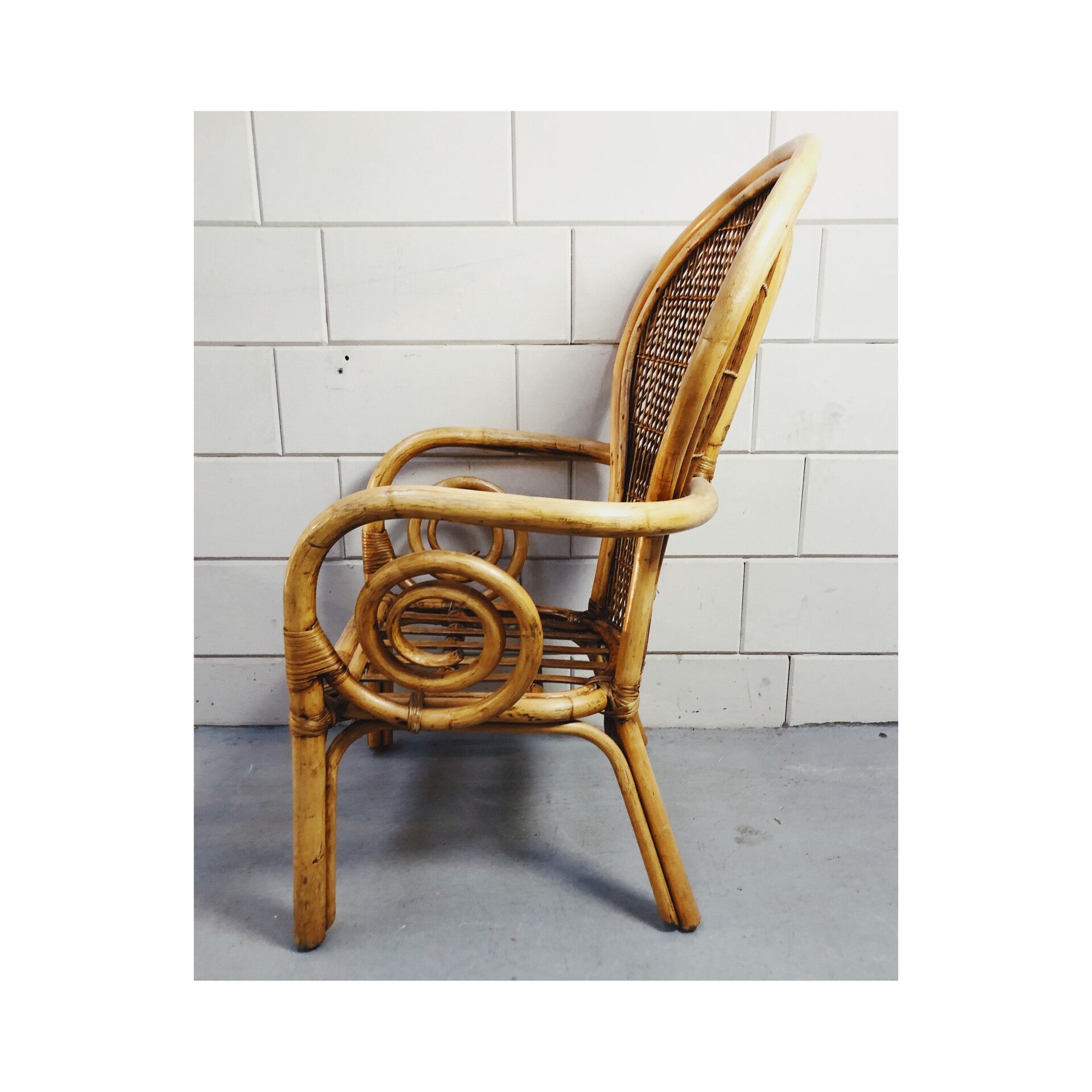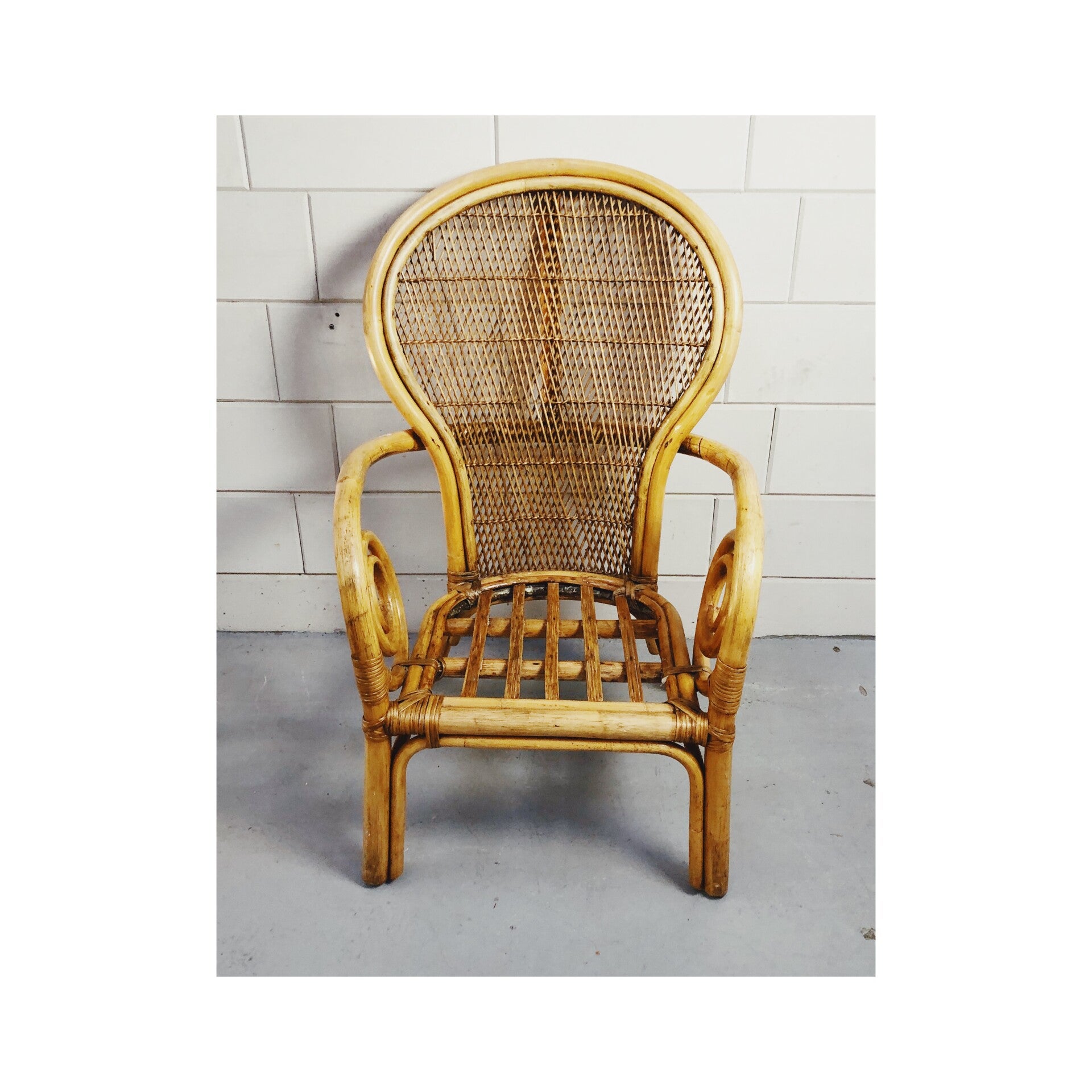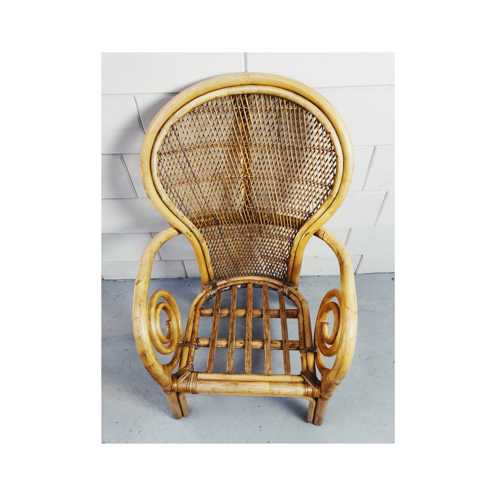 Deze stoel brengt de warmere sferen weer in huis. Met het gevlochten rugvlak de gekrulde armleuningen en het gespijlde zitvlak brengt deze stoel de boho trend tot zijn recht. De stoel heeft wel wat zichtbare gebruikssporen doordat het meubel waarschijnlijk buiten heeft gestaan. Wel is de stoel nog zeker klaar voor een volgende ronde.