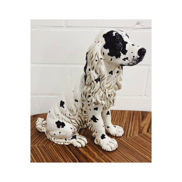 Mooi groot beeld van een Engelse Cocker Spaniel. De zittende Cocker is vervaardigd in zwart en wit. Het beeld is in goede vintage staat. Afmetingen Hoogte: 39cm