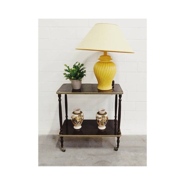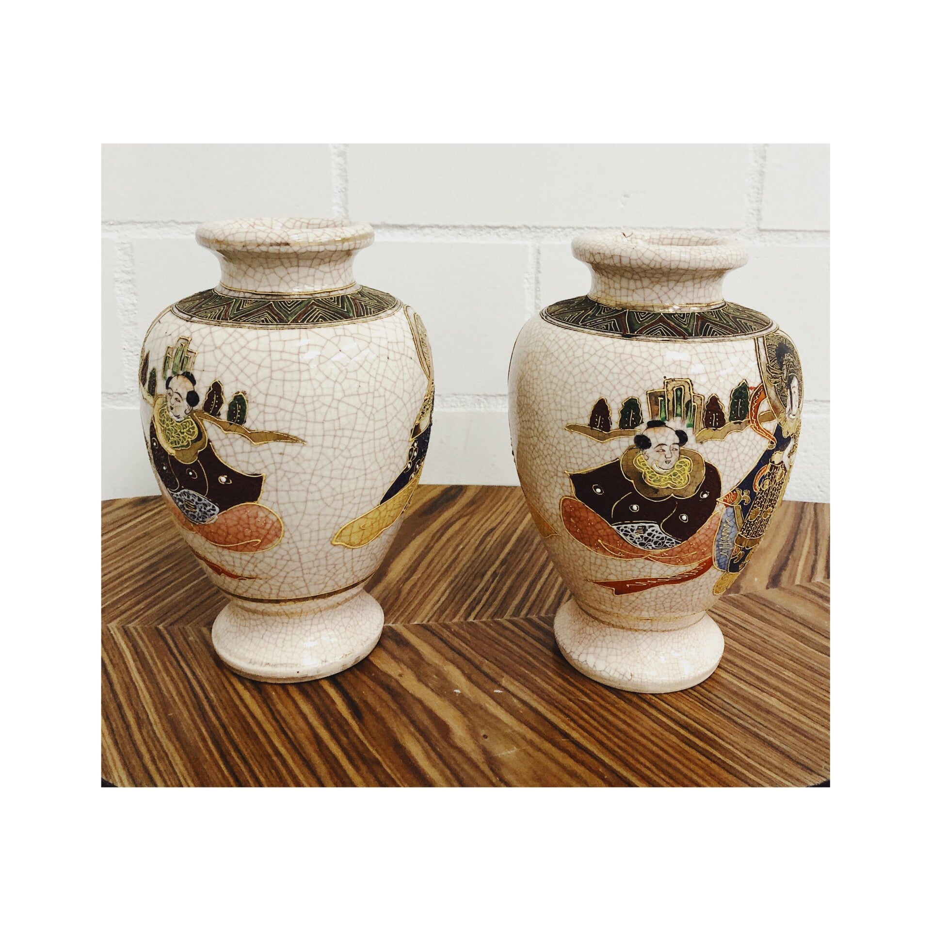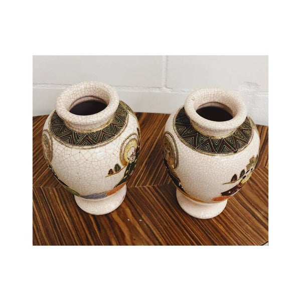 Set van Oosterse vazen. De vazen hebben een beige achtergrond en zijn versierd met beelden van Chinese goden en Oosterse taferelen. De afbeeldingen hebben allen gouden accenten en hoogtepunten. De vazen zijn in hele goede vintage staat, hebben geen chips of scheuren.