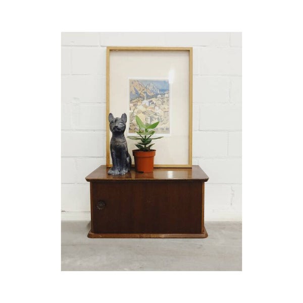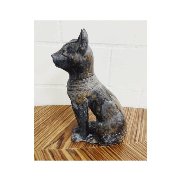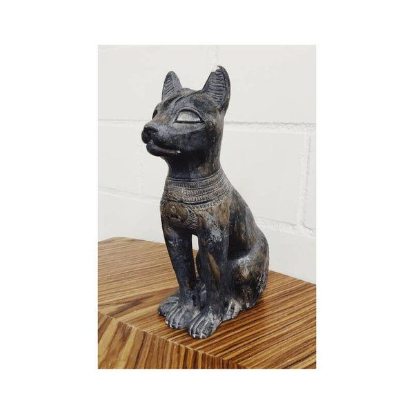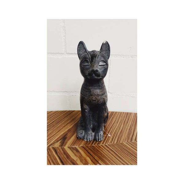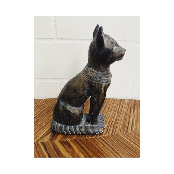 Kattenlovers opgelet! Massief beeldje van de kattengodin Mau. Het beeldje is van een mooi compact formaat en vervaardigd uit donker albast. De Egyptische kat heeft een klein chipje uit het oor maar is verder in goede vintage staat.