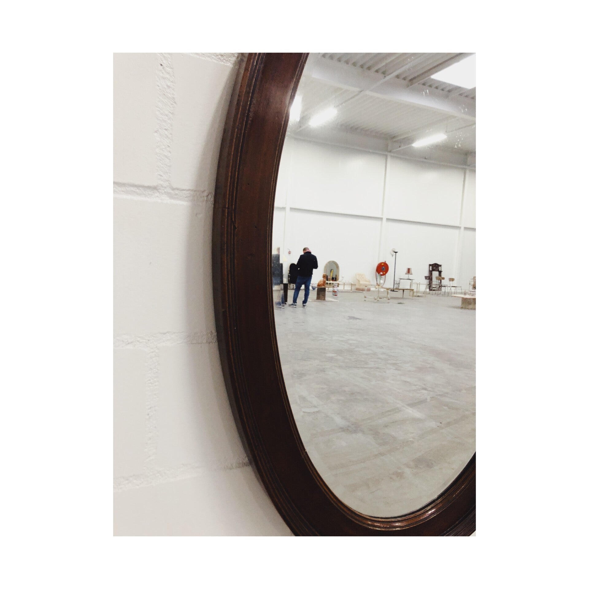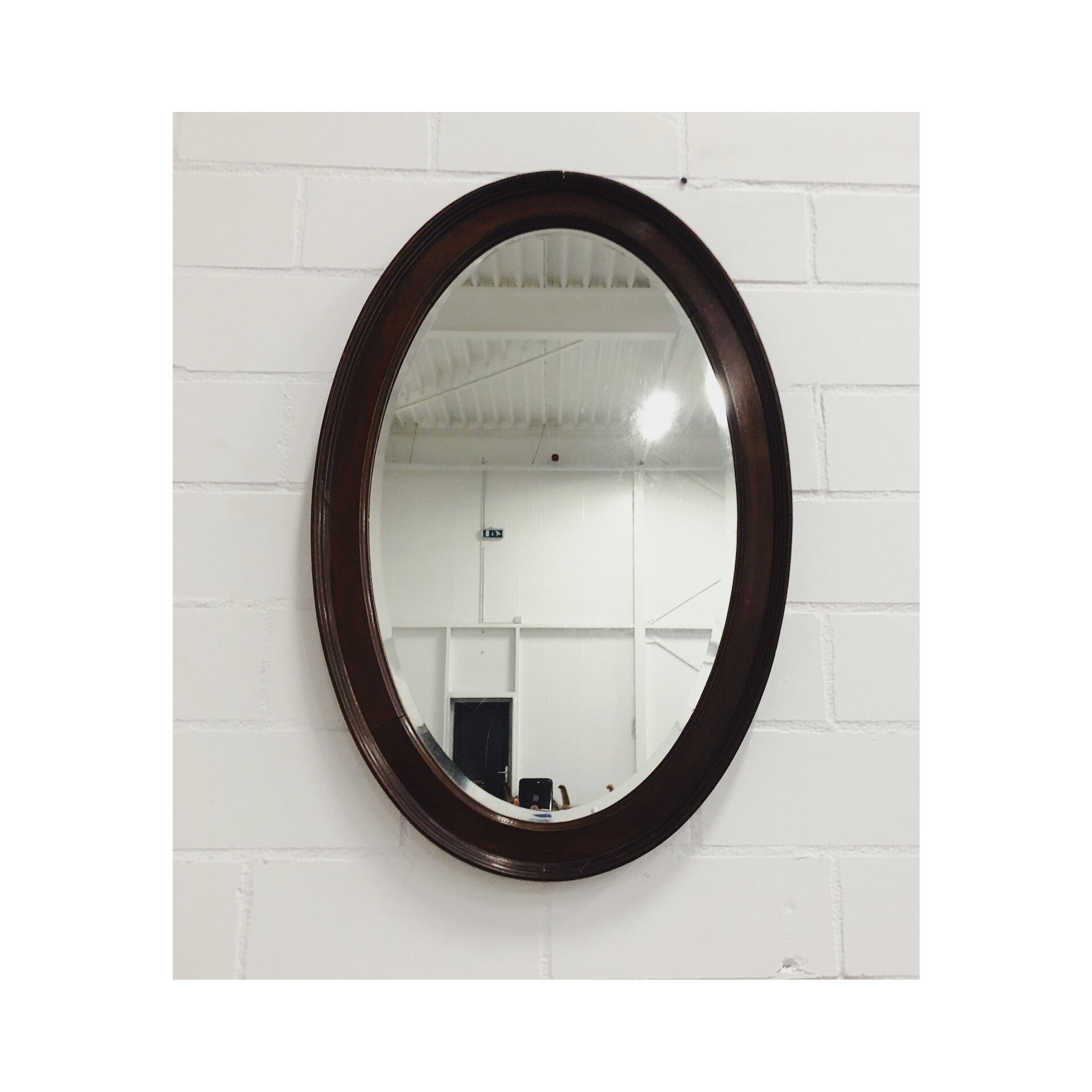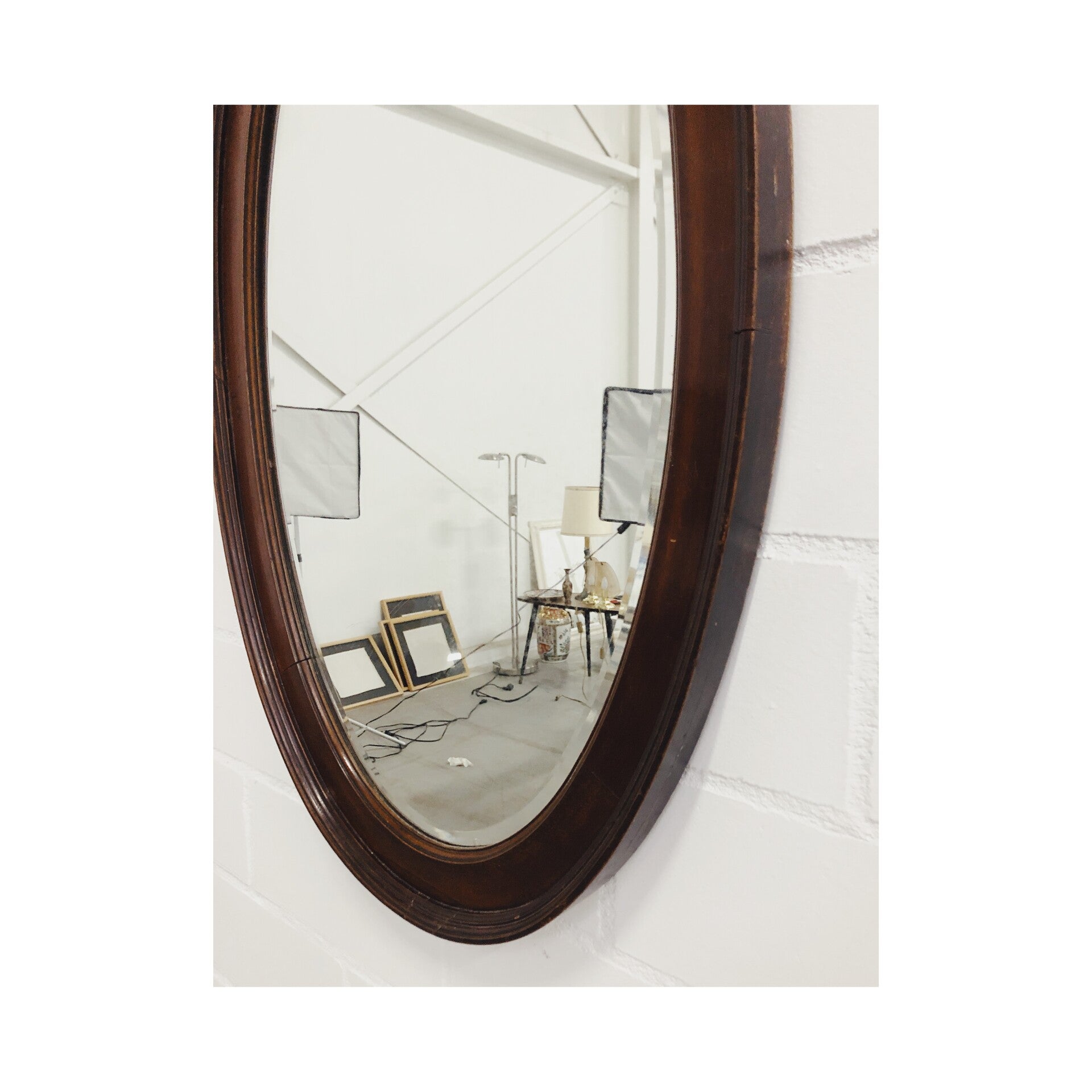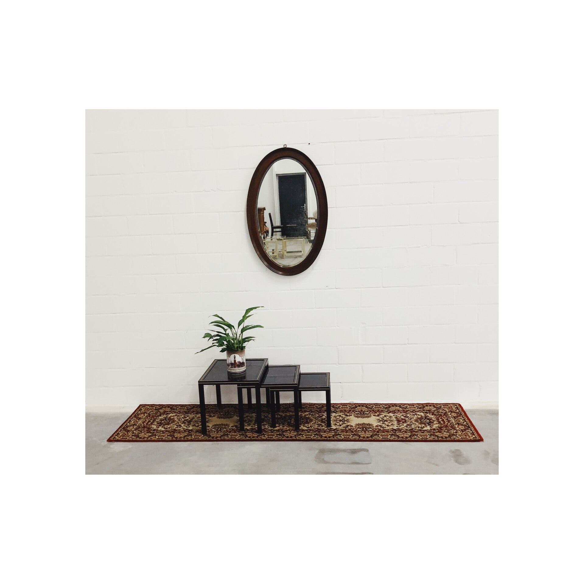 Prachtige ovale spiegel voor aan de wand. De spiegel heeft een mooie bruine mahonielijst. Aan de achterzijde bevindt zich een handig ophangsysteem. De spiegel heeft een paar kleine plekjes op het glas maar is verder in goede vintage staat.
