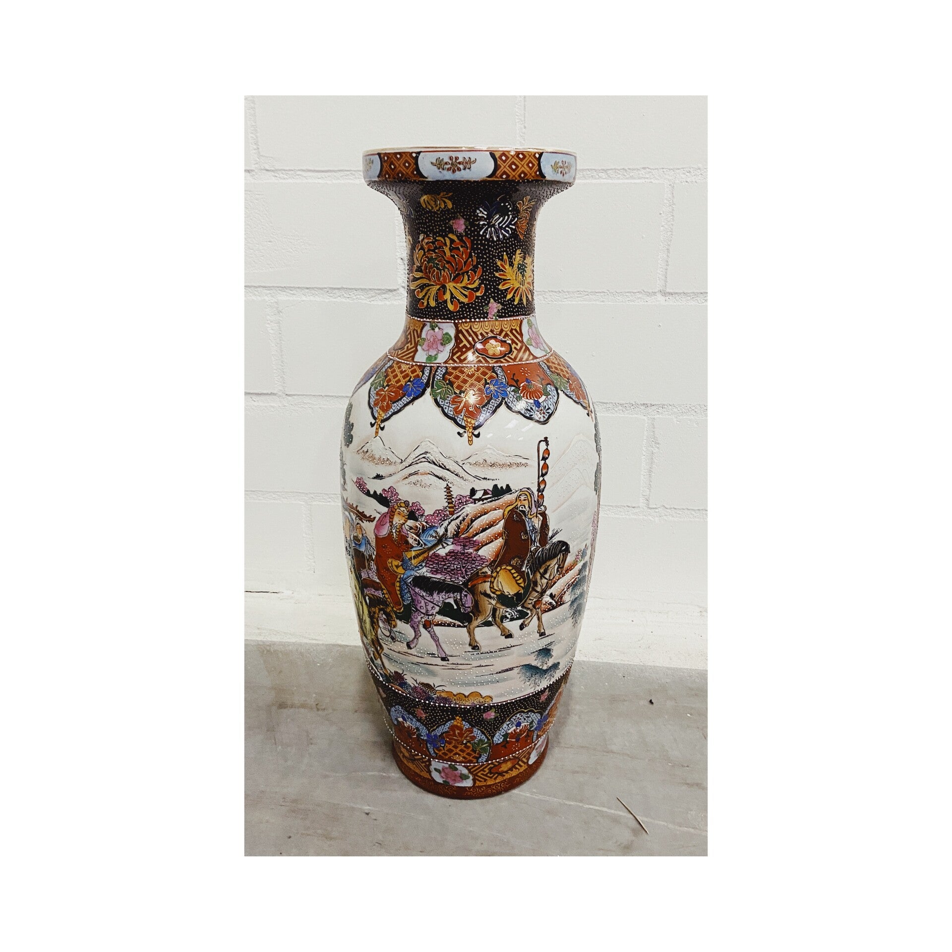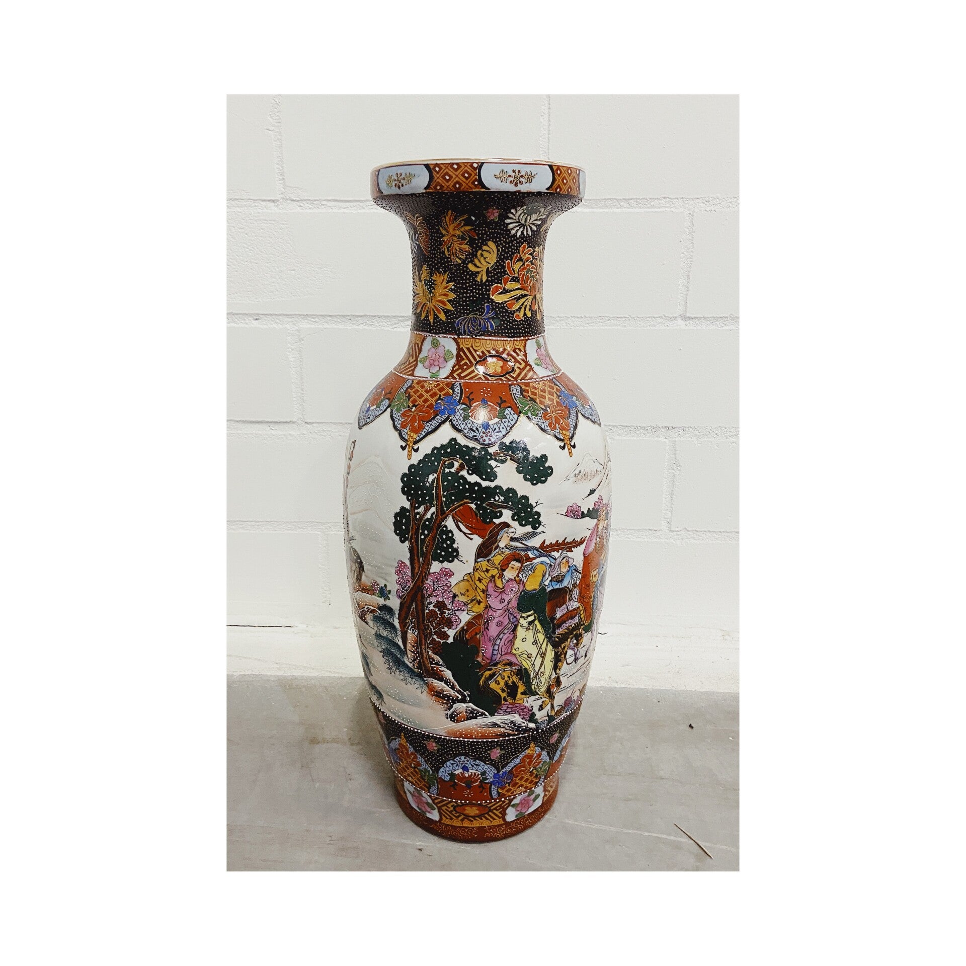 Mooie grote handgeschilderde Chinese porseleinen vaas. De vrolijke kleuren en beschilderingen maken deze vaas een aanwinst voor je interieur. De vaas verkeert in goede vintage staat.