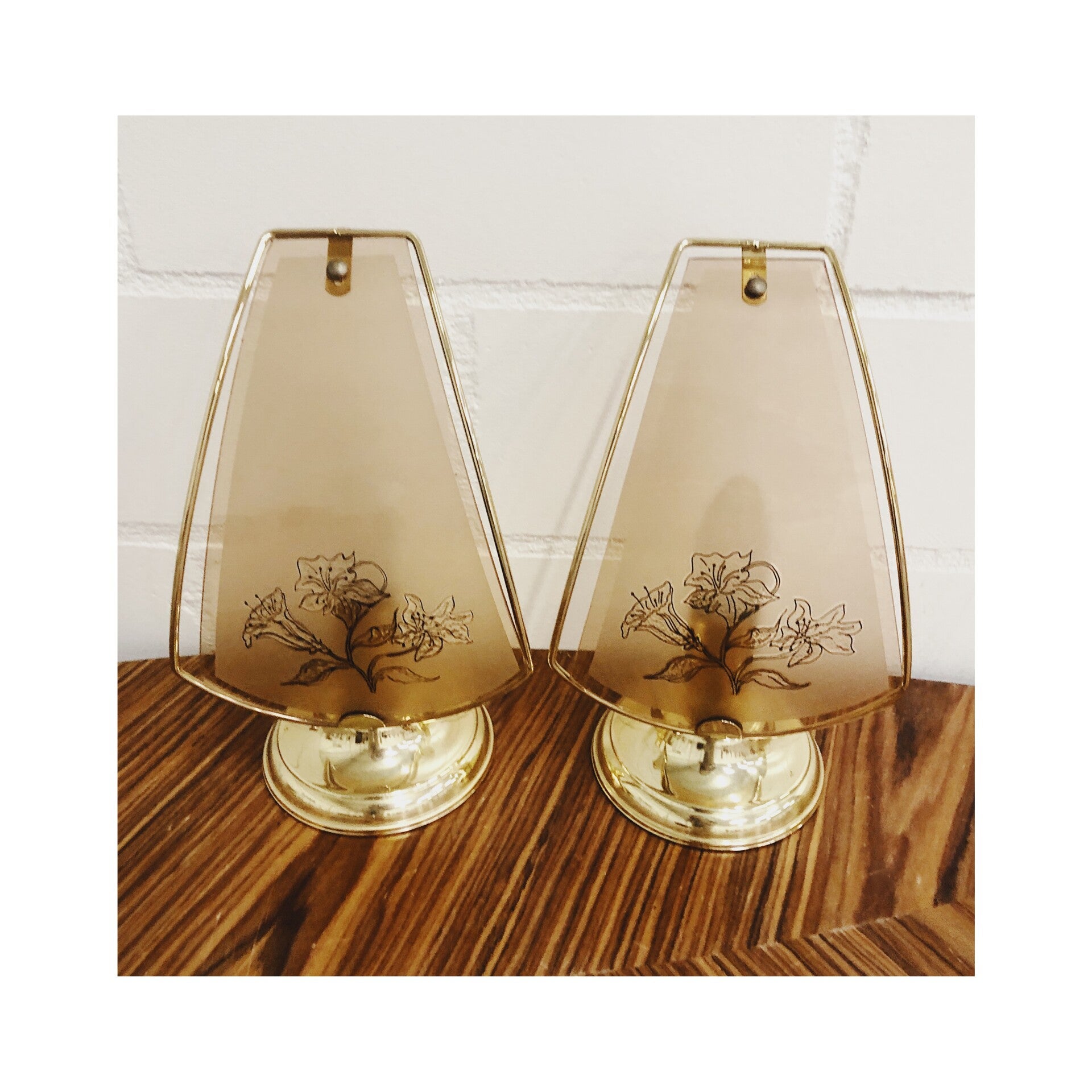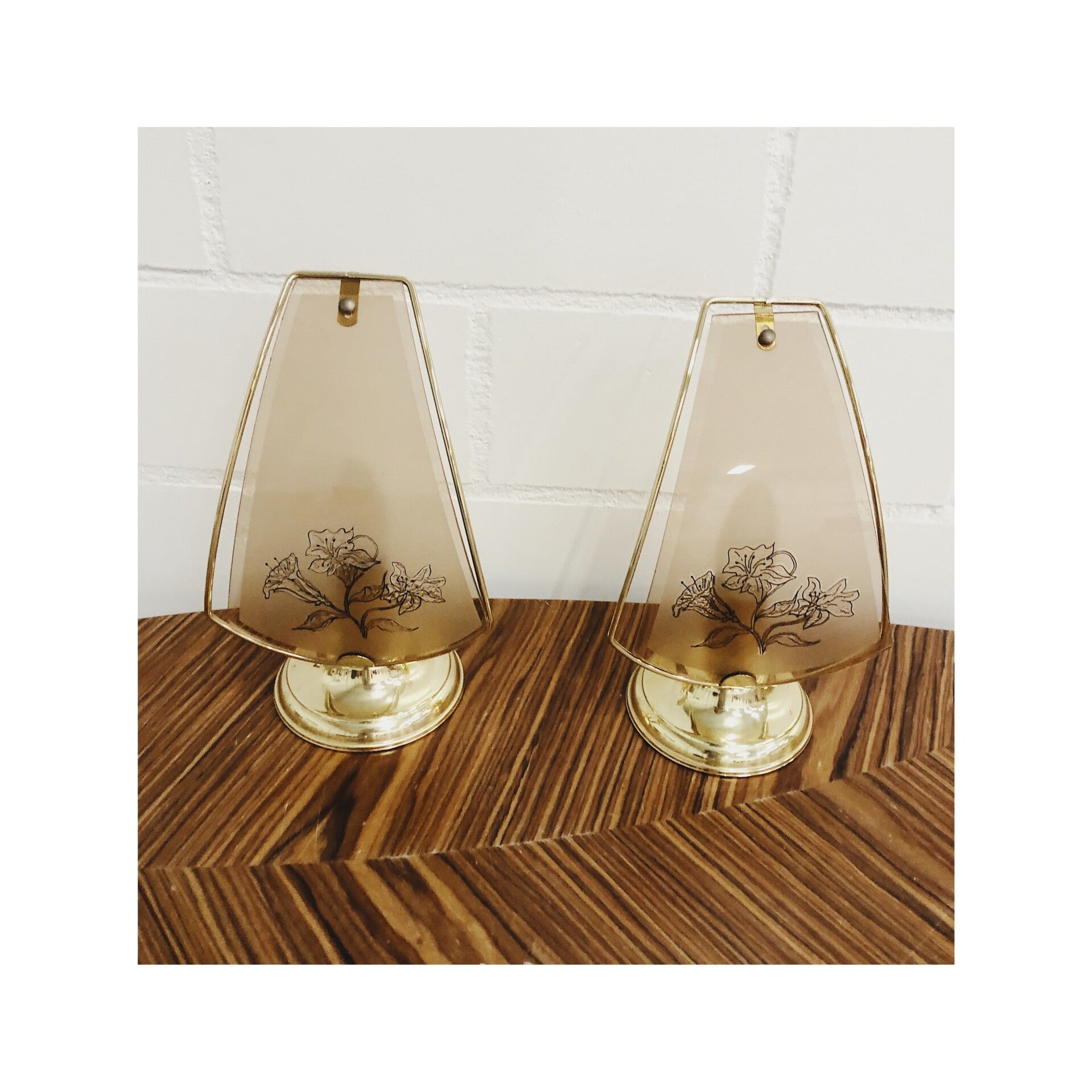 Twee messing Hollywood Regency lampjes in perfecte staat. De leeslampjes hebben beide een kap van glas met mooie bloemen. De voet is van metaal en goud verchroomd. De lampjes zijn ideaal voor op een nachtkastje. De prijs is per stuk! We hebben er nog ééntje beschikbaar!
