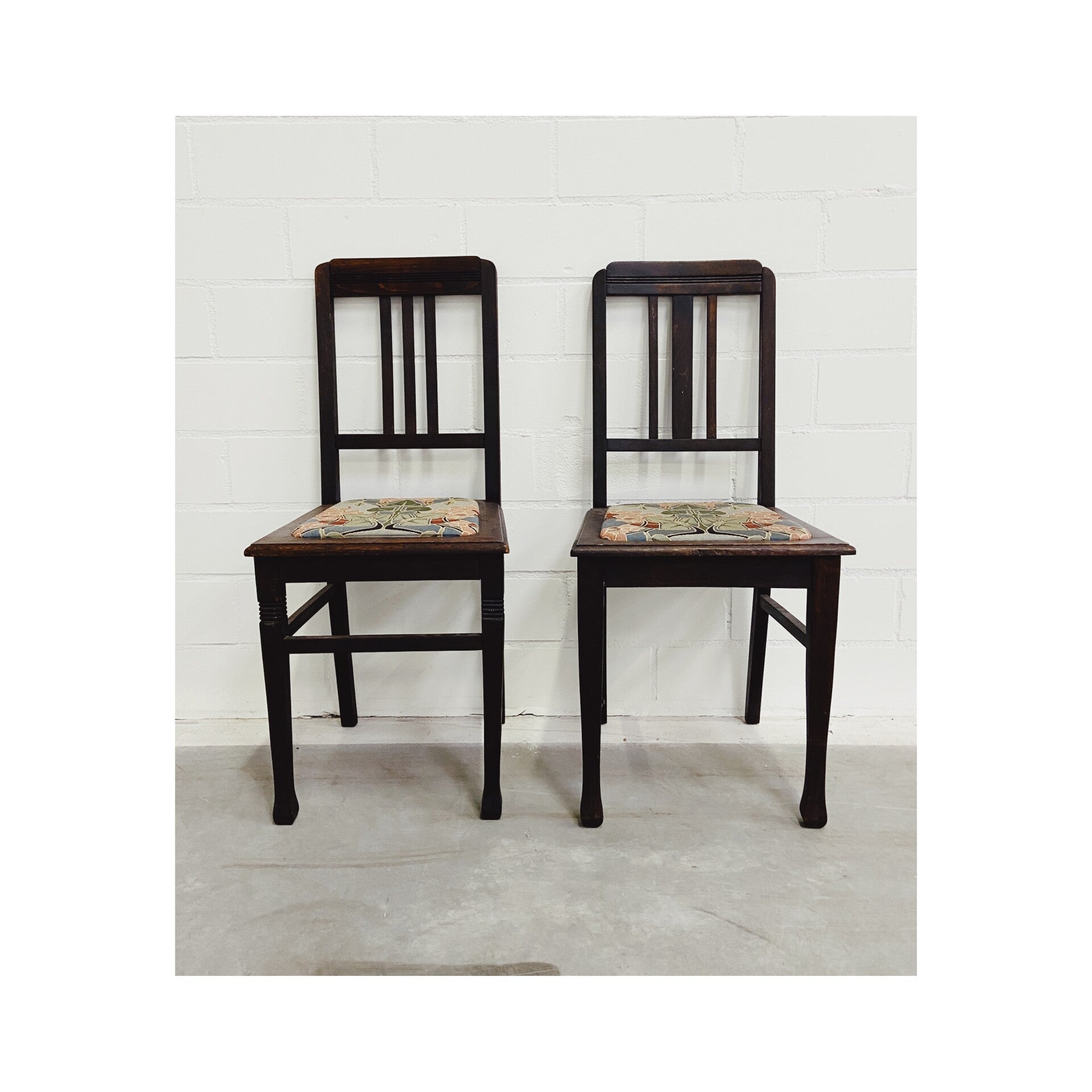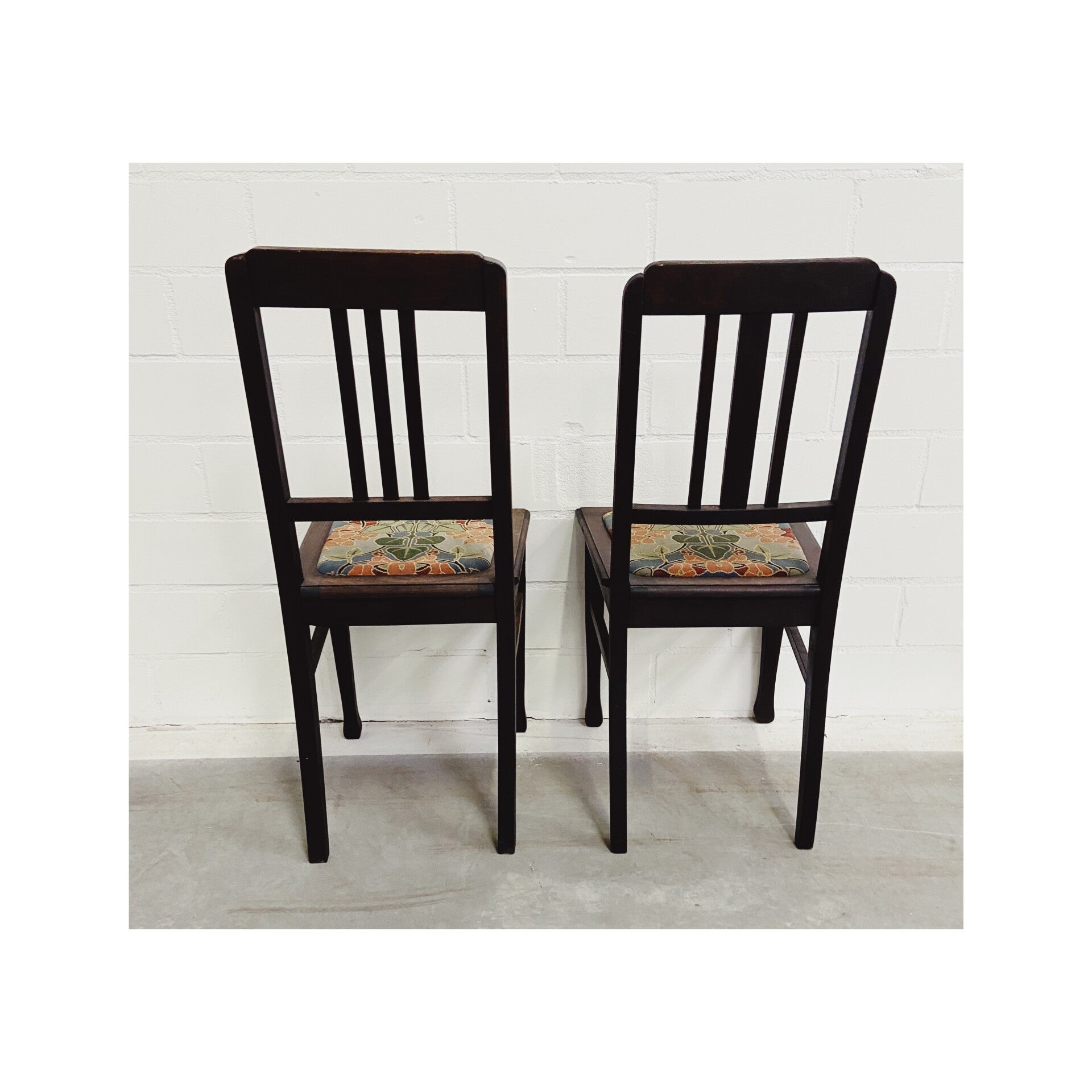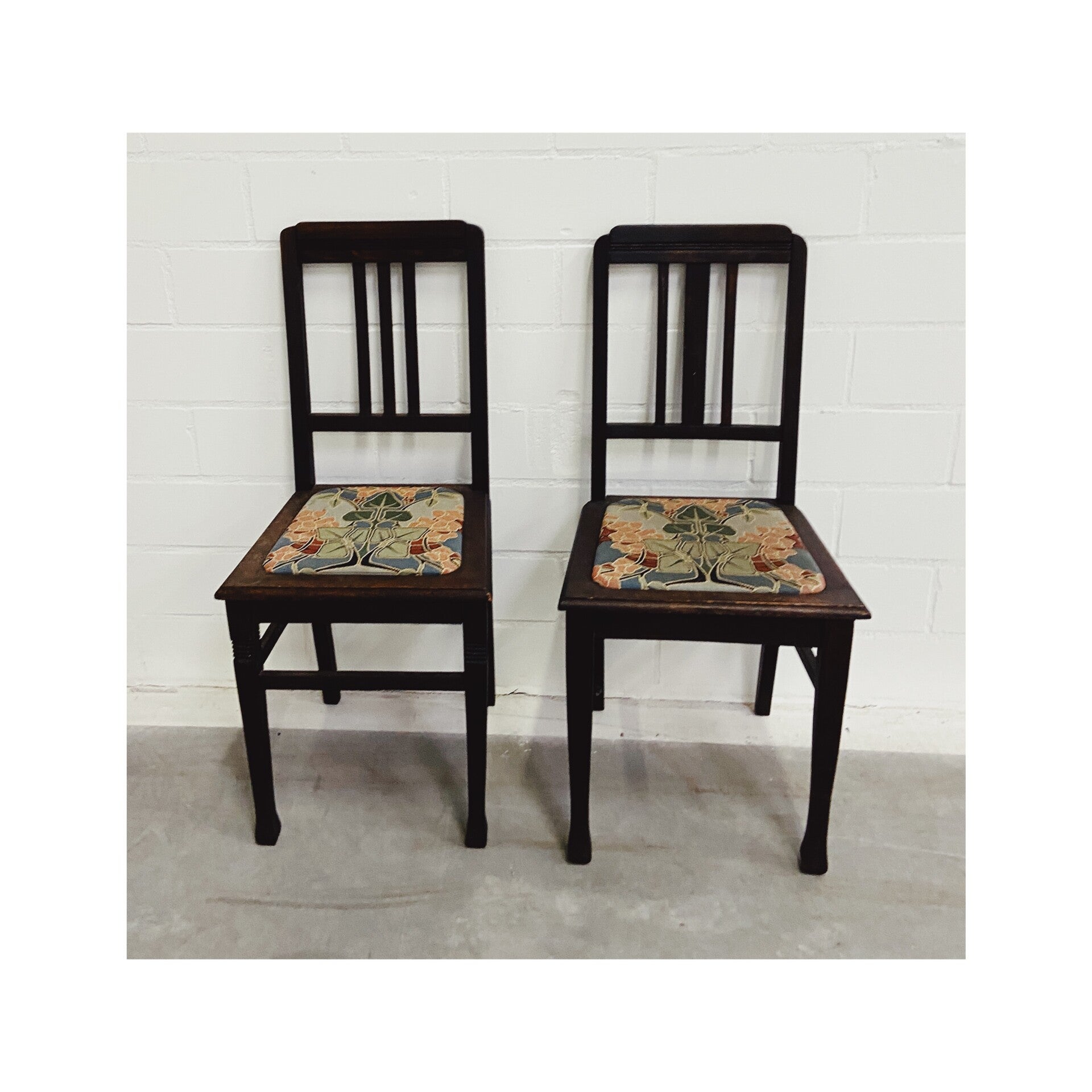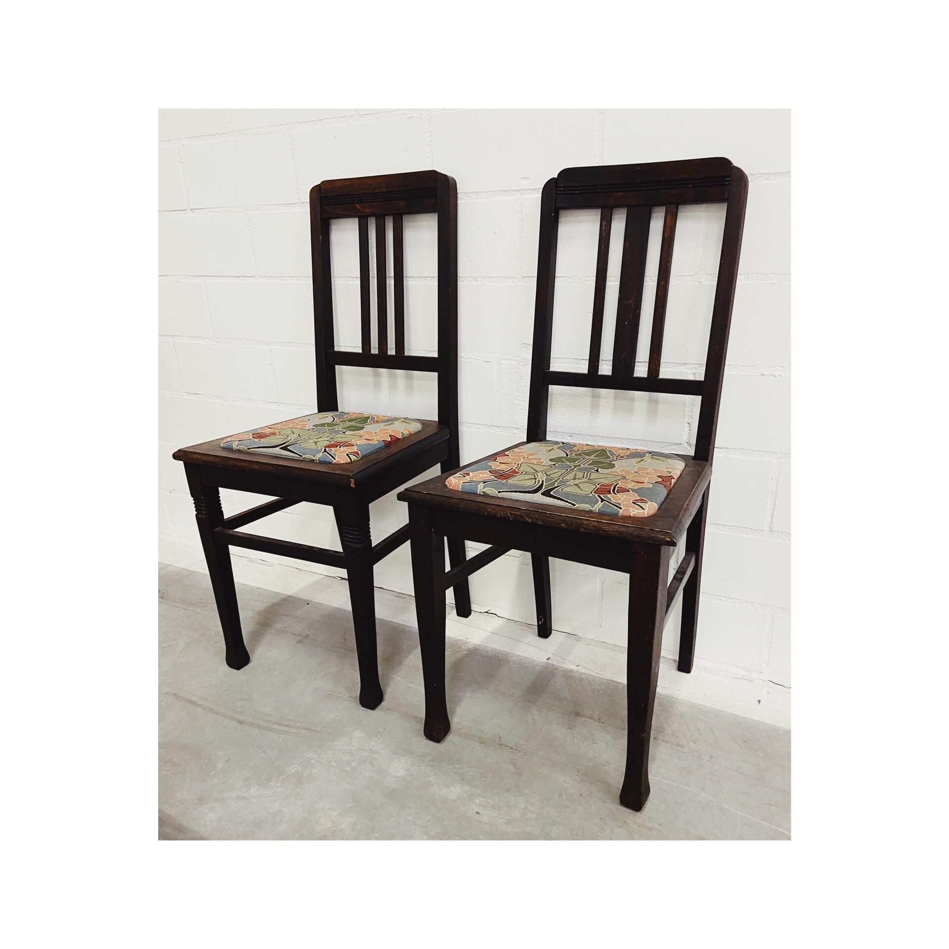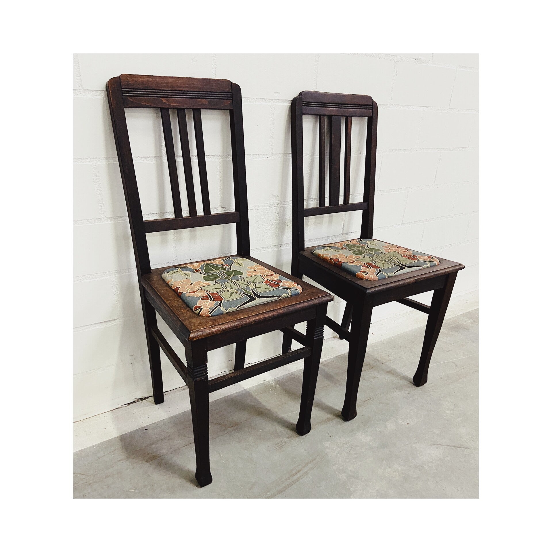 Mooie eetkamerstoelen gestoffeerd met een retro bloemenprint. De beukenhouten stoelen zijn in perfecte staat. De zitvlakken zitten los in het onderstel en kunnen dus makkelijk naar eigen wens anders gestoffeerd worden. De stoelen zijn in top conditie en ideaal voor de wat kleinere eettafels.