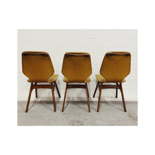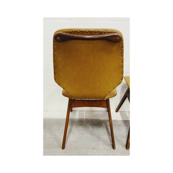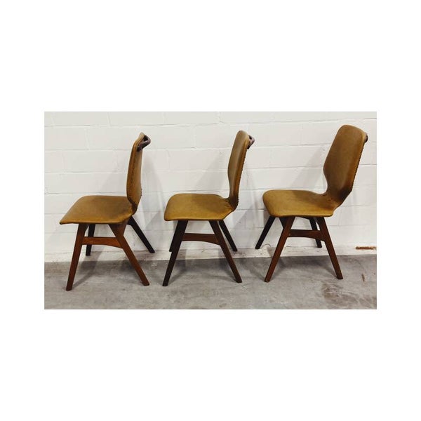 Set van drie eetkamerstoelen. De stoelen hebben een comfortabele kunstlederen zitting met op het zitvlak een knoopdecoratie. De stoelen hebben allen een handgreep en metalen knopjes aan de achterkant. De stoelen hebben wat gebruikssporen maar zijn verder nog in prima staat. De stoelen worden per stuk verkocht!