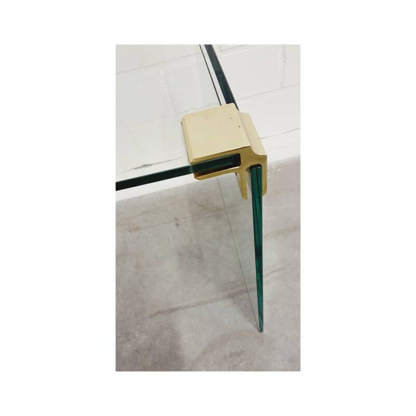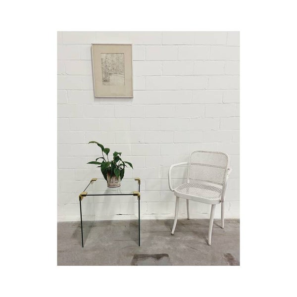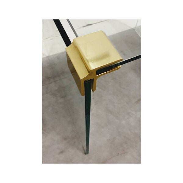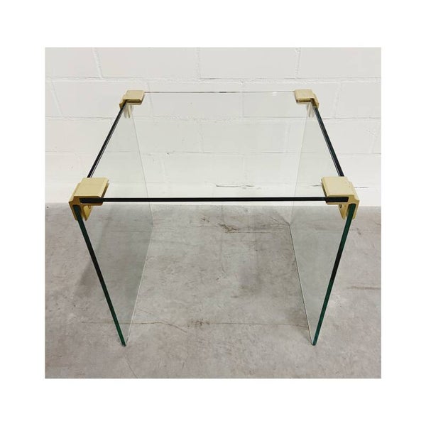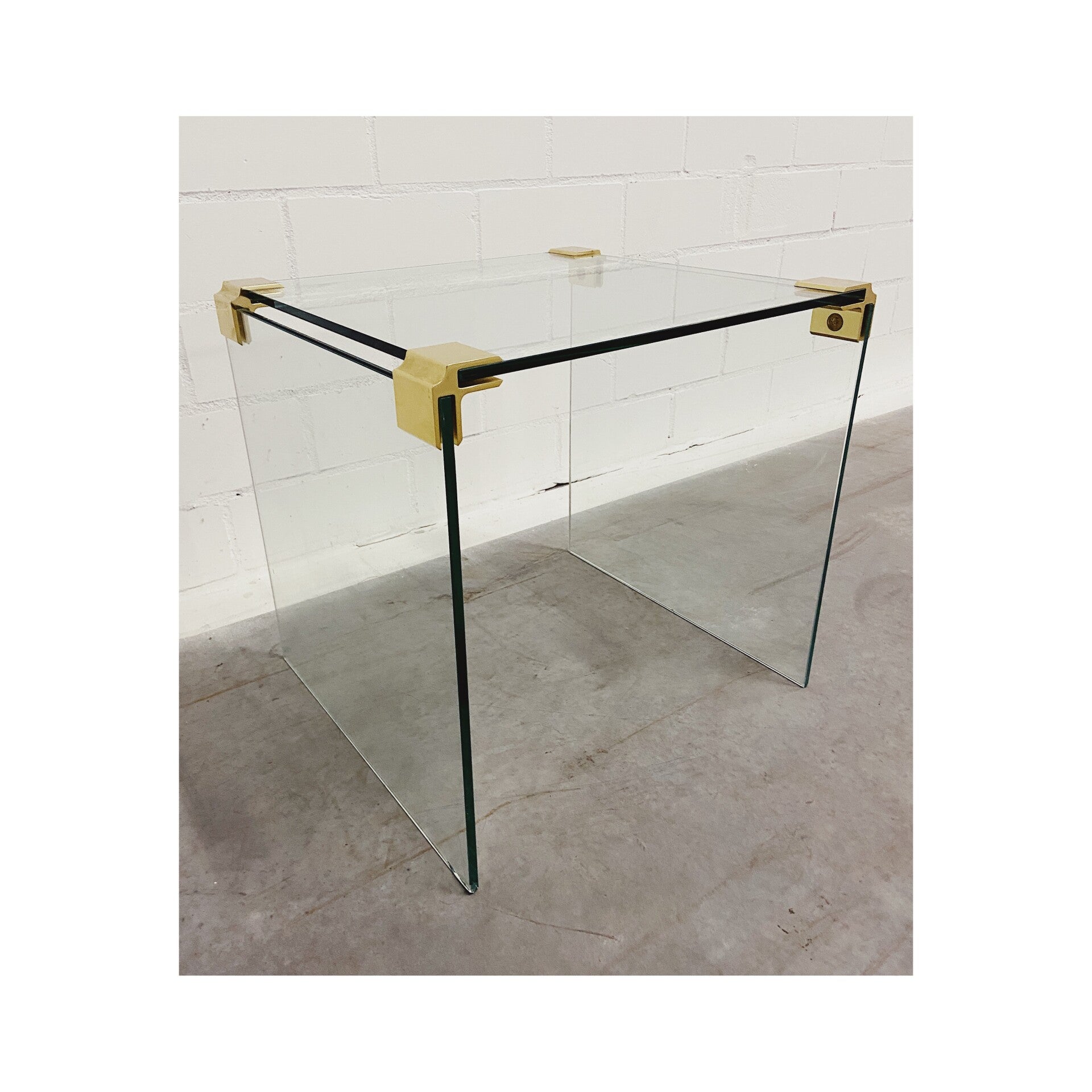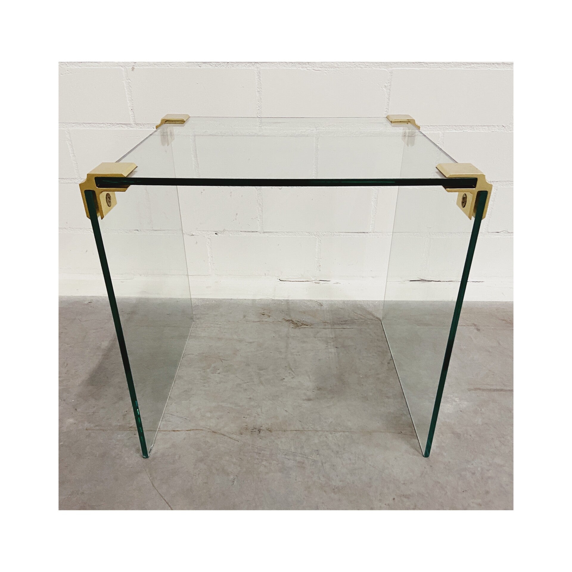 Prachtig Hollywood Regency bijzettafeltje van massief glas. Het tafeltje heeft een prachtige kubusvorm. De glazen zijn verbonden door gouden brass details. Het bijzetmeubel is van gehard zwaar glas en is in goede staat. Er mist enkel een klein chipje aan de onderkant van het glas. Verder is het tafeltje in prima vintage staat!
