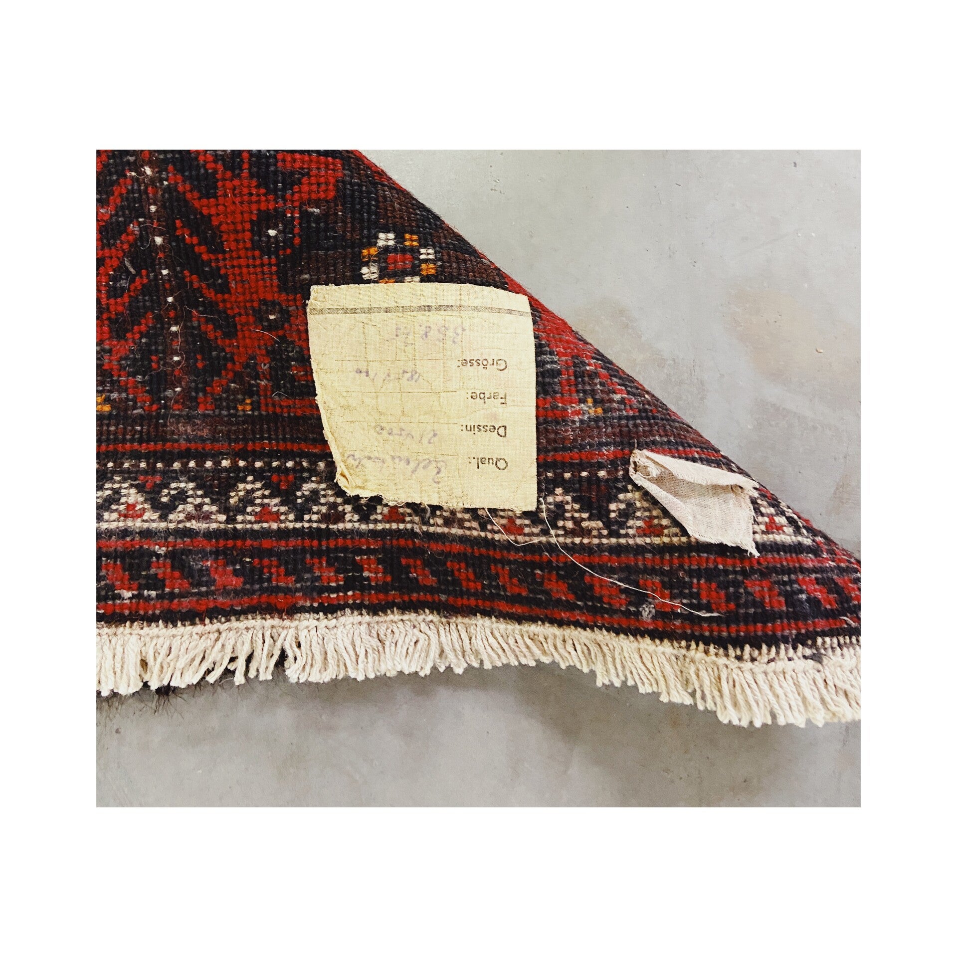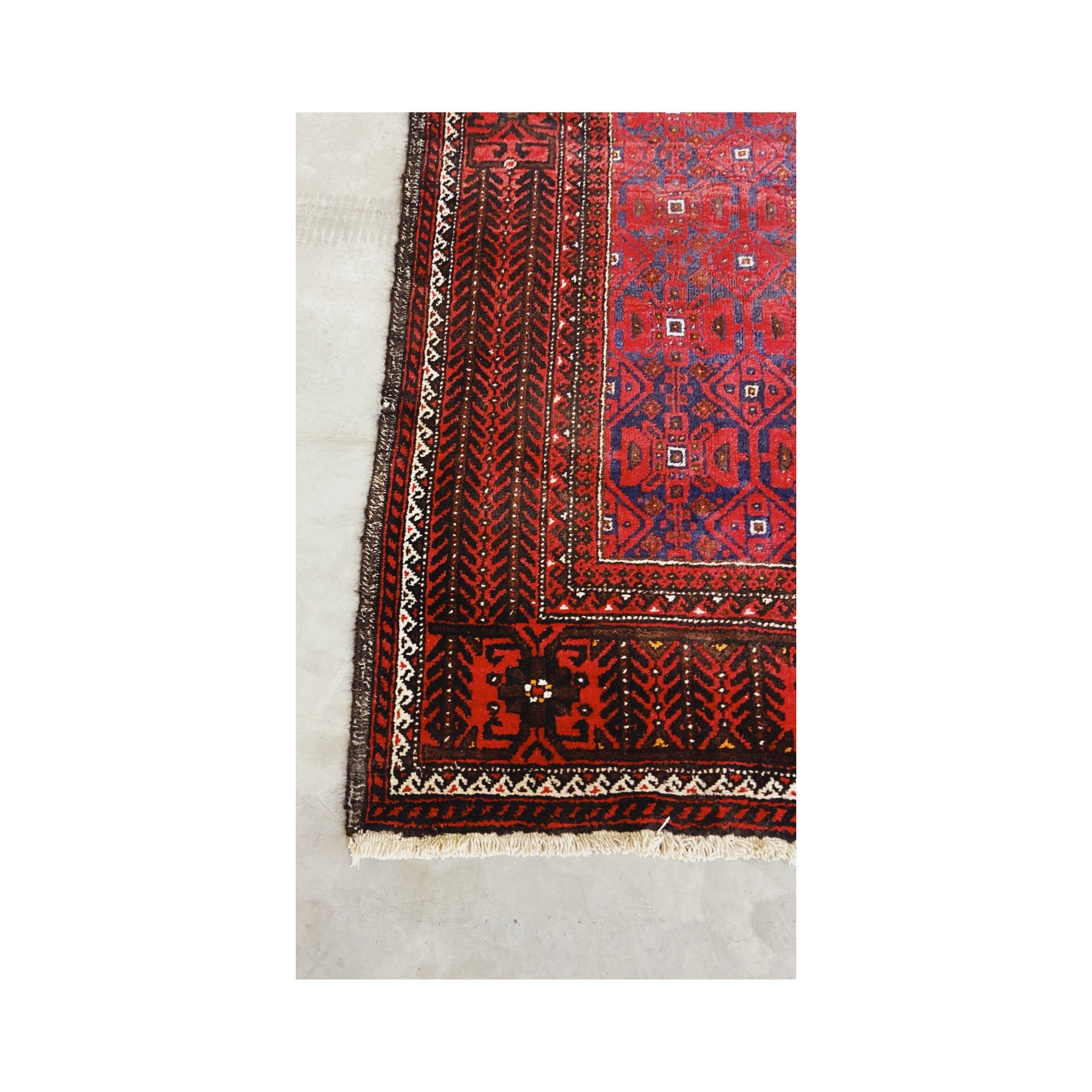 Prachtig Perzisch vloerkleed. Het Hamadan tapijt wordt geknoopt in 500-600 dorpen in een gebied rond de stad Hamadan in het noordwesten van Perzië. Ieder dorp of groep van dorpen onderscheidt zich op zijn eigen wijze. Het tapijt heeft prachtige geometrische vormen en mooie donkerblauw en rode kleuren. Heeft wat kleine gebruikssporen, waaronder een klein scheurtje aan de zijkant (die bijna niet opvalt), maar is in het algemeen in goede staat!