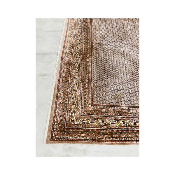 Prachtig groot Indiaase Mir kleed. Een Mir tapijt is te herkennen aan de zogenoemde Boteh figuurtjes. Boteh is een Perzisch woord en betekent “een kluster bladeren”. Deze naam kan je koppelen aan het decoratief patroon op het tapijt. Indiaase mir tapijten zijn onderdeel van een eeuwenoude Indiase traditie. Het tapijt is groot en vierkant en is kwa wol in top conditie. Wel heeft het kleed wat zichtbare licht- en donker werking. Zie de foto's voor meer details.