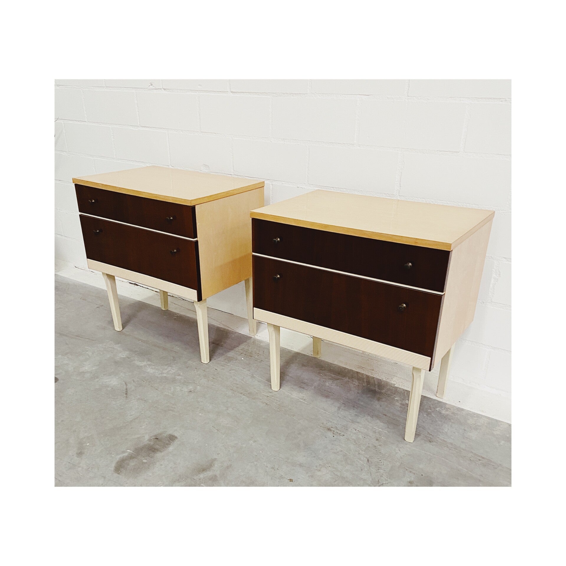 Prachtige vintage 50/60's nachtkastjes set. De kastjes zijn voorzien van twee laden met messing knopjes. De kastjes staan op unieke witte pootjes. Naast enkele kleine gebruikssporen is deze set in top staat. Ideaal als set voor de slaapkamer.