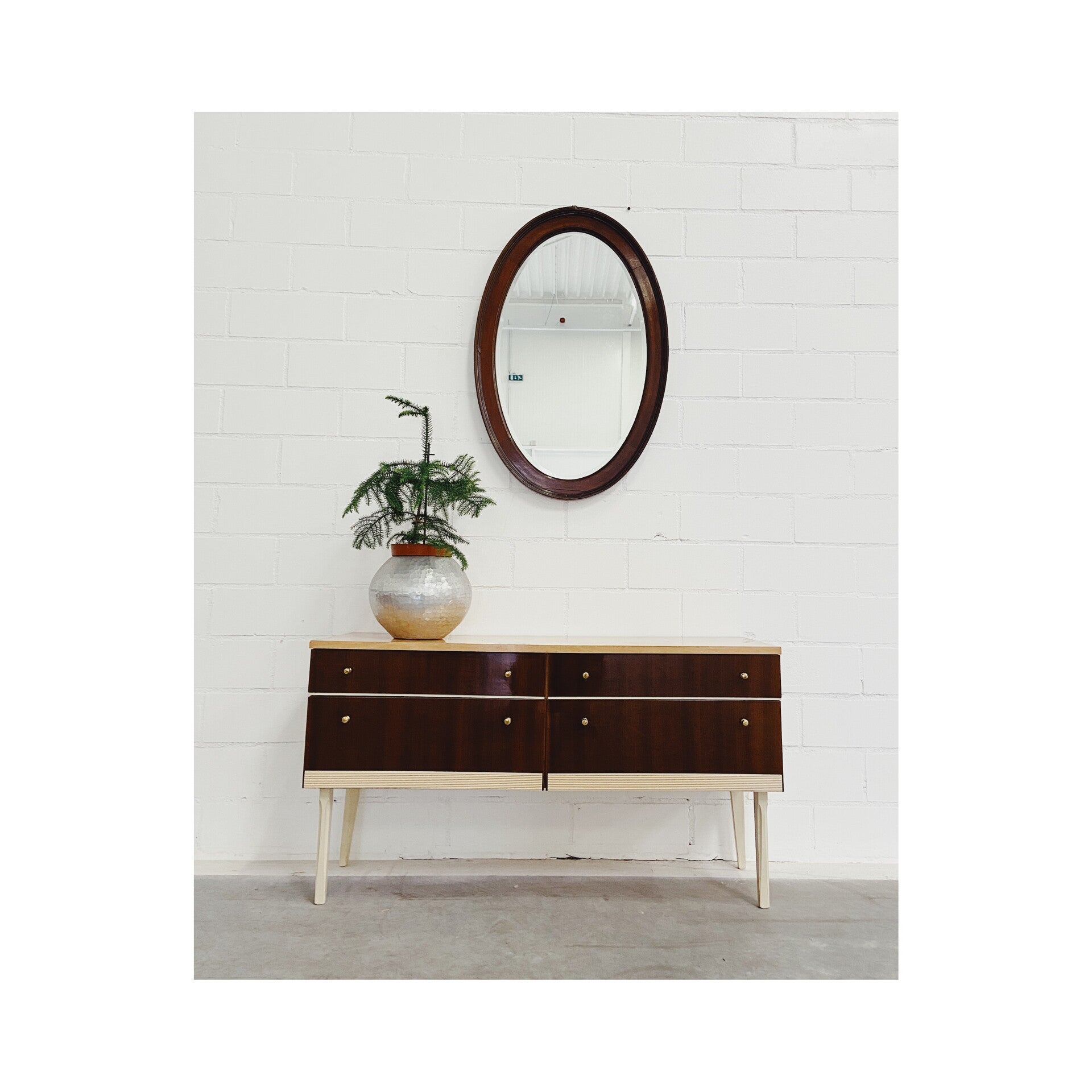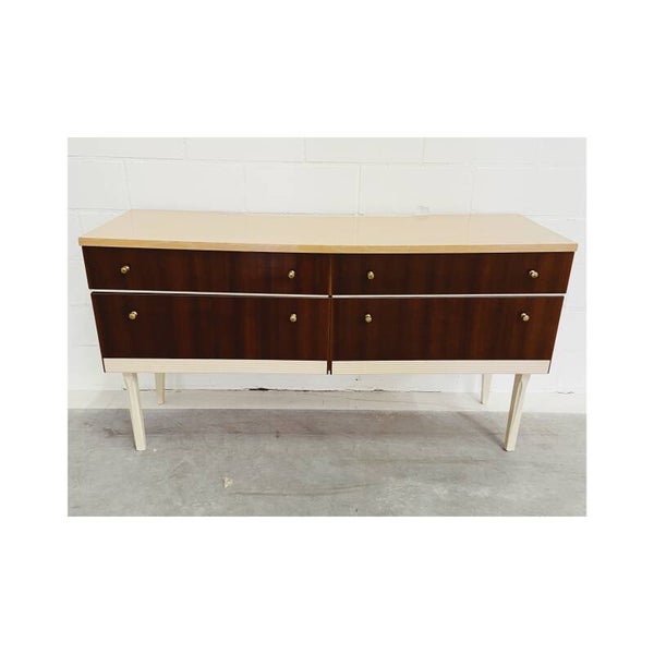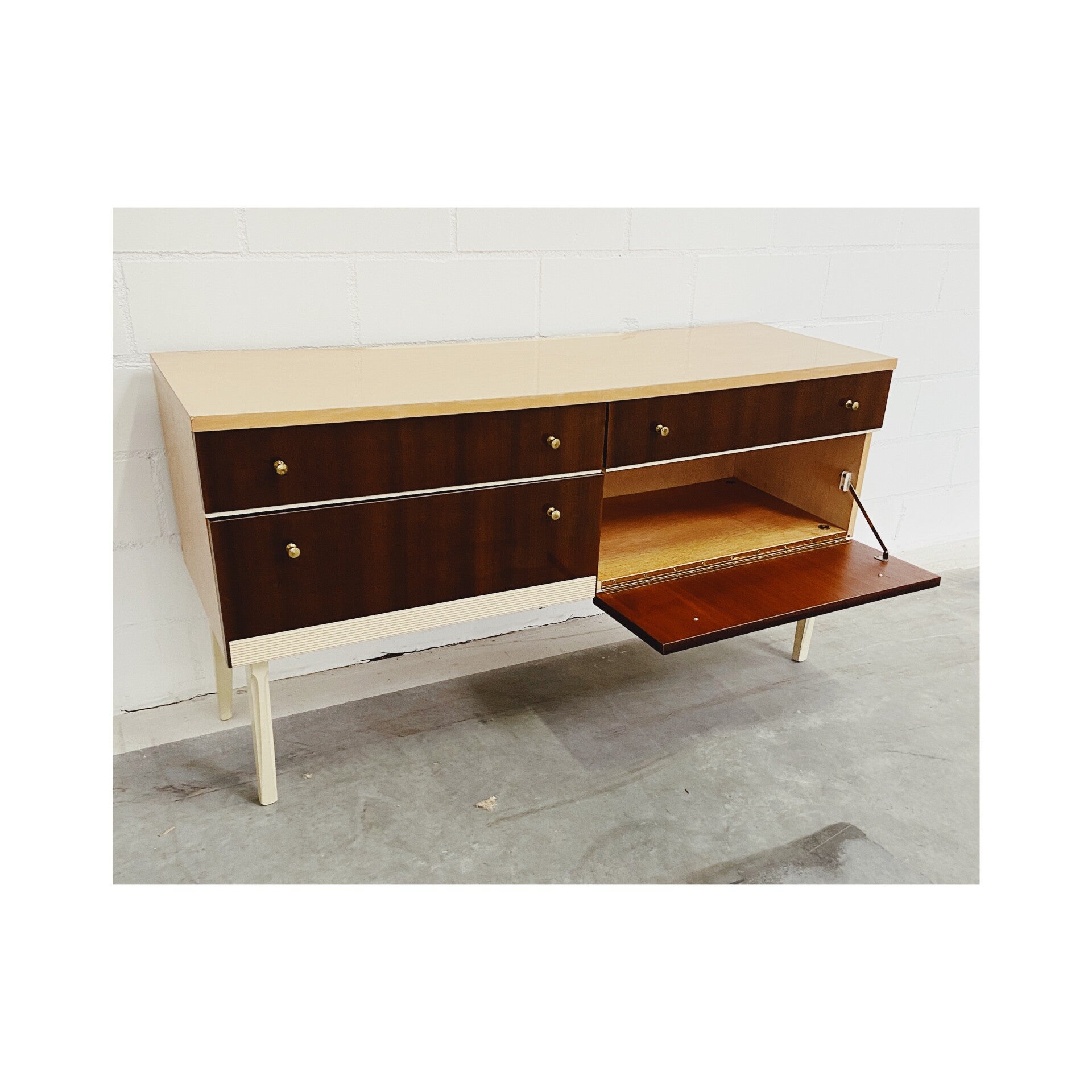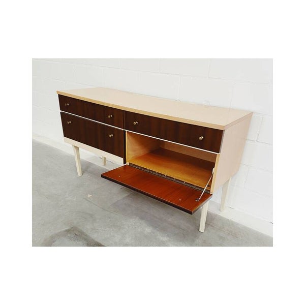 Prachtig retro dressoir / tv meubel. Het dressoir is in zeer goede staat en heeft een bijzondere jaren '50 look. Het vintage dressoir is perfect voor in de woonkamer en ook goed te gebruiken als tv meubel. Het kastje heeft twee klepdeuren en twee opbergladen die elk worden afgesloten met een unieke messing knop. Het dressoir heeft een lade die een klein beetje schuin staat. (check foto's voor details)