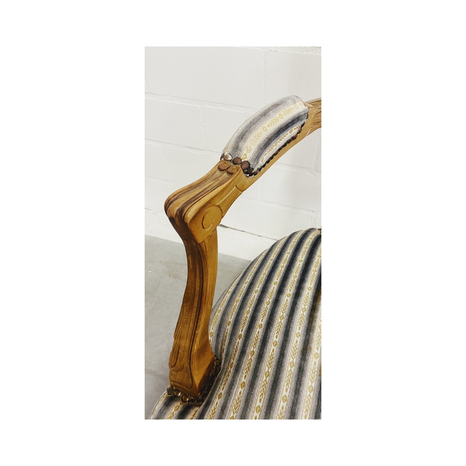 Prachtige armstoel van beukenhout bekleed met gestreept velours. Deze Louis XIV stoel zal een echte eye-catcher in je interieur zijn. Het beukenhout heeft prachtige uitgesneden bloemmotieven. De stoel is in enorm goede staat.