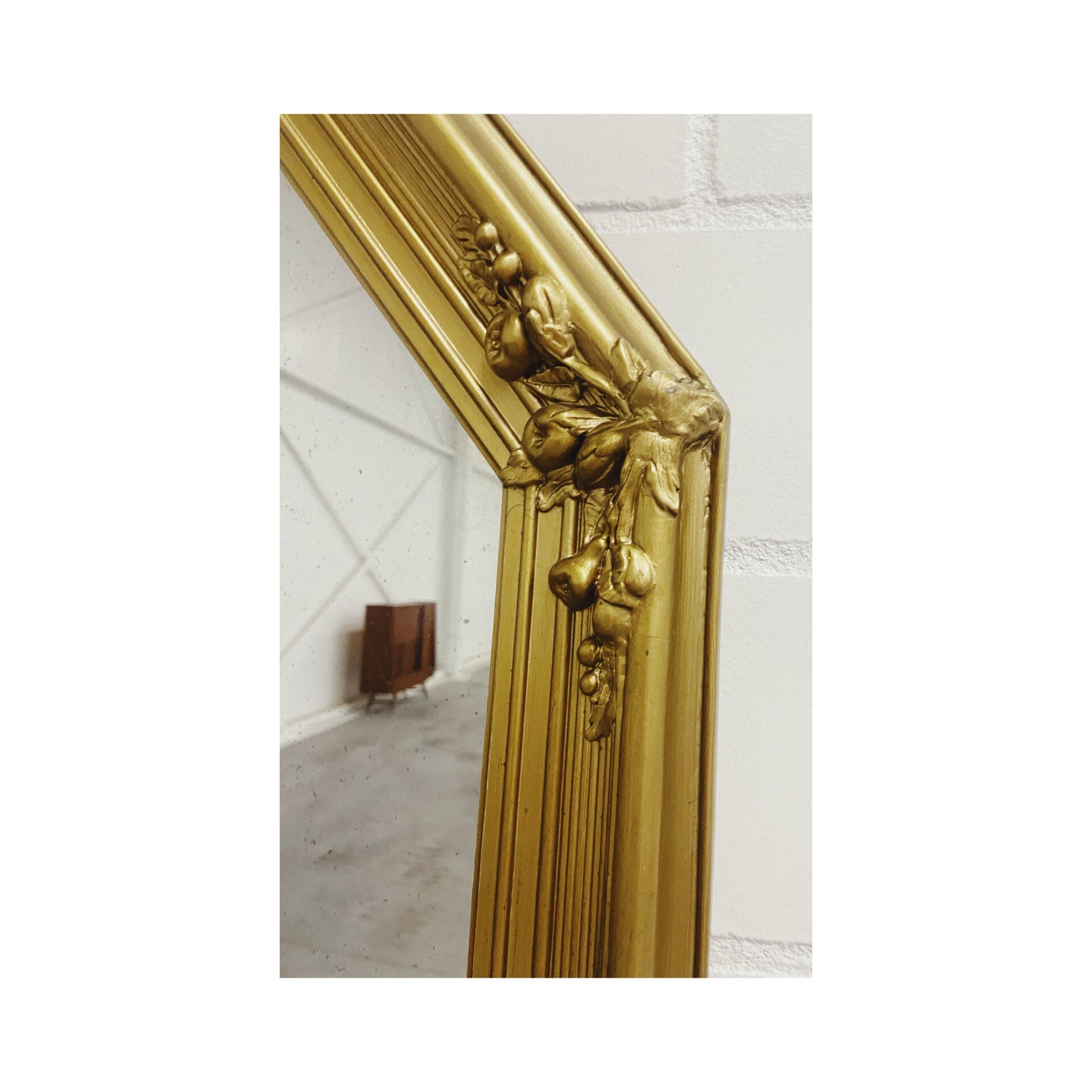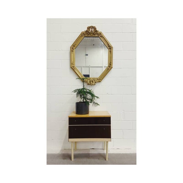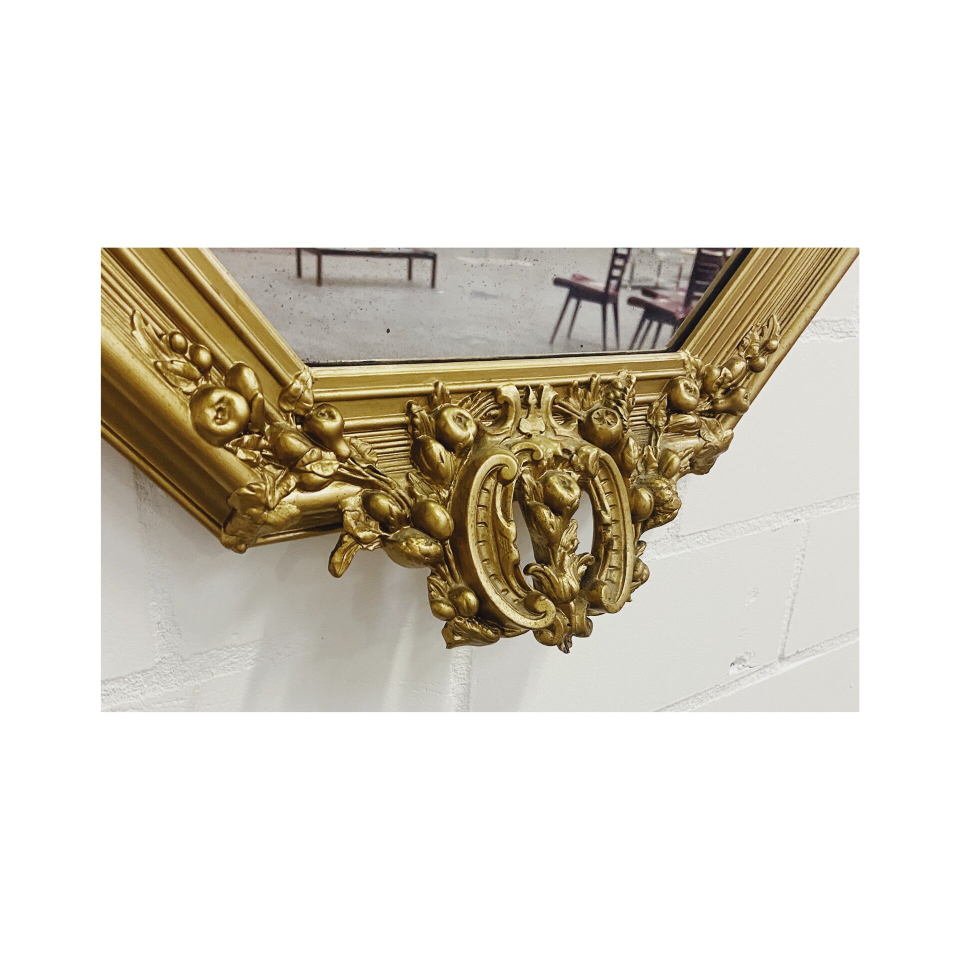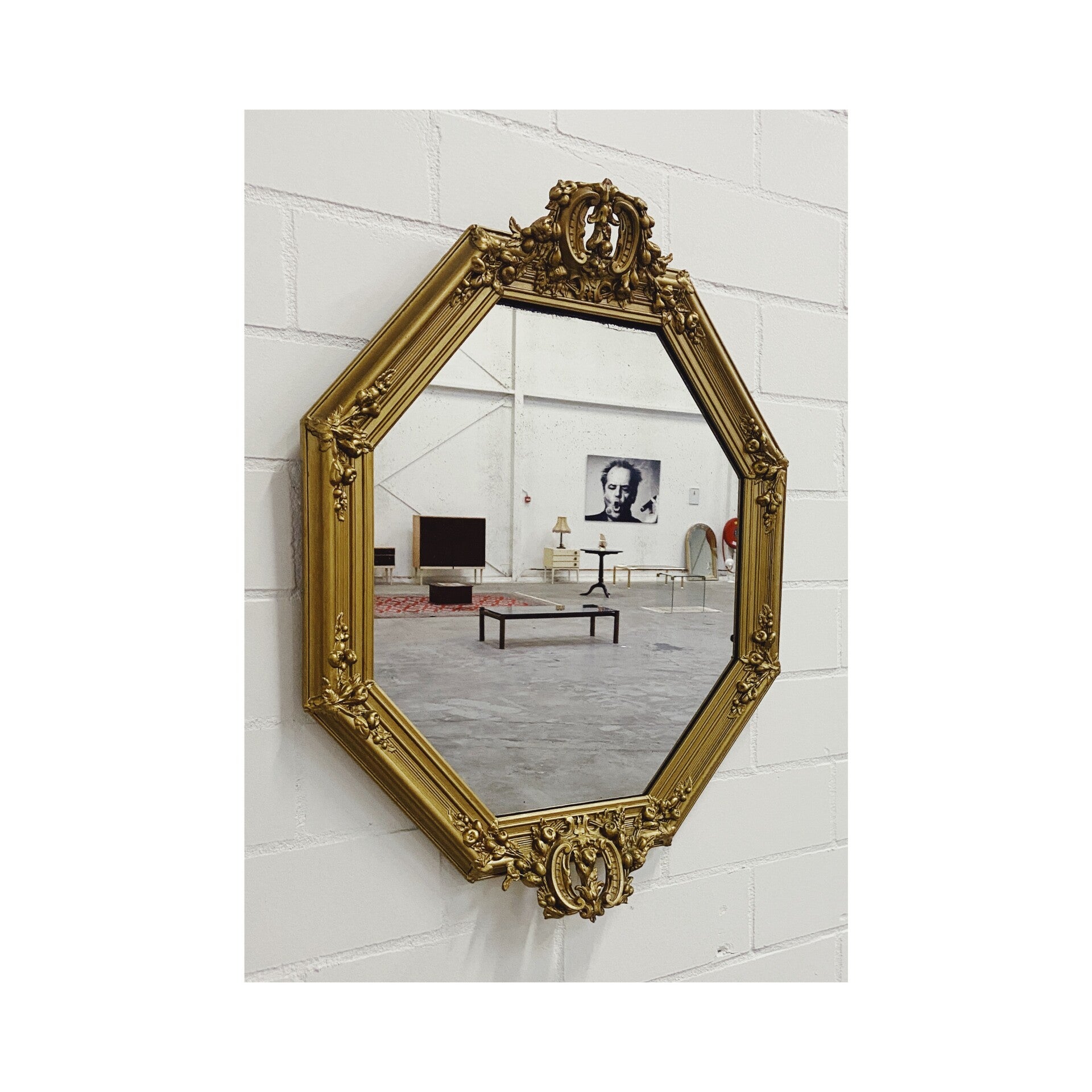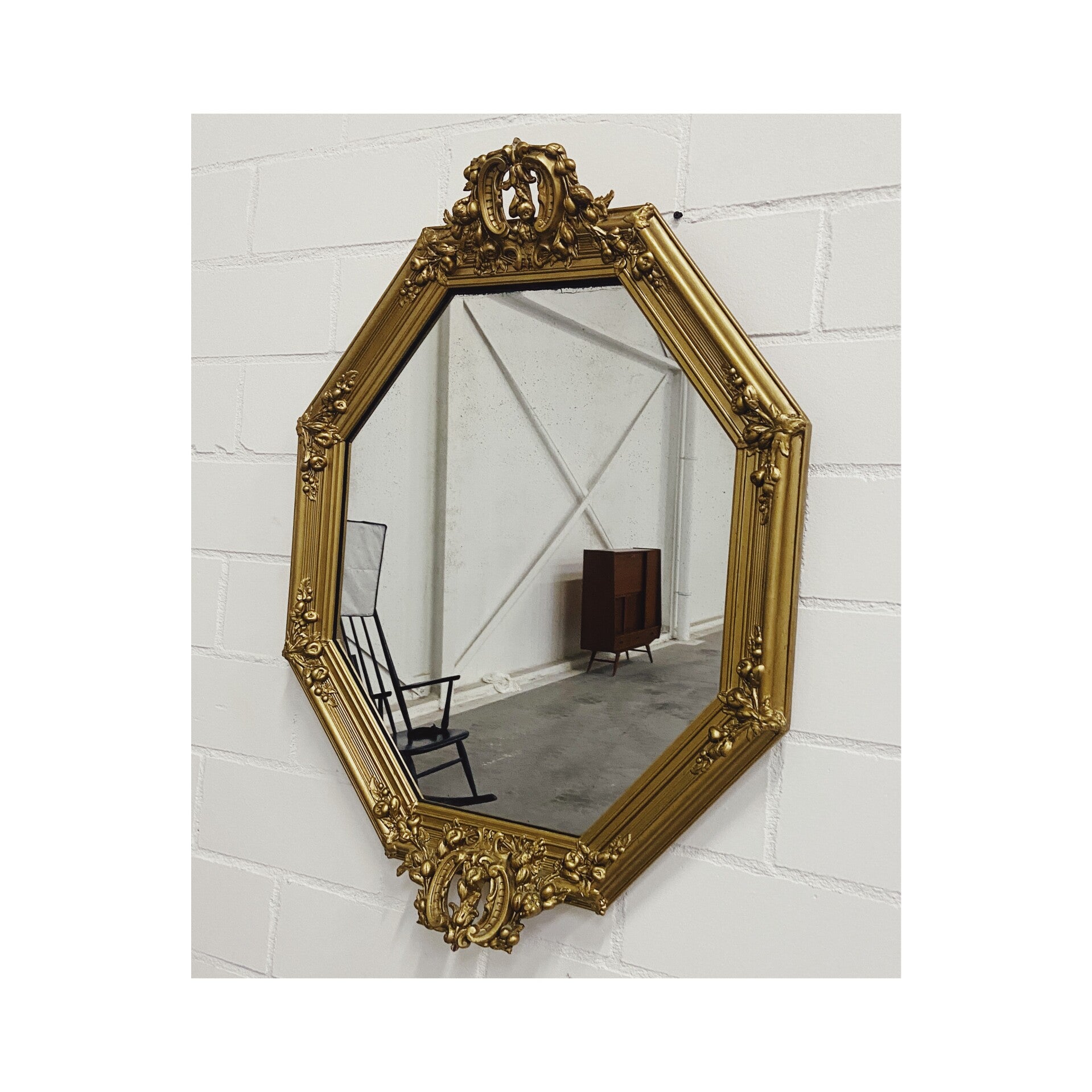 Klassieke spiegel met decoratief gouden frame. De achthoekige spiegel heeft een prachtige lijst met boven en beneden een sierlijke kuif. De spiegel heeft enkele ouderdomsplekjes op het spiegelglas maar is verder in goede staat.