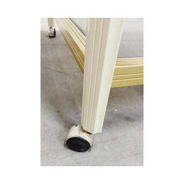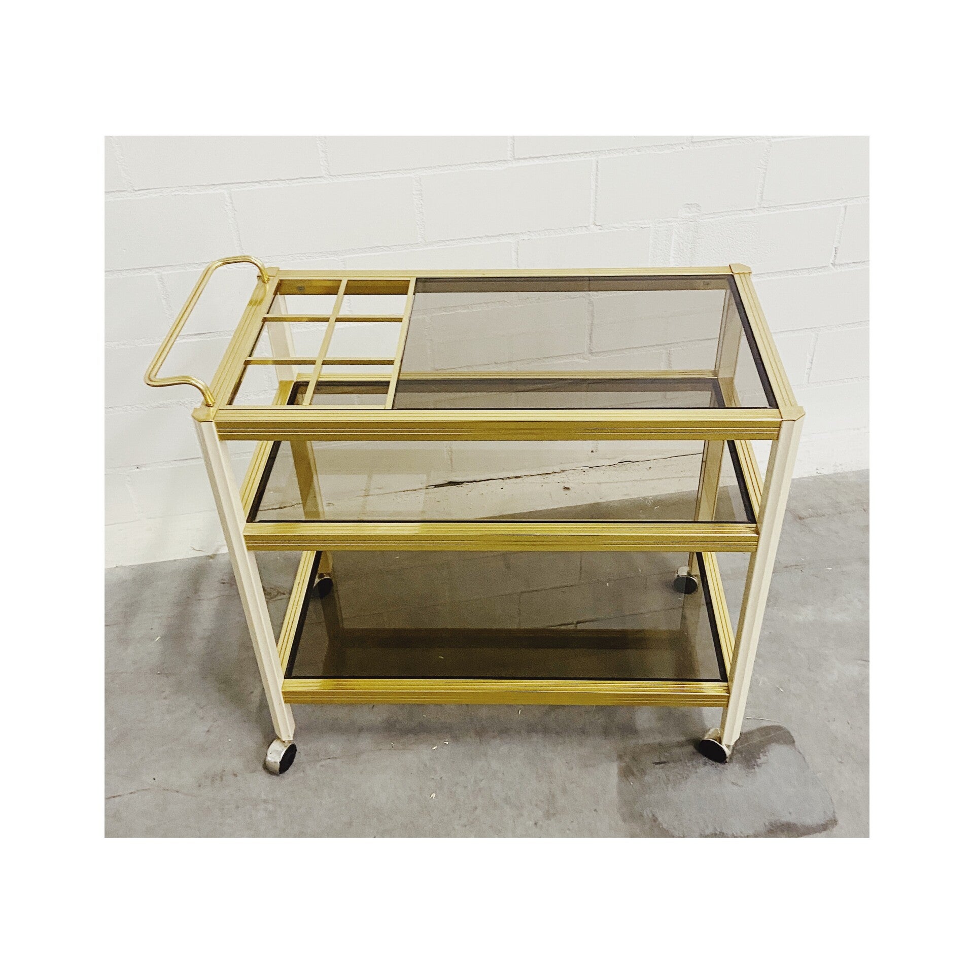 Prachtig strak vormgegeven bar-cart. De rechthoekige trolley bied ruimte voor 4 flessen, die elk in een eigen vak geplaatst kunnen worden. De serveerwagen heeft drie verdiepingen elk met een rookglazen blad. De wielen zijn van kunststof en werken nog goed. De bar-cart ziet er nog fantstisch uit.
