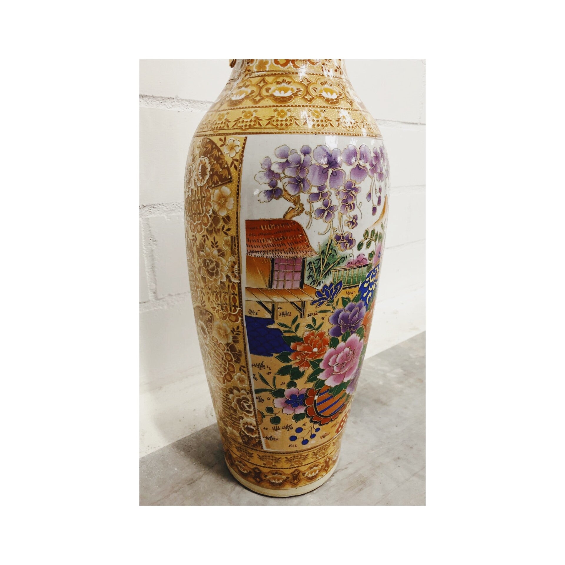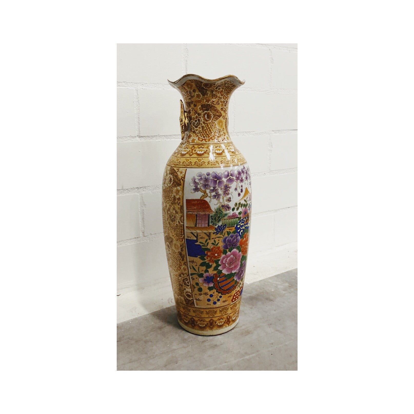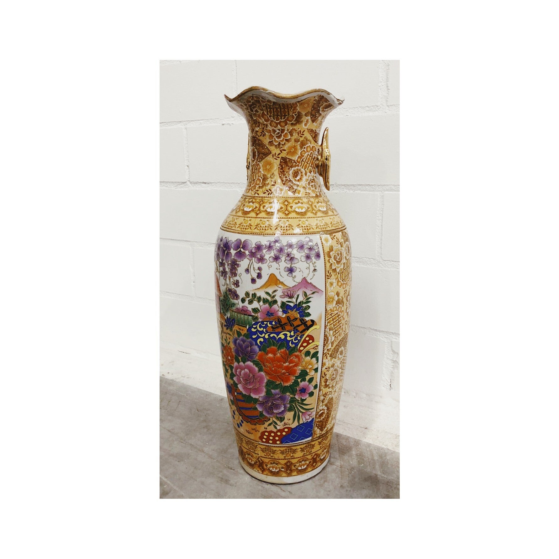 Prachtige Vintage Chinese vaas in heldere kleuren. De handgeschilderde vaas is voorzien van prachtige reliëf decoratie met bloem -en plantenmotieven. De vaas heeft een sierlijke schulprand en twee imponerende gouden handgrepen. De vaas is in het algemeen in goede staat, maar heeft hier en daar kleine (niet storende) sporen van slijtage.