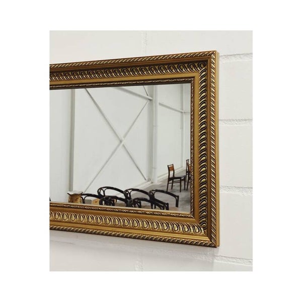 Mooie rechthoekige vintage spiegel met gouden rand. Deze prachtige spiegel kan op twee manieren staan, of opgehangen worden. De gouden vierkante lijst heeft een bijzonder geometrisch patroon. De spiegel is in goede vintage staat en heeft een ophangsysteem aan de achterzijde.