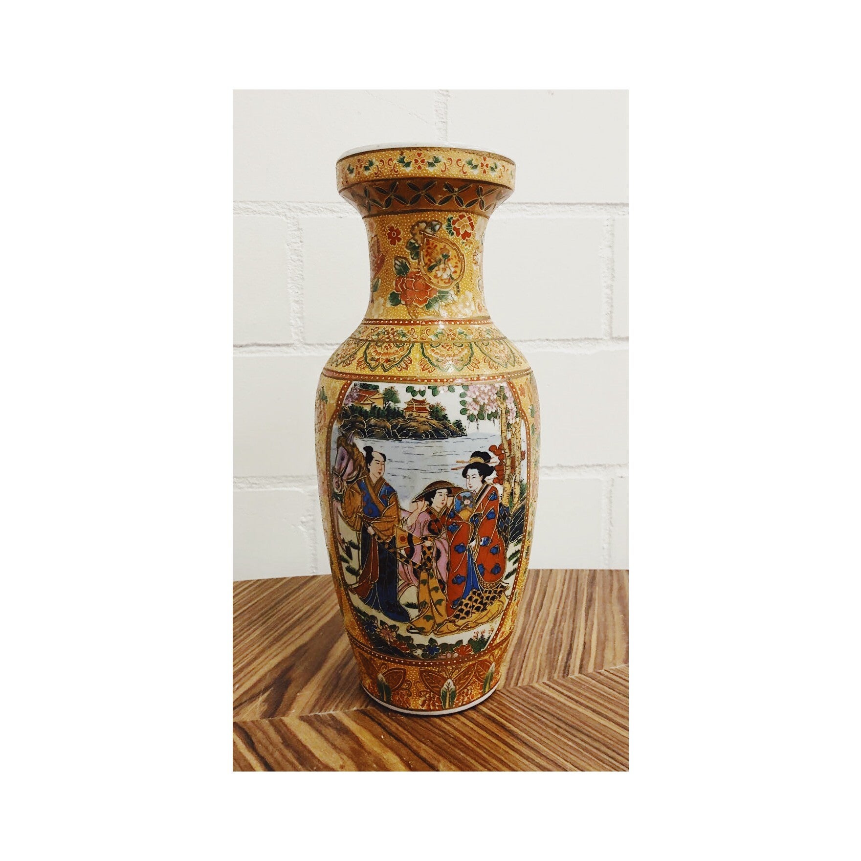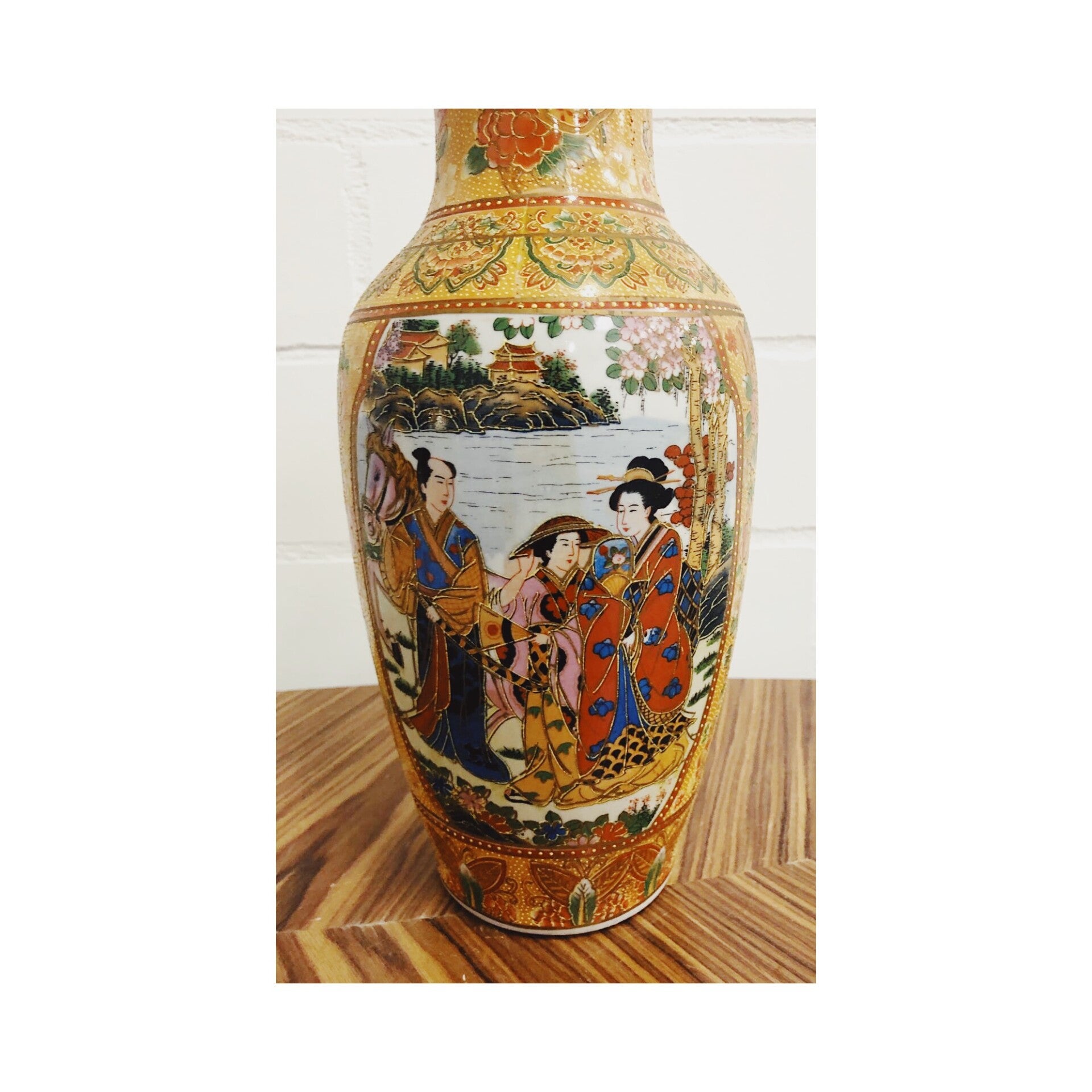 Deze unieke handbeschilderde porseleinen vaas heeft een combinatie van vrolijke kleuren. De voorstelling bestaat uit een samenspel van planten en bloemen en tafereel van mensen. De achtergrond van de vaas is op een mooie manier verrijkt met een stippen-reliëf decoratie. De vaas in is goede vintage conditie.