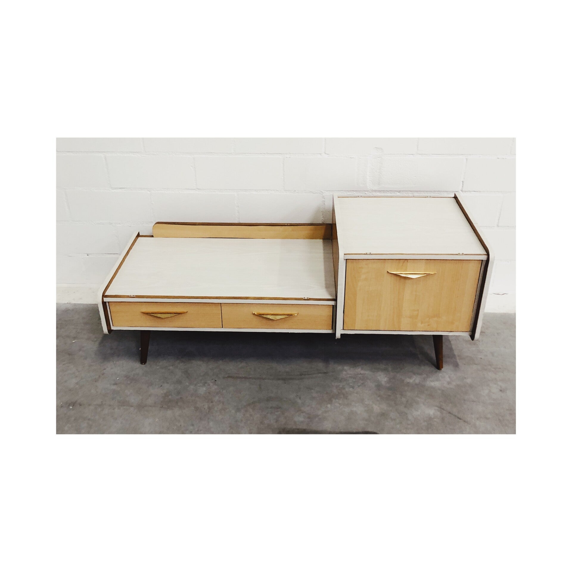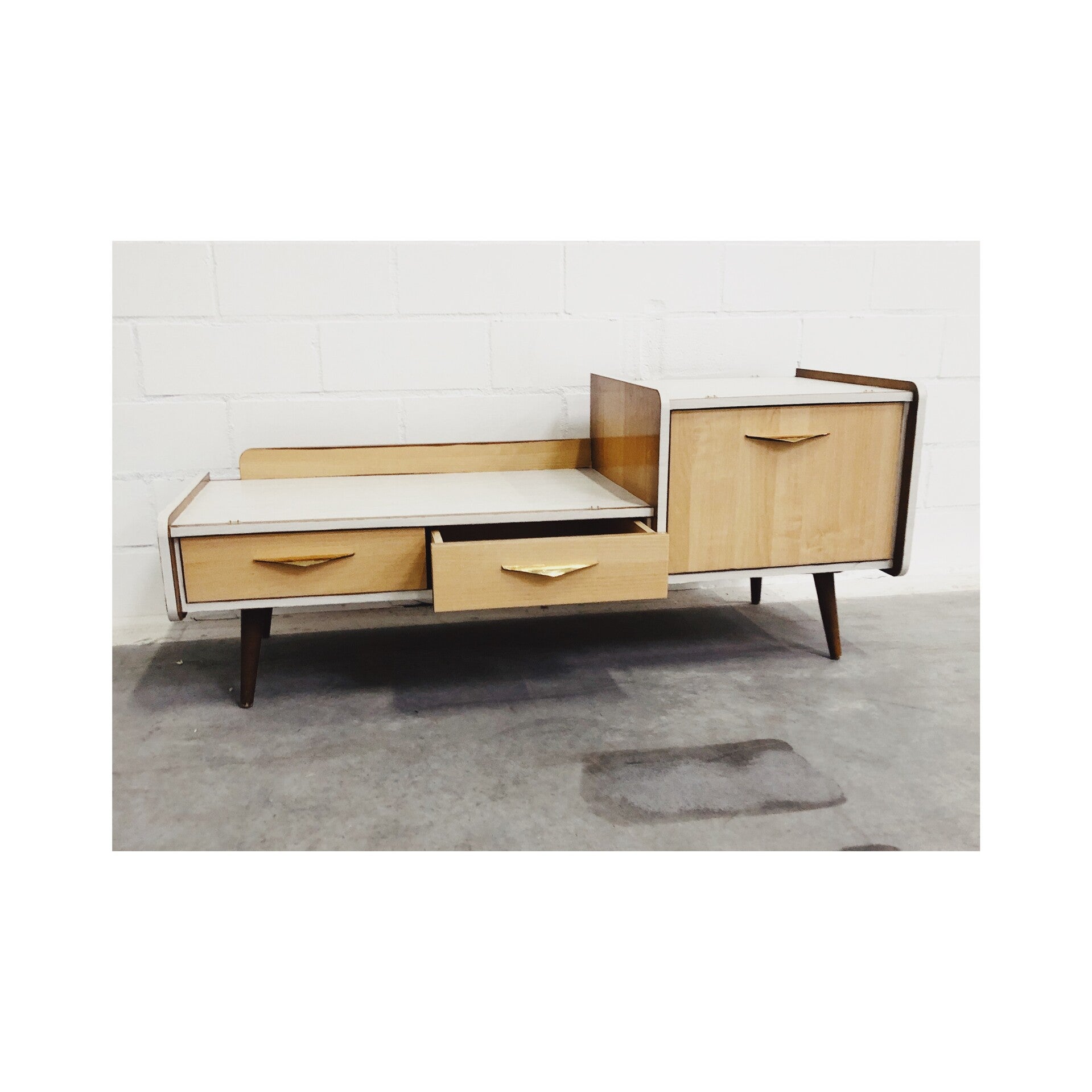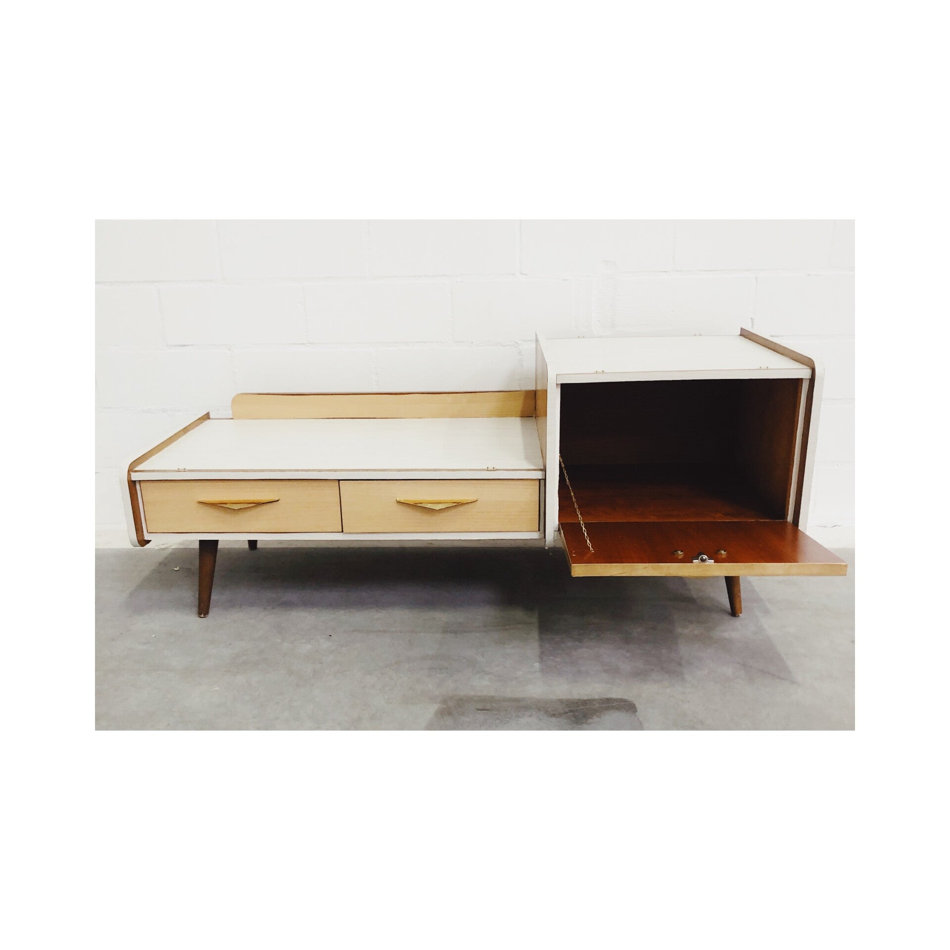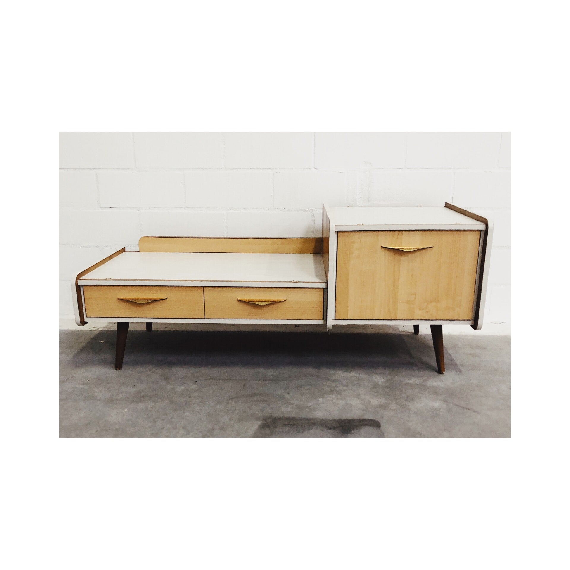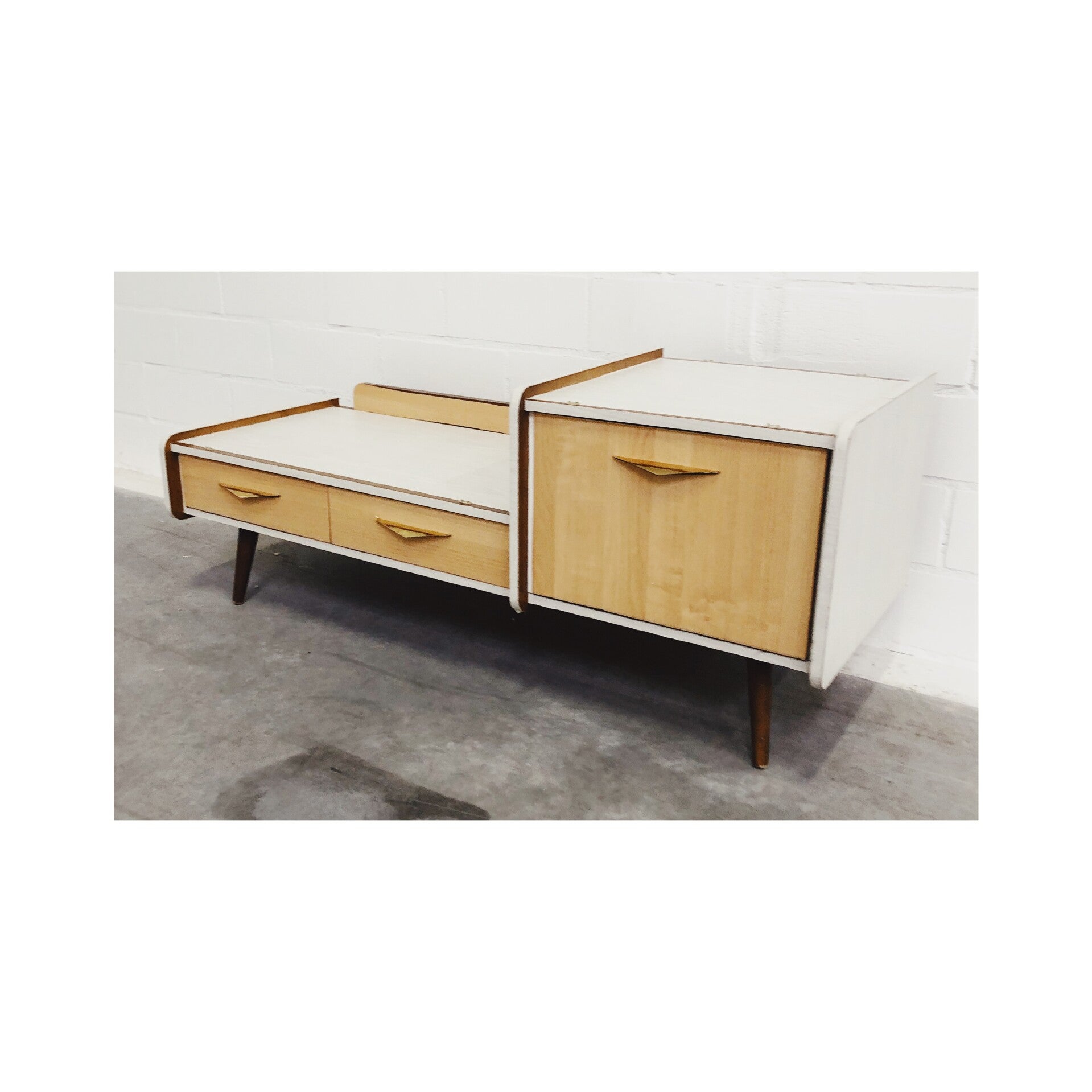 Retro dressoir / tv meubel. Het dressoir heeft een bijzondere jaren '50 look. Het vintage dressoir is perfect voor in de woonkamer en ook goed te gebruiken als tv meubel. Er zat eigenlijk een grote spiegel aan gemonteerd maar die is helaas kapot gegaan. Het kastje heeft ook wat gebruikssporen en is daarom ook scherp afgeprijsd. Dit dressoir is te combineren met de bijpassende nachtkastjes.