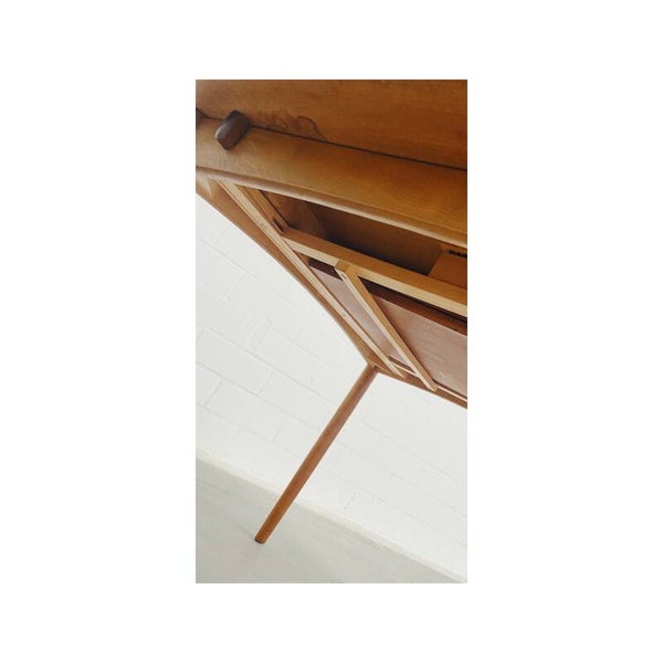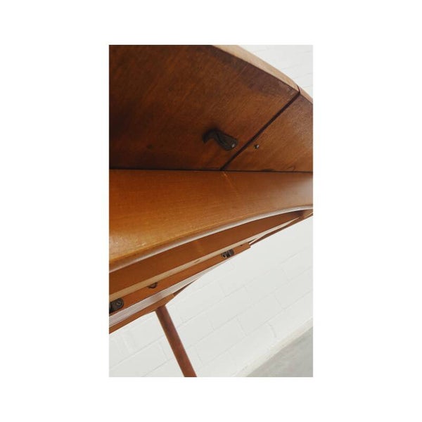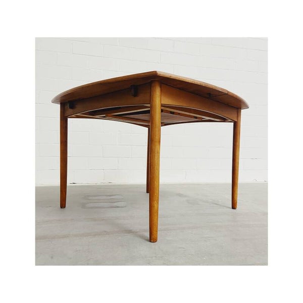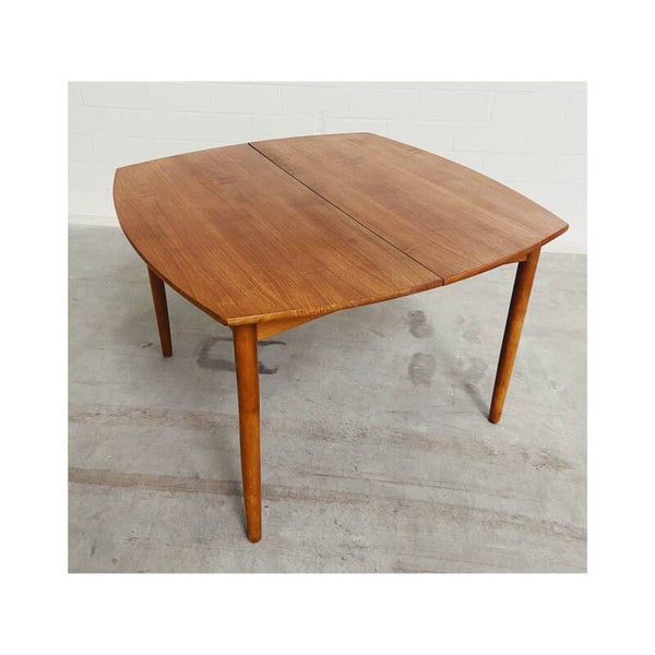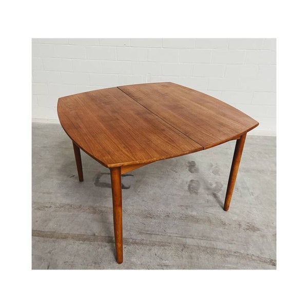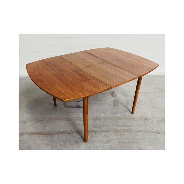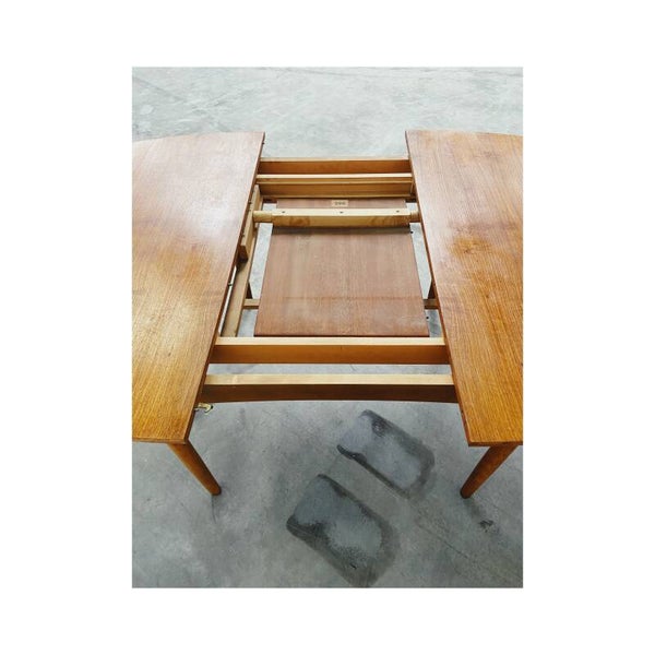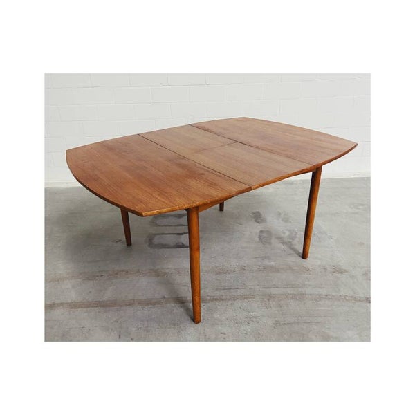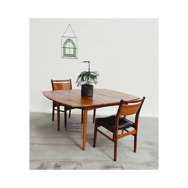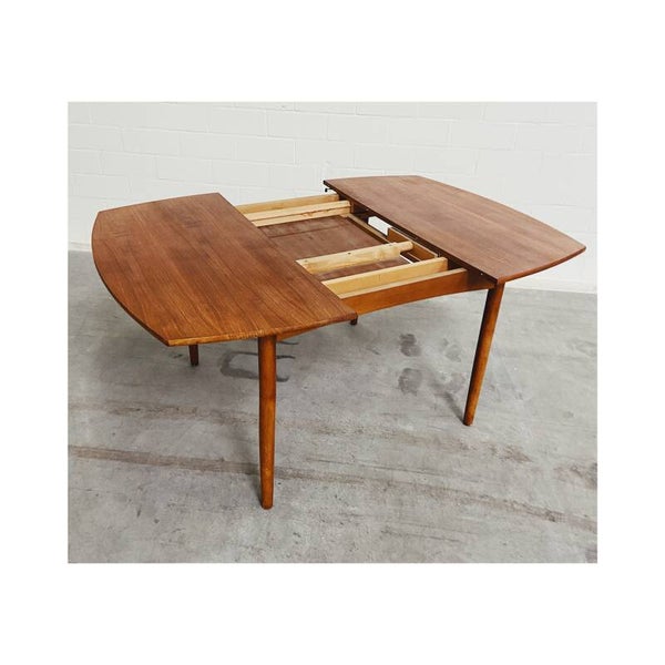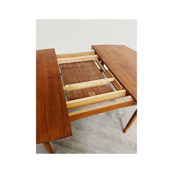 Deze mid century eettafel is niet alleen een lust voor het oog maar is super handig! Deze Scandinavische teakhouten uitschuifbare eettafel is perfect voor twee, vier maar ook zelfs zes personen. Het onderstel van de tafel bestaat uit een mooi gevormd frame van massief teakhout en heeft schuine uiteenlopende poten. Het tafelblad bestaat uit totaal drie delen, het hoofdblad is uittrekbaar, waardoor een extra stuk handig uitgeklapt kan worden. De tafel heeft hier en daar wat kleine vlekjes op blad en op de poten maar is verder nog in top conditie.