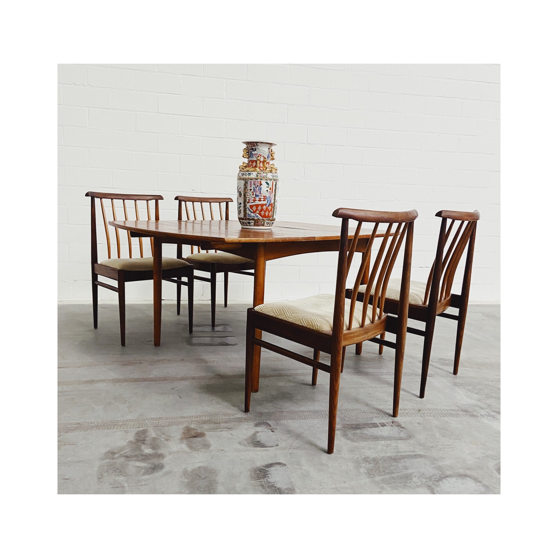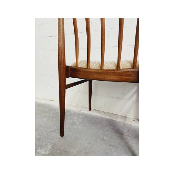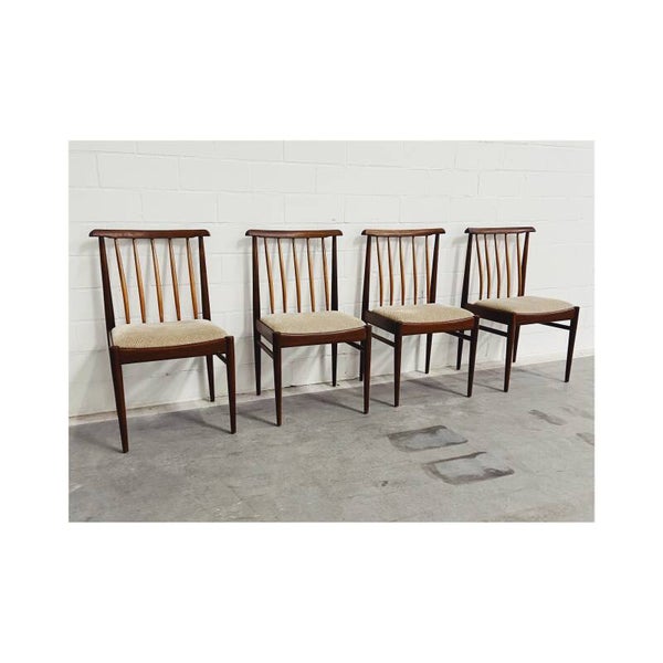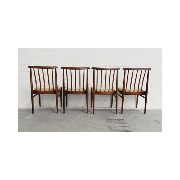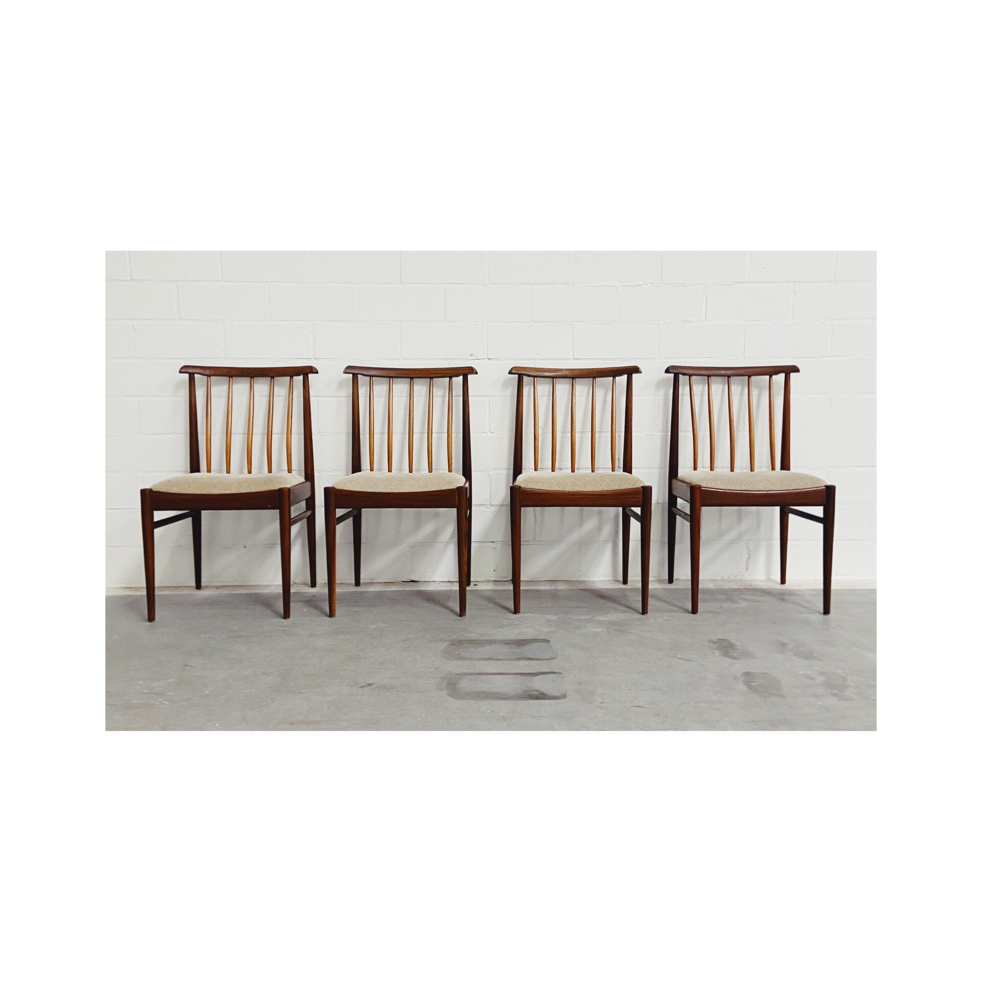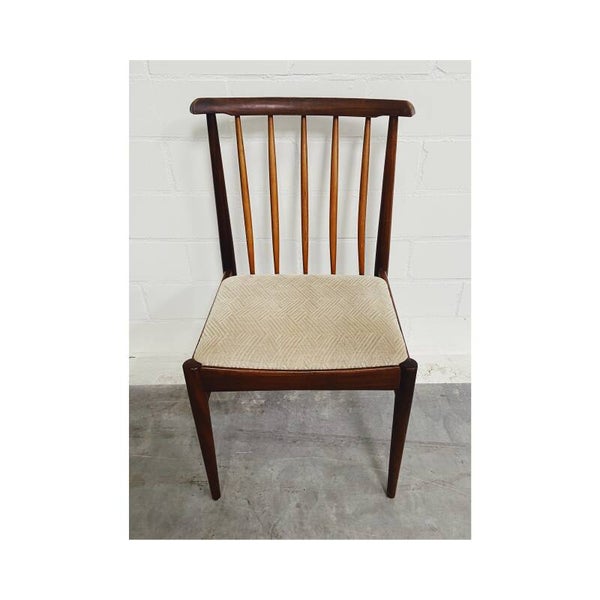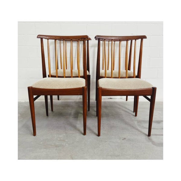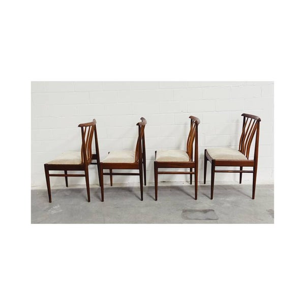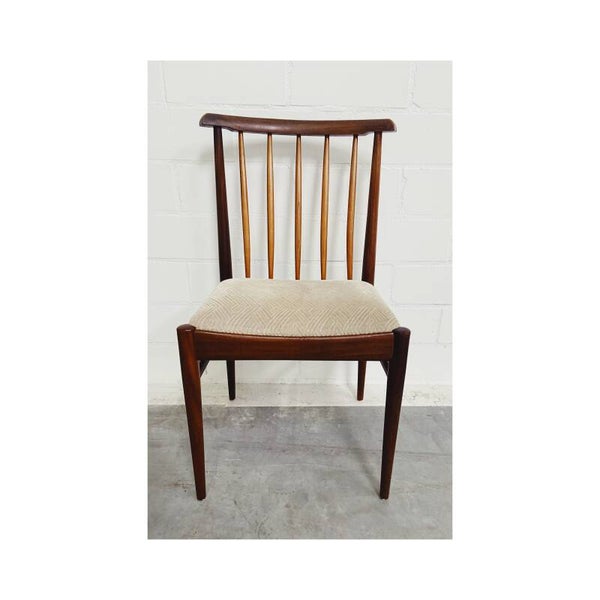 Prachtige set van vier teakhouten eetkamerstoelen. De stoelen hebben bijzondere schuinlopende spijlen en een zitting van velours stof. De Scandinavische stoelen hebben beige velours bekleding waar helaas één van de stoelen twee zichtbare vlekjes heeft (Zie fotos voor meer details). De stof van de bekleding is verder in goede conditie. De stoelen zitten heerlijk en zijn nog goed stevig.