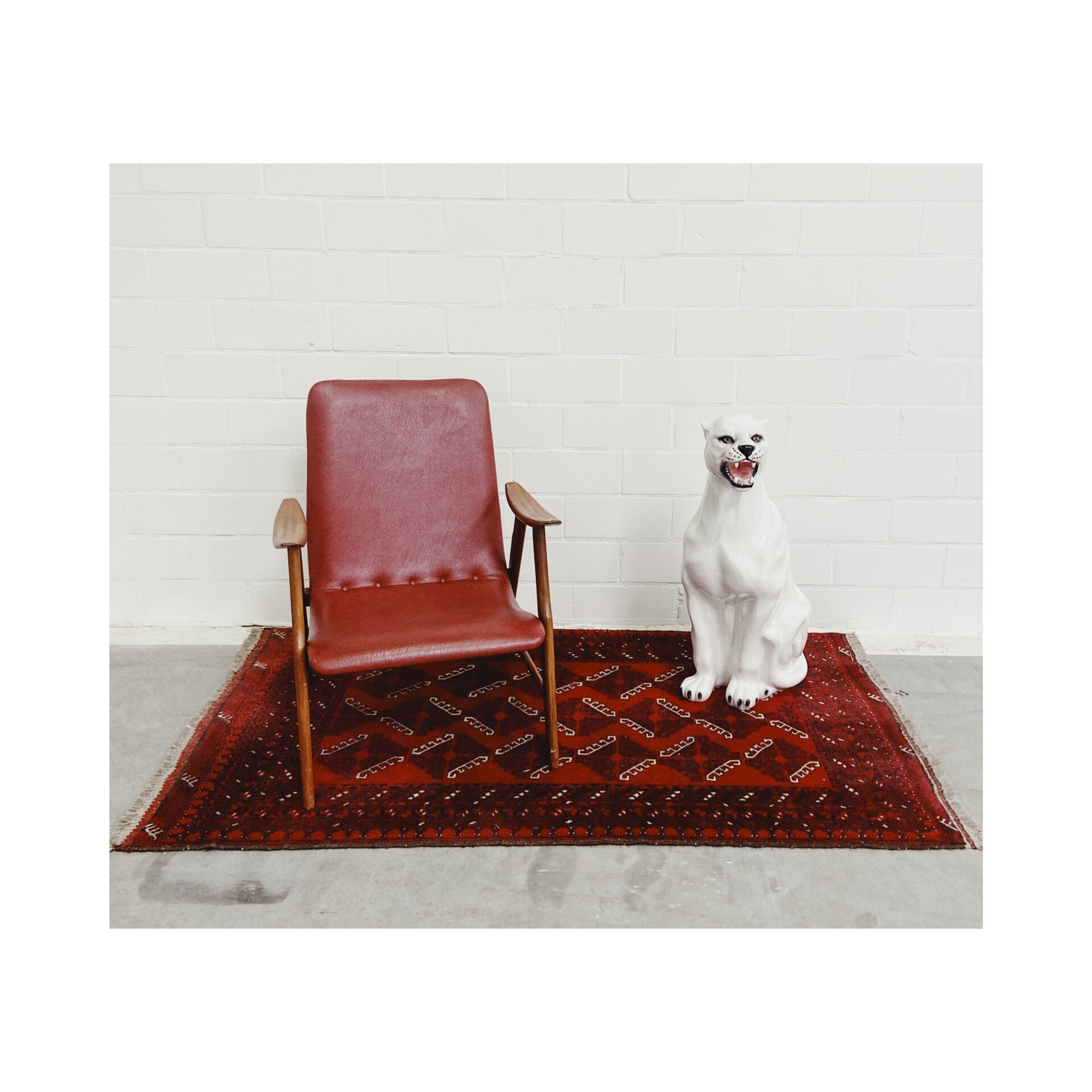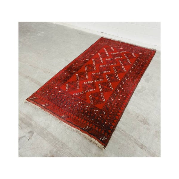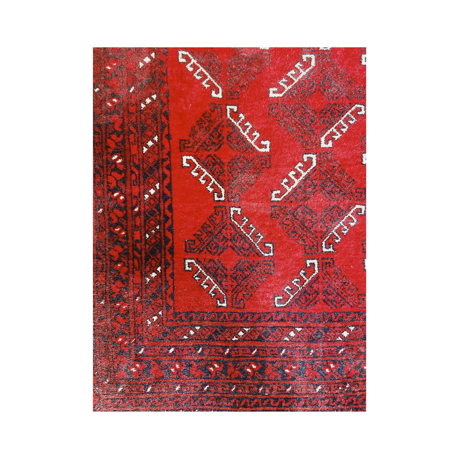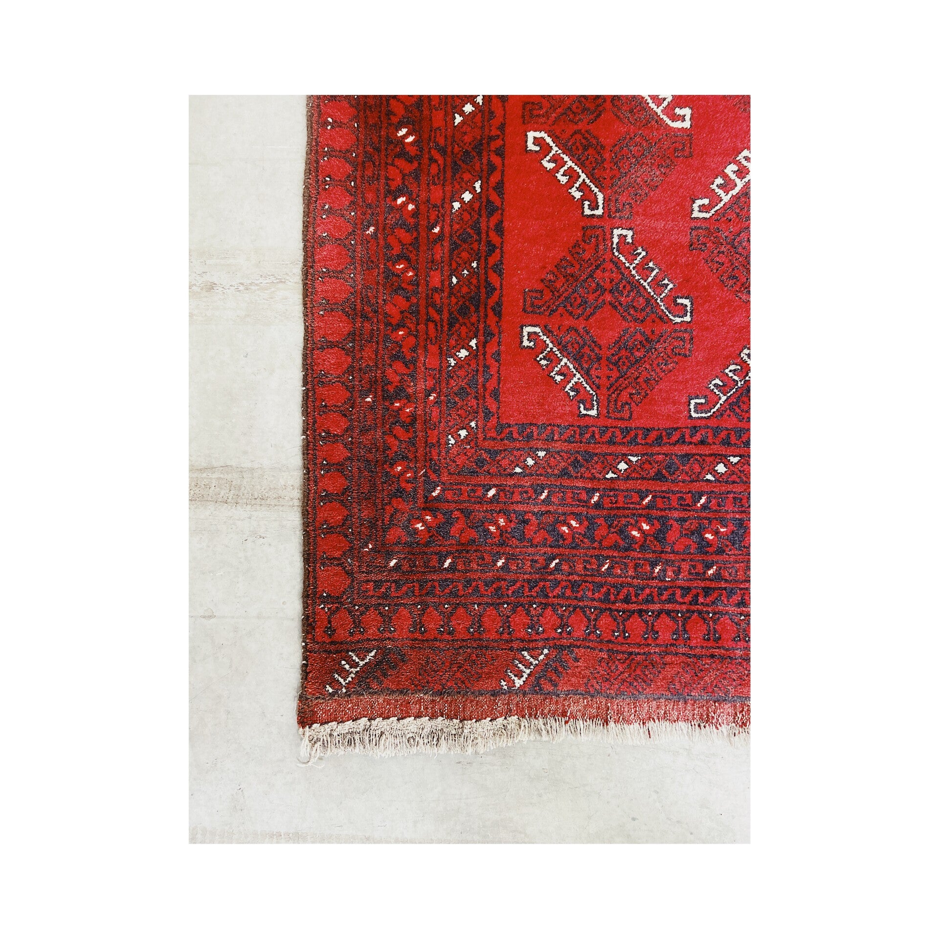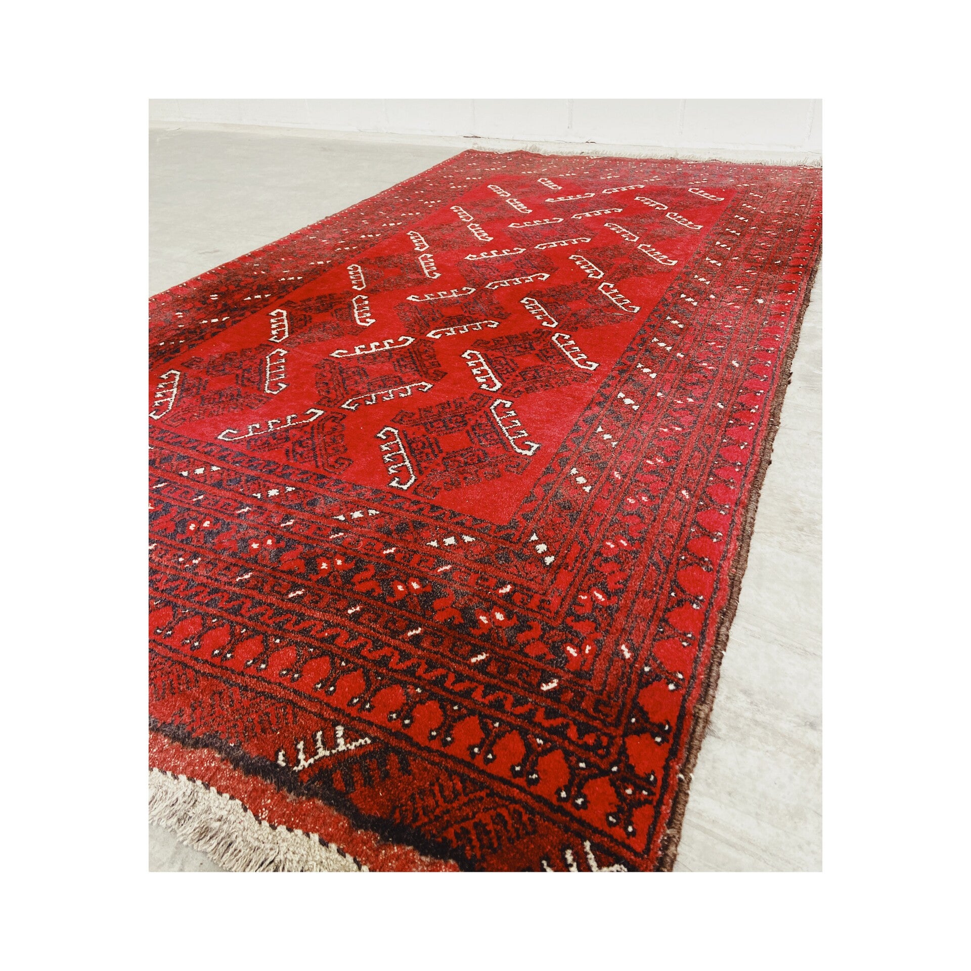 Dit tapijt heeft naast een prachtige heldere rode ondergrond een heel bijzonder patroon. De rode ondergrond wordt gecombineerd met donkerblauw en wit. Het kleed heeft een uniek geometrisch patroon, dat waarschijnlijk verwijst naar het Hatchlou/Purdah design. Deze kleden diende als toegangs-tapijt voor de ingang van de yurts. Het kleed heeft wat zichtbare gebruikssporen naar leeftijd maar is een echt handgeknoopt nomaden tapijt!