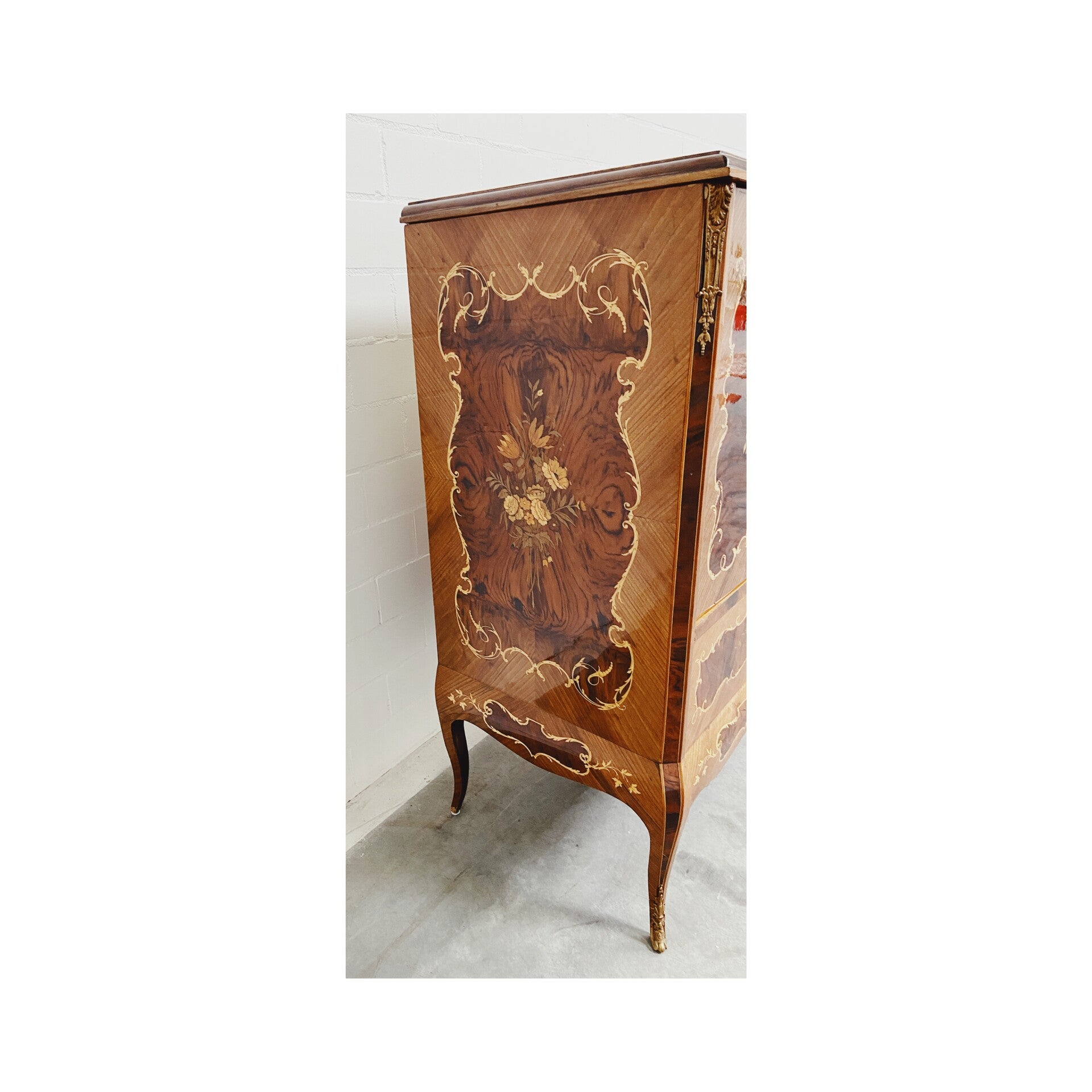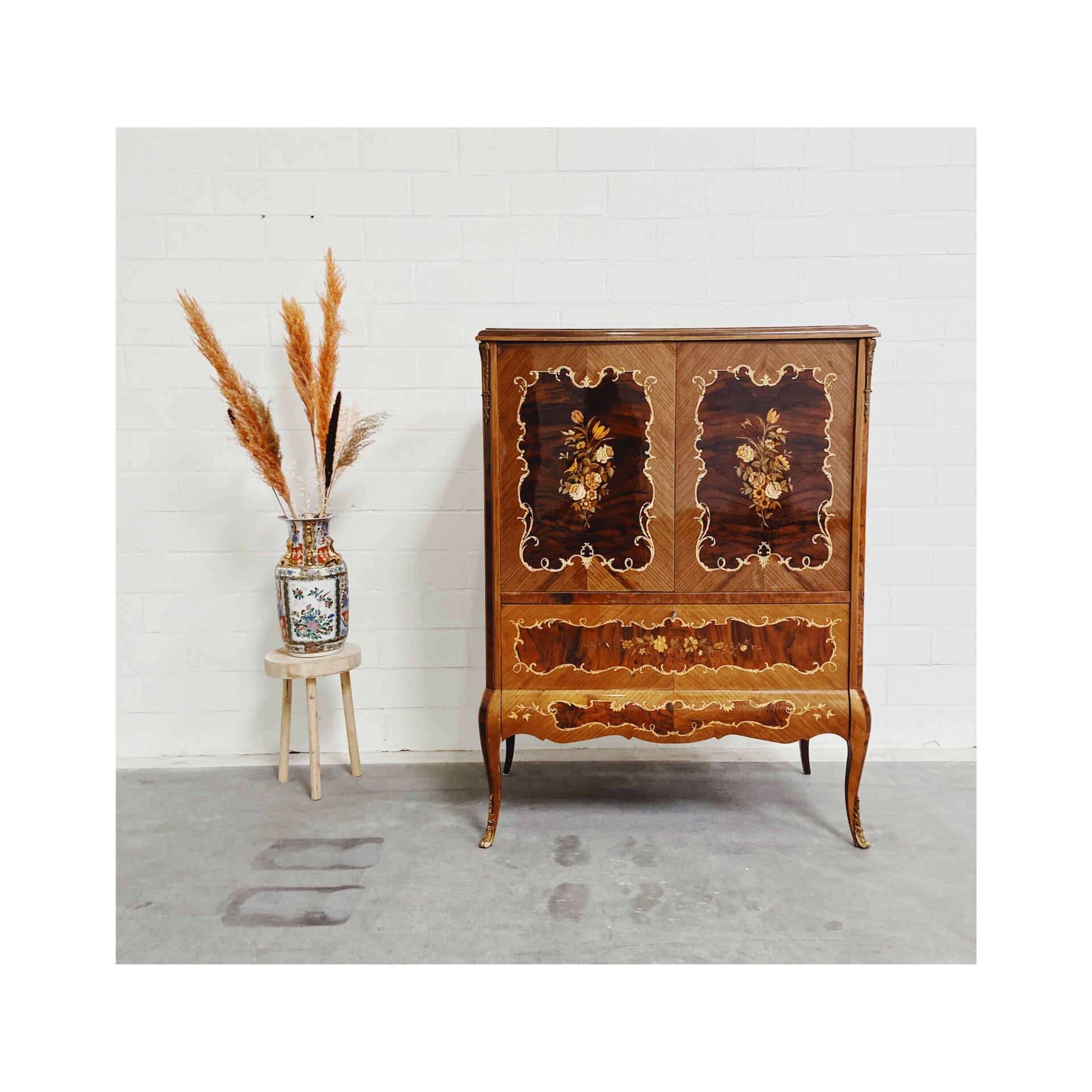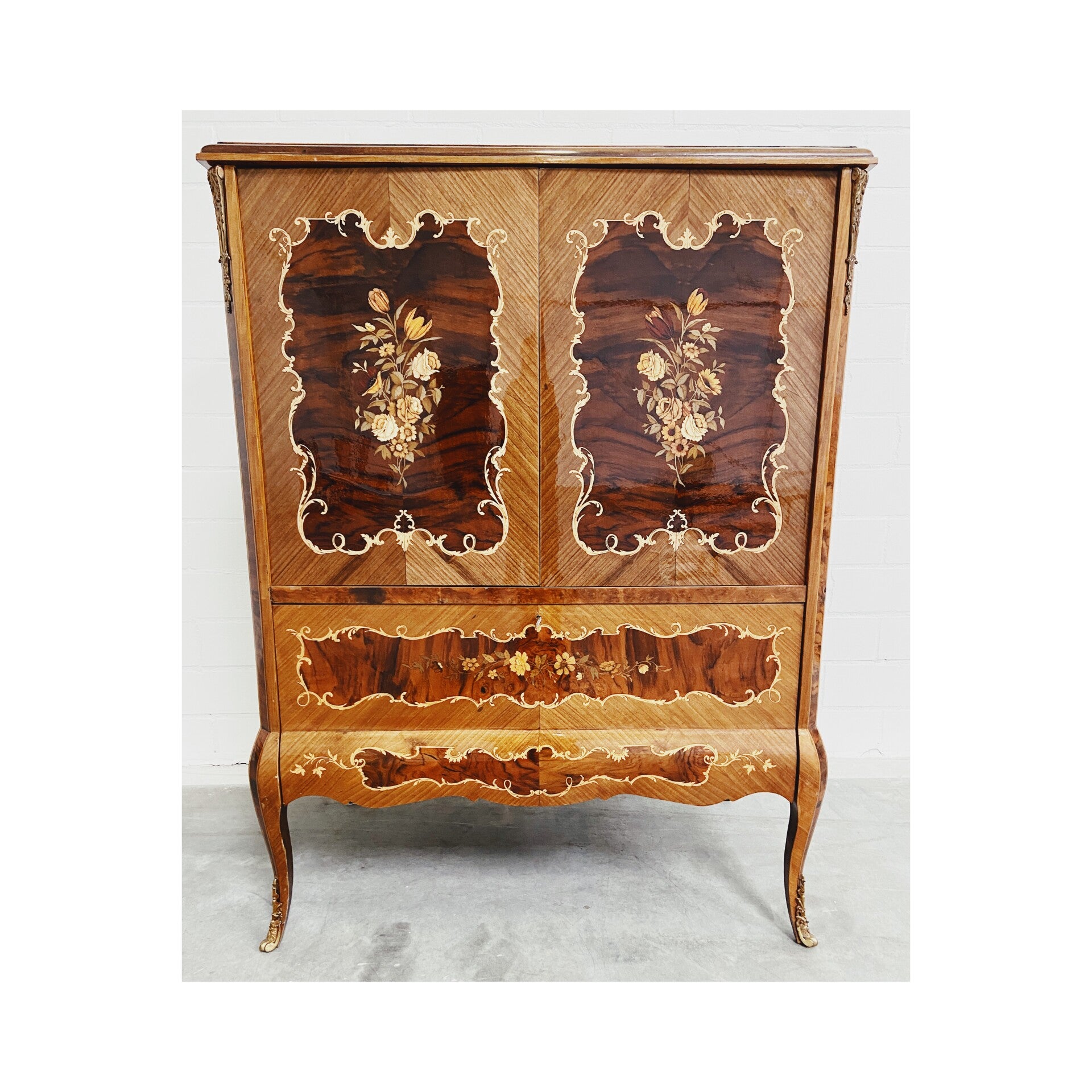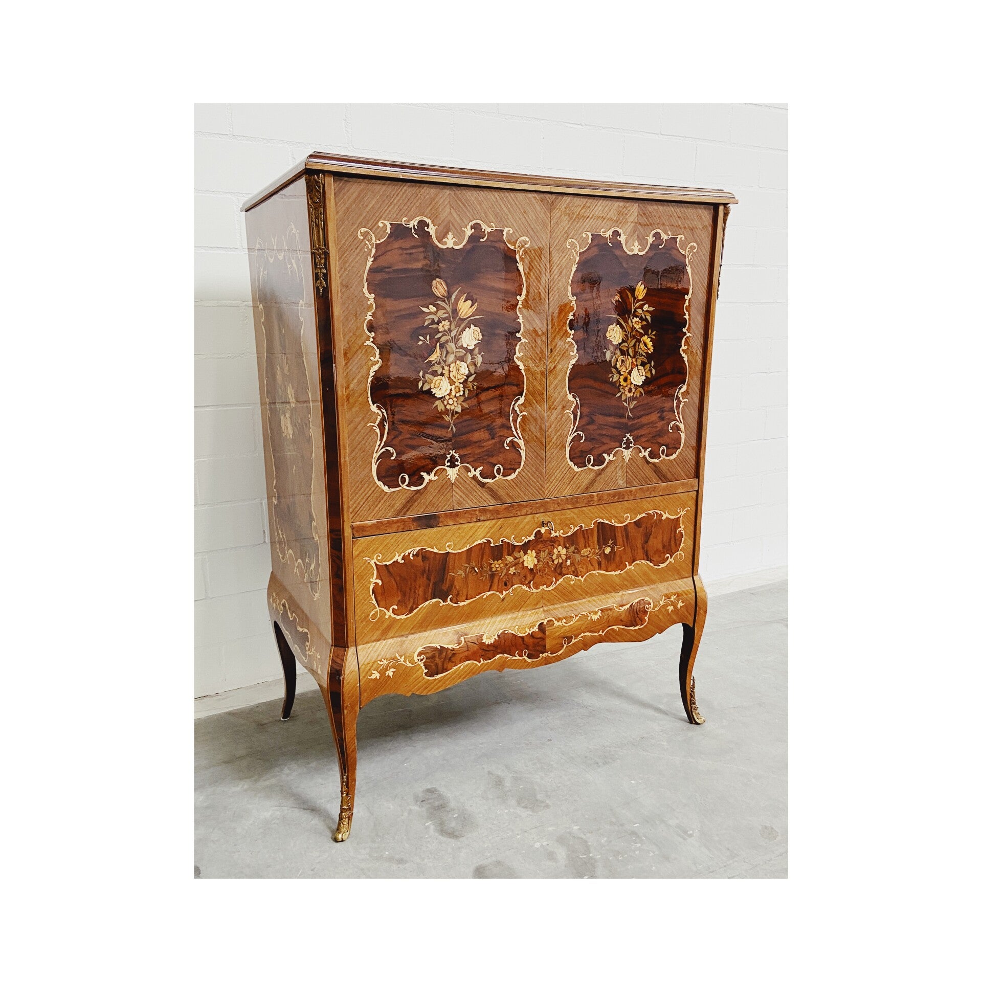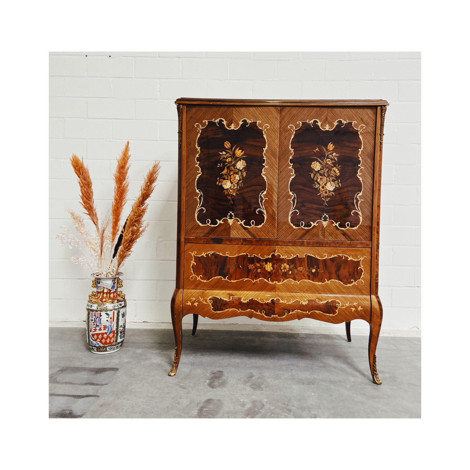 De kast is vrijwel geheel bekleed met een uniek bloem en plantenmotief en heeft een mooie stevige laklaag over het geheel. De deuren kunnen ingenieus in de wanden van de kast worden geschoven, deze worden dan ook geopend door de zijkanten in te drukken. Ook heeft de kast een opberg klep-lade die wordt voorzien van een werkend lampje. De kast heeft aan de binnenzijde wat gebruikssporen naar leeftijd maar is van de buitenzijde in top conditie!