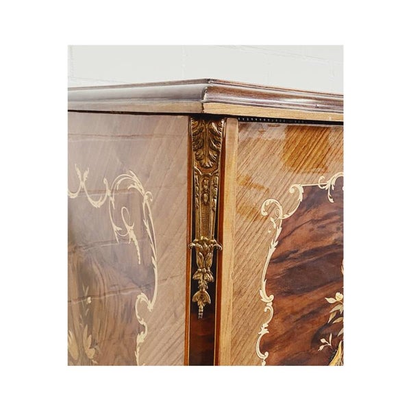 Deze oogverblindende Louis XV kast zal de show stelen in je interieur! De kast is gebruikt als tv kast (te zien aan de monteringsgaatjes binnenin) maar is ook perfect als buffet/opbergkast. Het meubel heeft prachtig bronsbeslag aan de voorpootjes en op de hoeken bovenop.