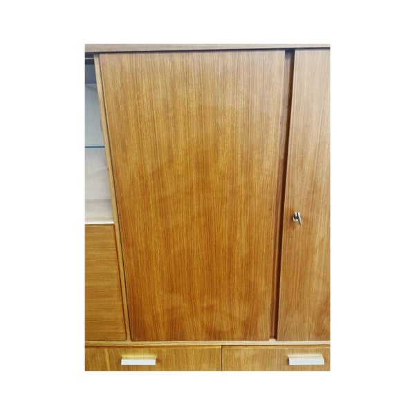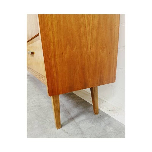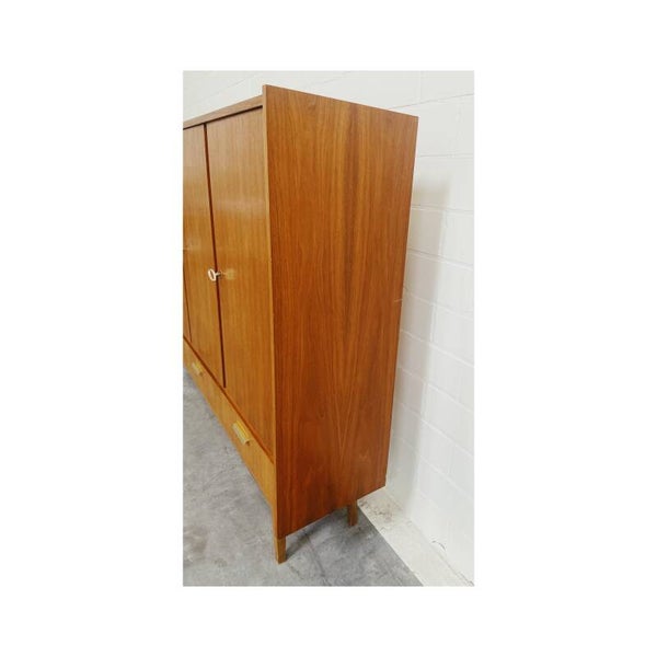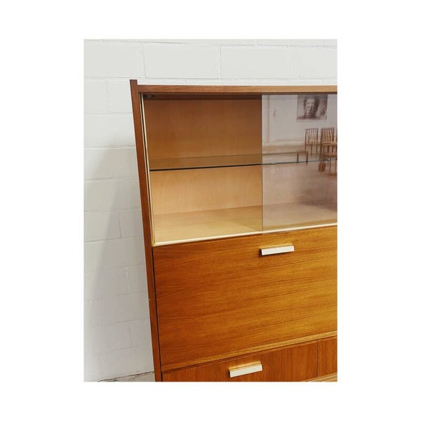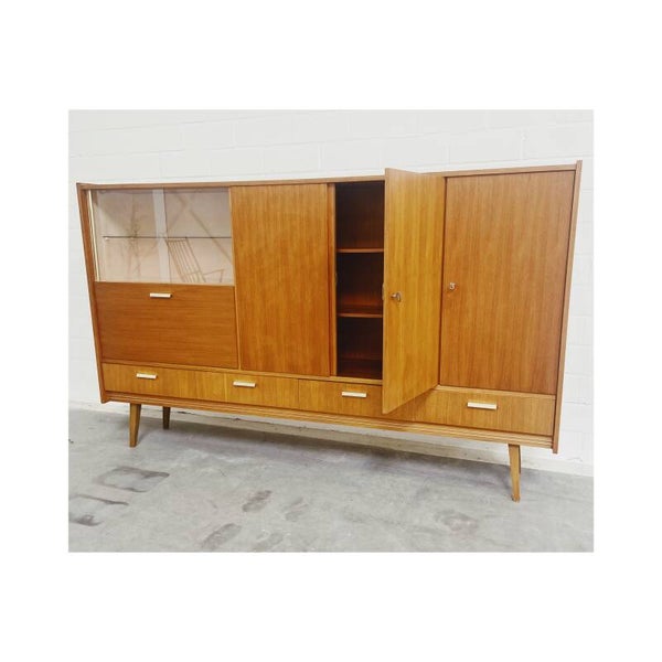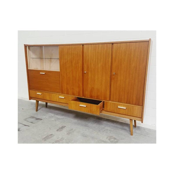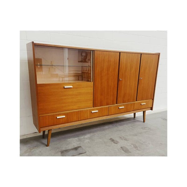Geweldig Vintage Highboard / Buffetkast van fabrikant Berner Huwil. De kast is van teak fineer en heeft mooi messing sluitwerk! De buffetkast bestaat uit vier laden aan de onderzijde met elk een ingelegd groen vilt. De rechterzijde van de kast is opgedeeld in 3 vakken bestaande uit twee compartimenten die elk worden afgesloten door een deur met sleutel. De linkerbovenzijde bestaat uit een glazen vitrine die door twee schuifdeuren van glas afgesloten worden. Aan de onderzijde van de vitrine bevindt zich een kleplade met nog een extra opbergmogelijkheid.