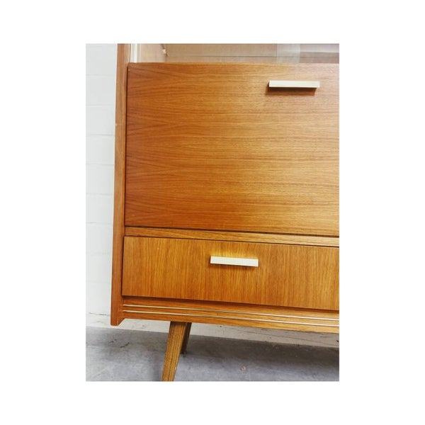 De kast heeft aan één zijde een zichtbare beschadiging in het fineer. Ook heeft een van de glazen wandplanken een klein chipje eraf. (Zie de foto's voor meer details) Gezien de leeftijd en de kleine oneffenheden is de kast verder in goede vintage conditie! De kast staat op vier uiteenlopende ranke pootjes die het zware geheel dragen. Een stevige wandmontage wordt hierdoor wel aanbevolen! Al met al is deze unieke kast een heel bijzonder meubel voor wie echt de blitz wilt maken met zijn interieur. Maak gerust een afspraak om de kast te komen bekijken!