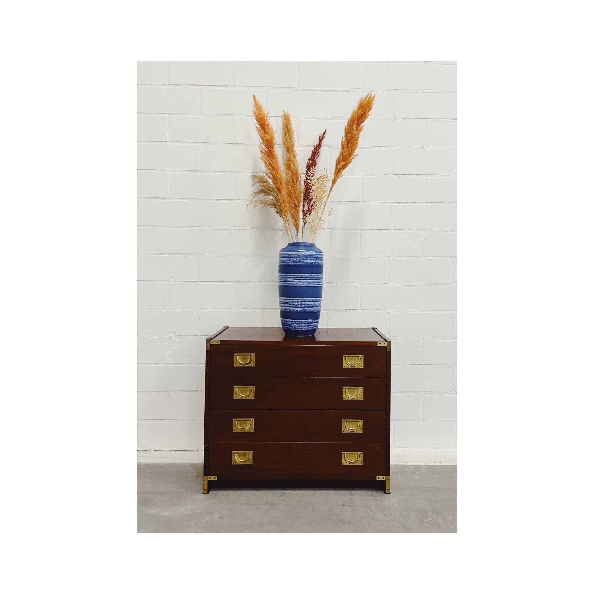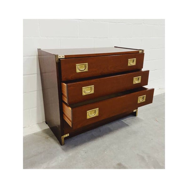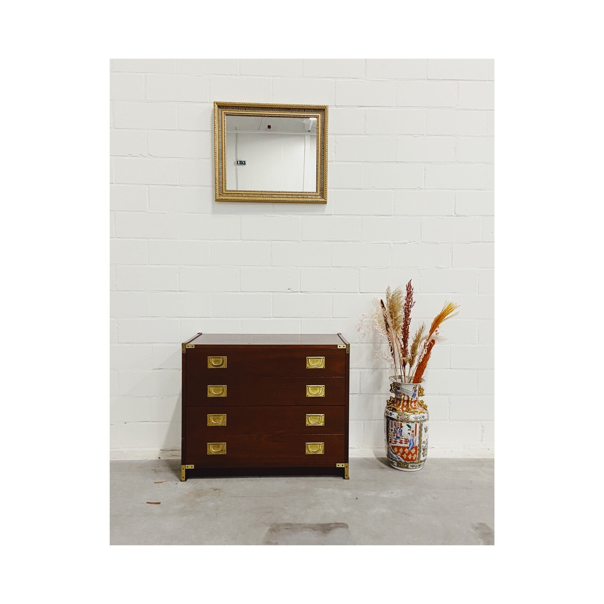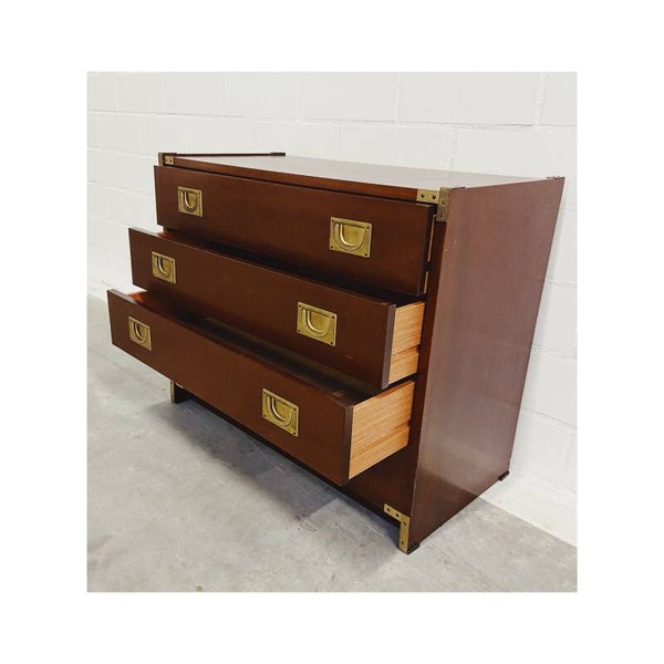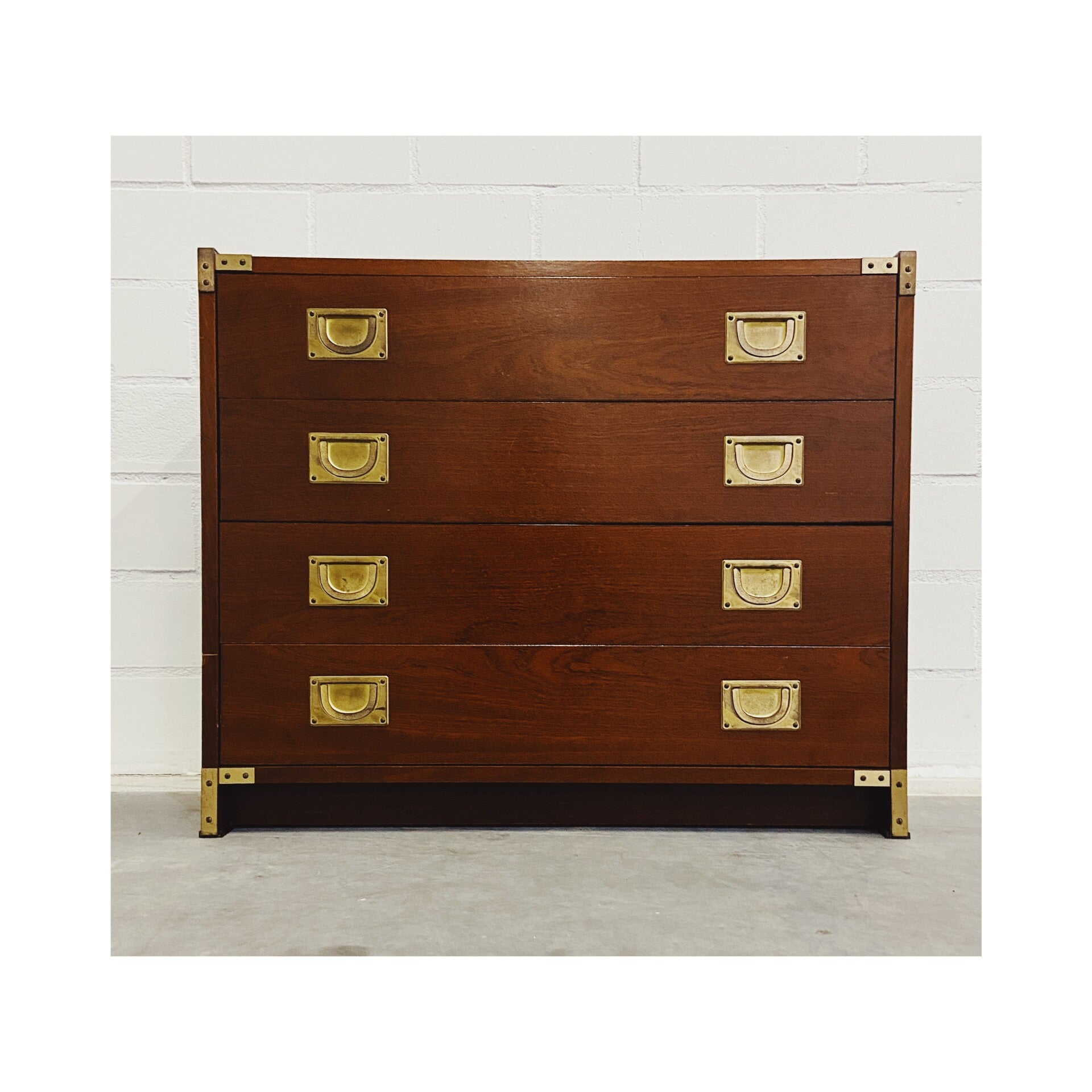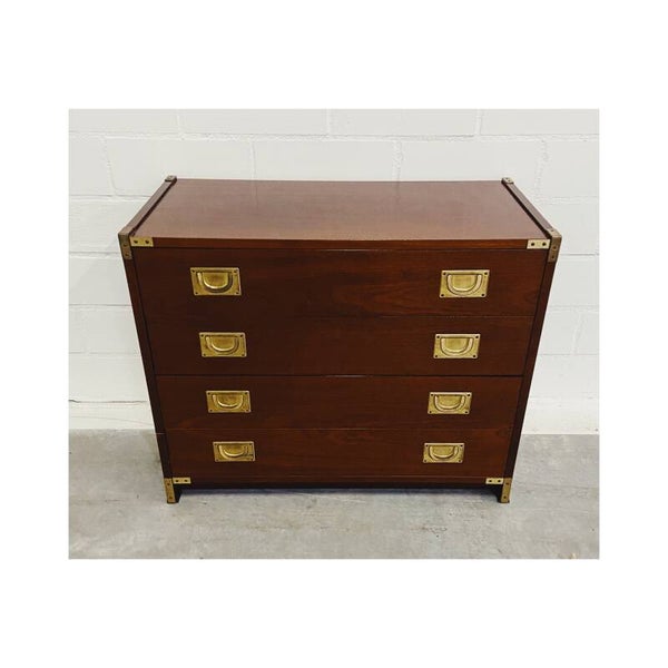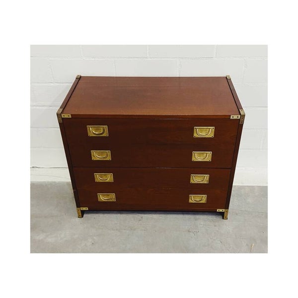 Uniek 19e-eeuws militair ladenkastje. Deze mahoniekastjes met messing beslag werden oorspronkelijk gemaakt voor de Engelse officieren die langdurig verbleven in hun koloniën. De ladekast heeft vier laden die elk worden afgesloten met twee goud-koperen treklipjes. In de hoeken van het kastje bevinden zich gouden messing details. De onderste lade gaat wat stroef open maar verder is de kast in hele goede vintage conditie!