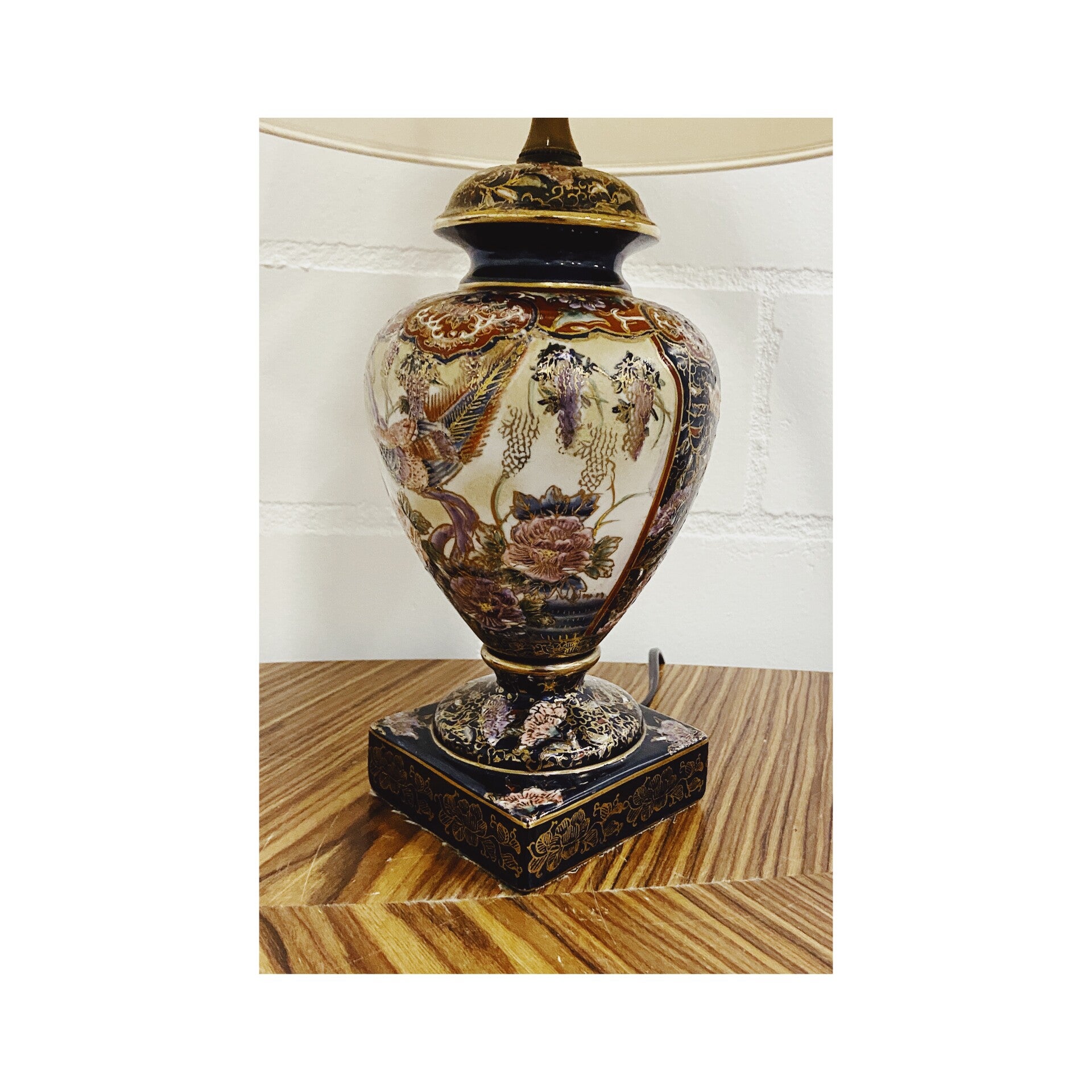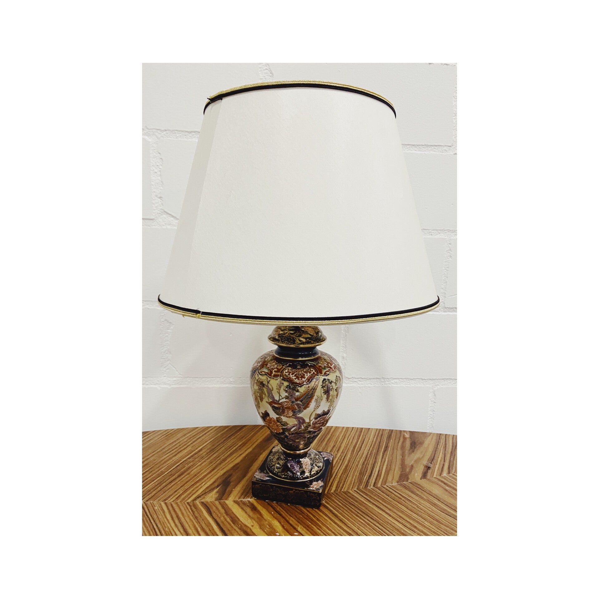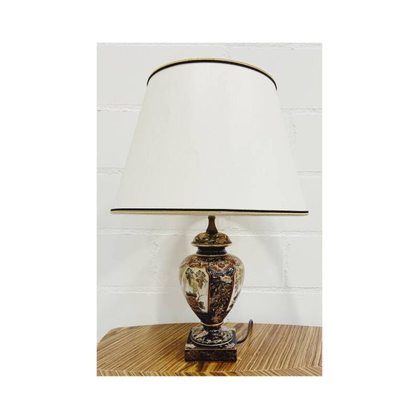 Deze Prachtige Oosterse tafellamp is een echt uniek item! De lamp heeft een voet van keramiek waar een handgeschilderd vogel- en plantenmotief op is te zien. De lamp heeft een heldere witte kap, en wordt aan de onder en boven zijde afgesloten met een goud zwarte rand. De lamp werk nog naar behoren en is in goede vintage staat. In de kap bevinden zich twee kleine deukjes.