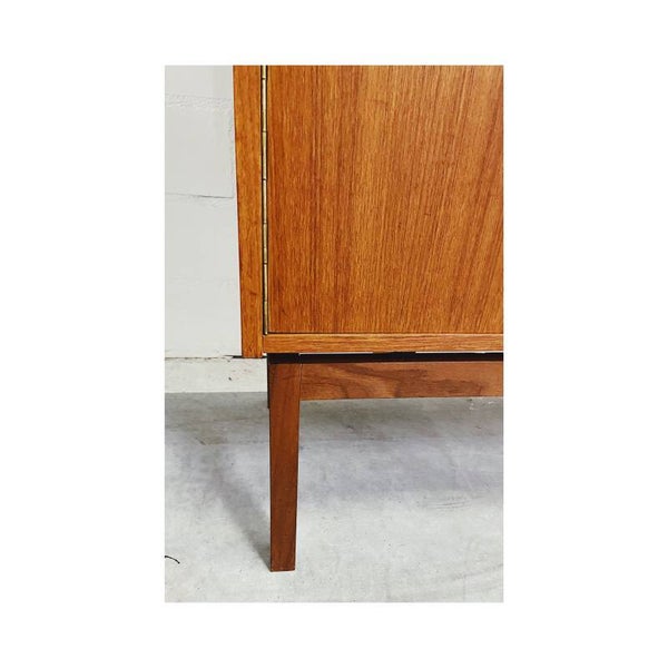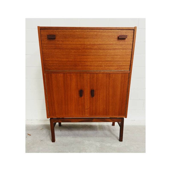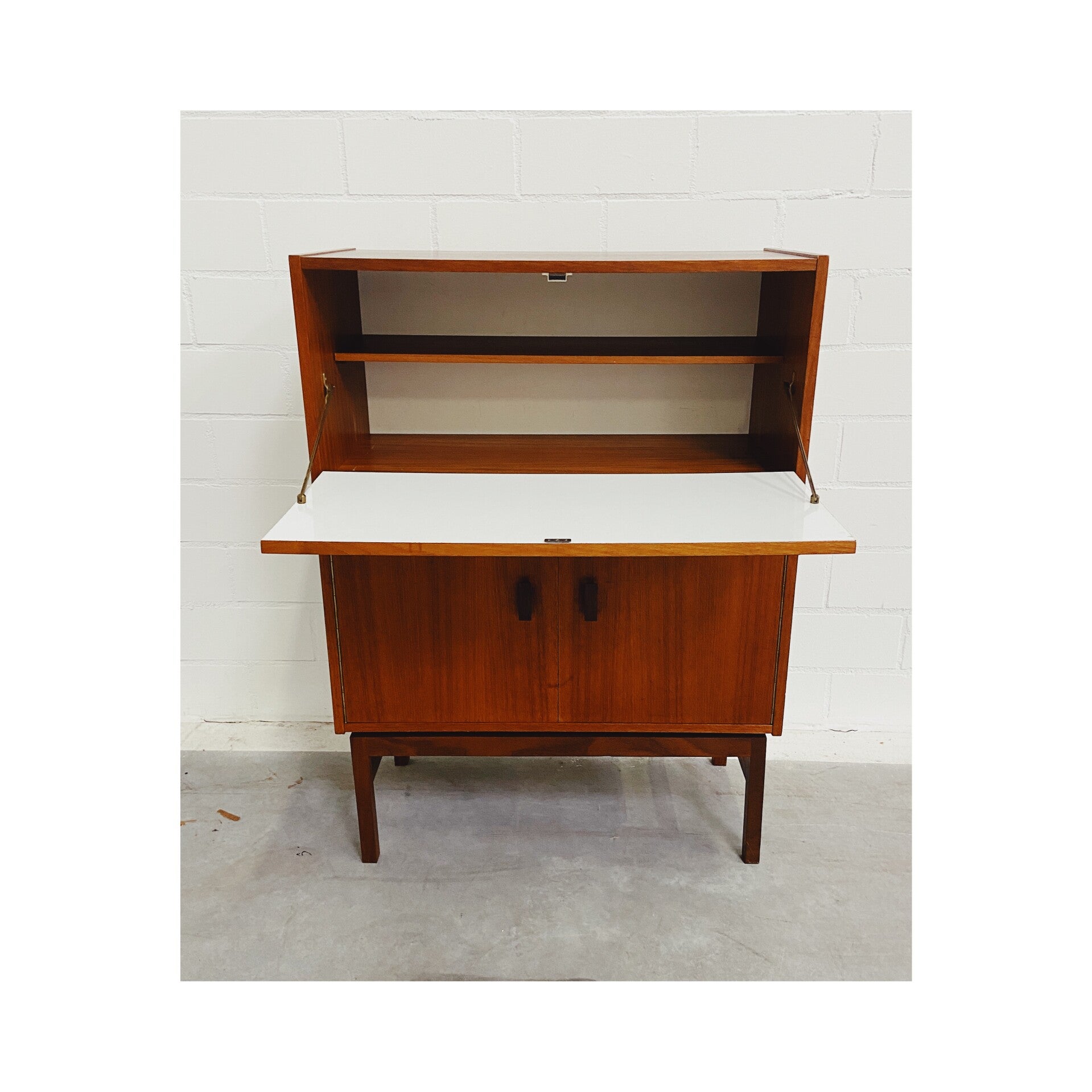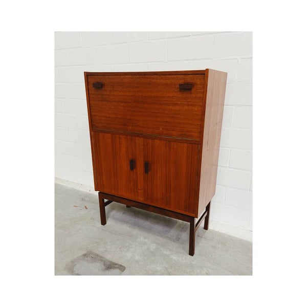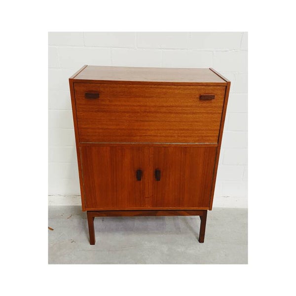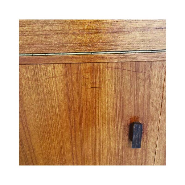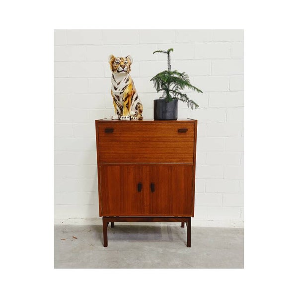 Uniek vintage bar/wand kastje met veel opbergruimte! De teak-houten kast heeft aan de bovenzijde een grote klepdeur die de opbergruimte in tweeën deelt. De onderzijde heeft twee deuren die nog meer opbergruimte bieden. De kast heeft wat zichtbare krasjes in het hout (zie foto's voor meer details) maar is verder in goede vintage conditie. Dit verfijnde vintage meubel van TopForm charmeert je door zijn scandinavische vintage look!