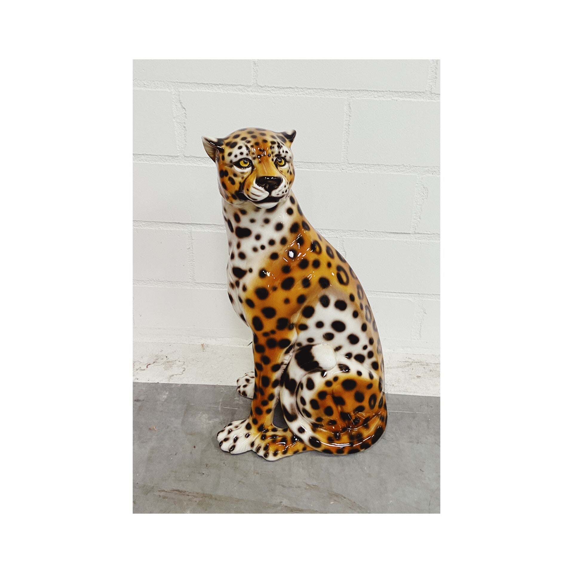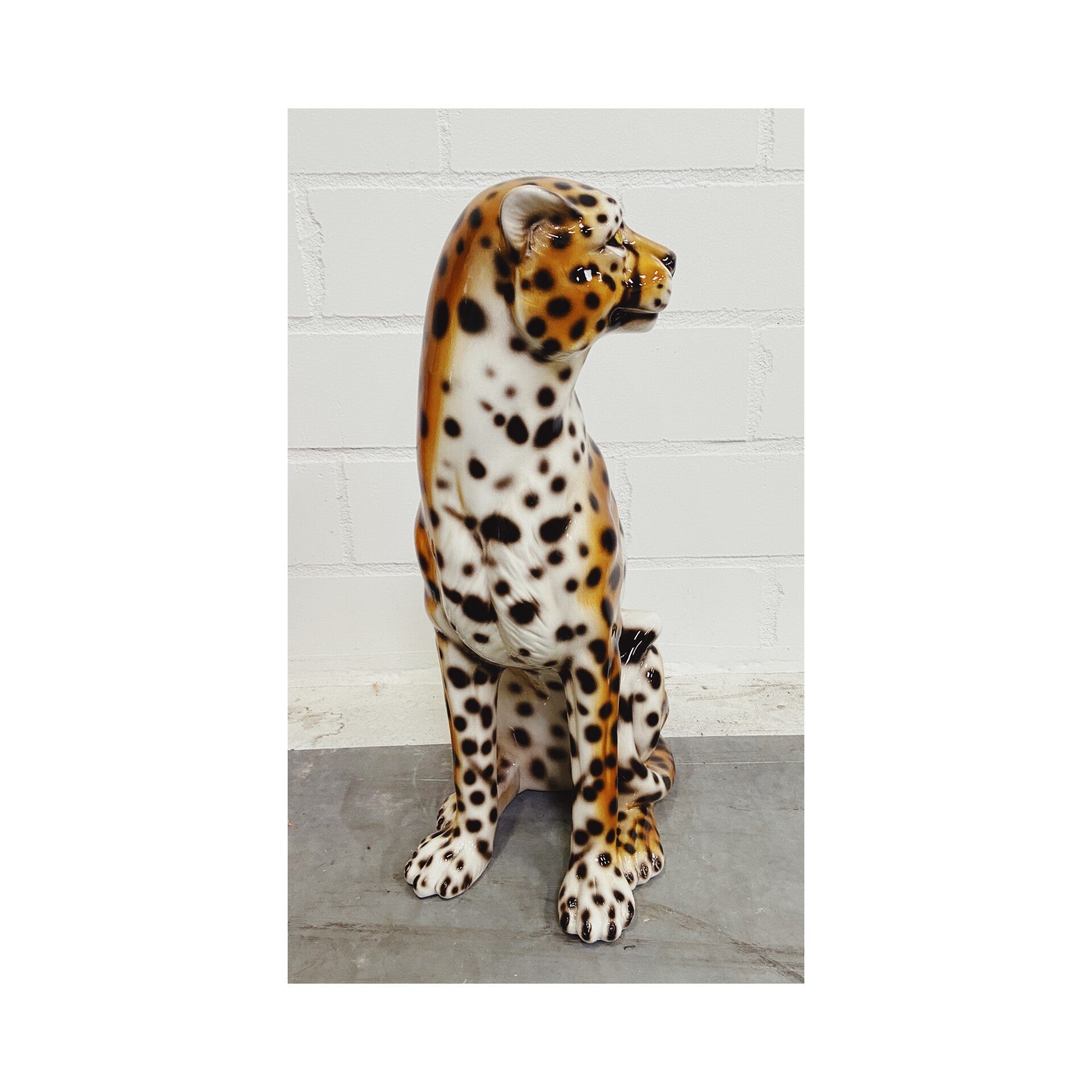 Hoe gaaf is dit prachtige Cheetah beeld! Het Hollywood Regency beeld is van handbeschilderd keramiek en made in Italy! Dit beeld zal een fantastische stoere look geven in je interieur.
