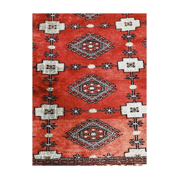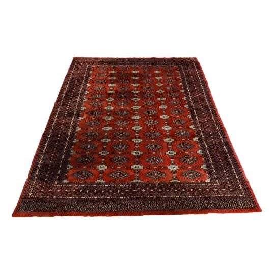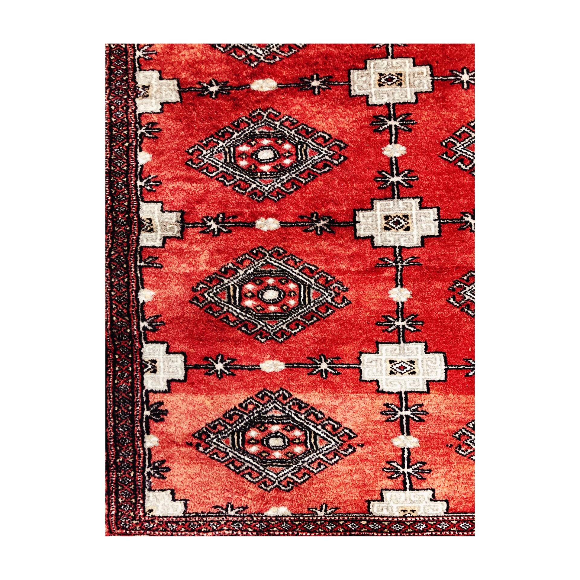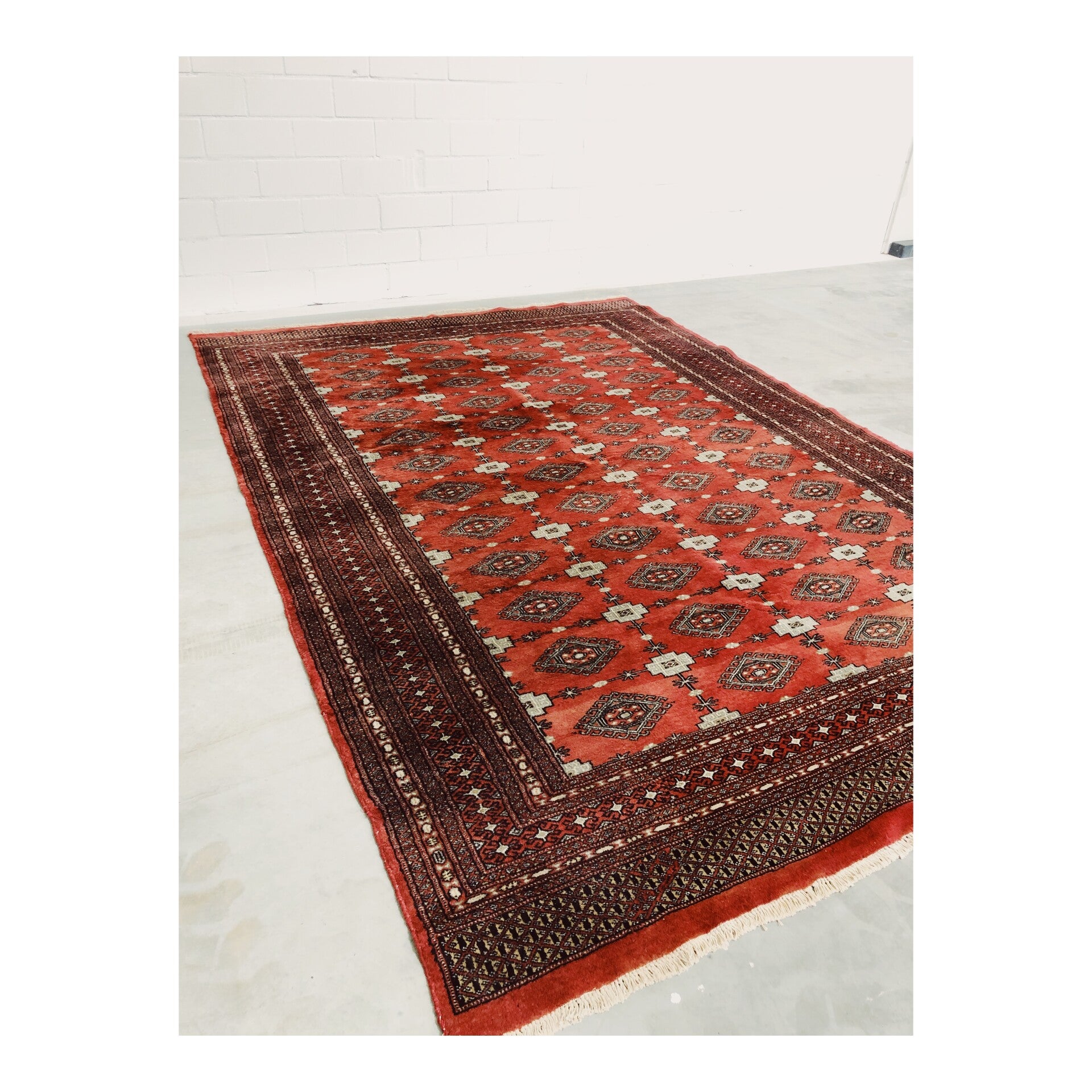 De term 'Bokhara' tapijt wordt vaak gebruikt voor een tapijt of vloerkleed dat het klassieke Bokhara patroon laat zien. Dit Bokhara patroon is vaak te herkennen aan een ruwe rode grondkleur en cirkelvormige delen in het patroon. Het kleed heeft wat minimale verkleuringen maar is verder in goede vintage conditie.