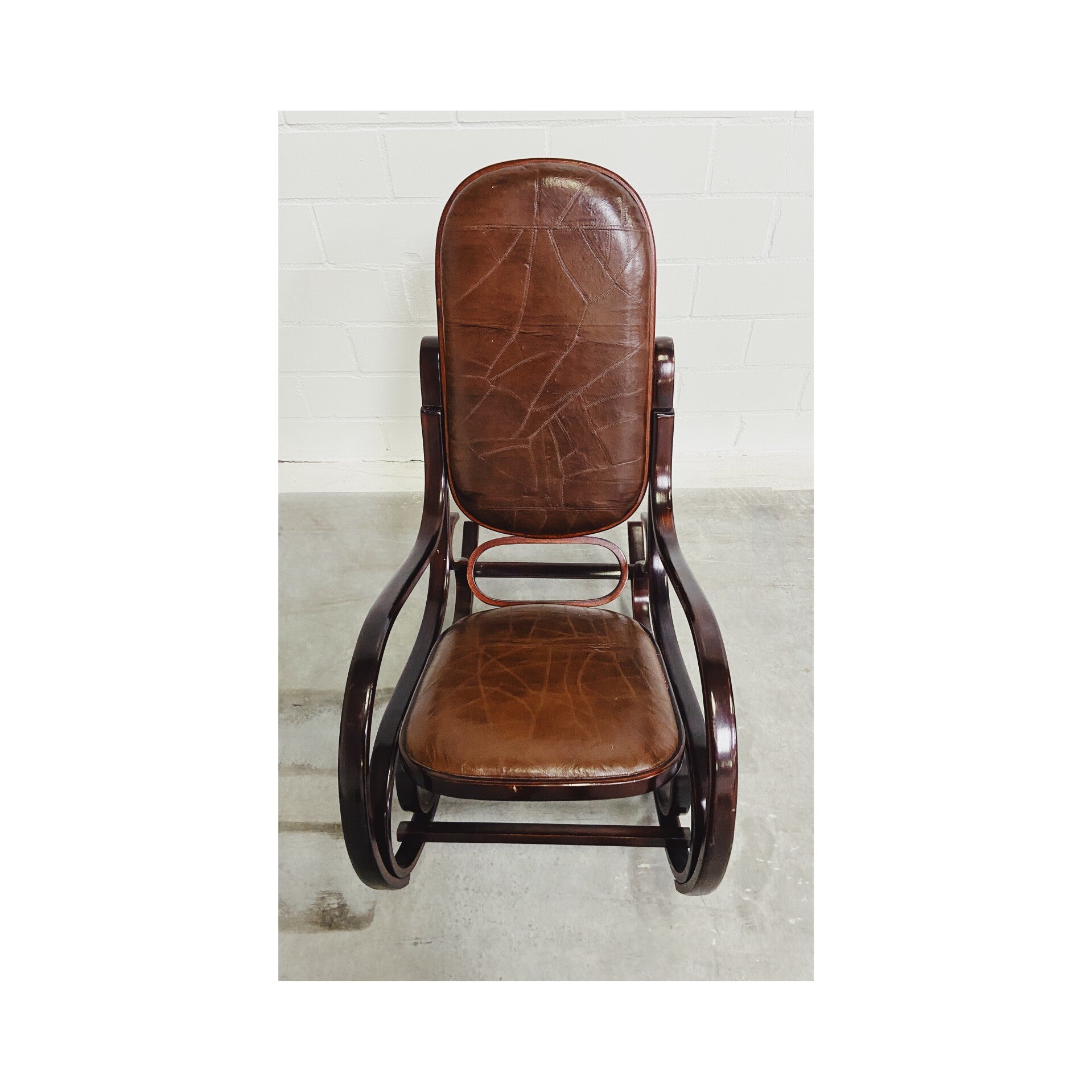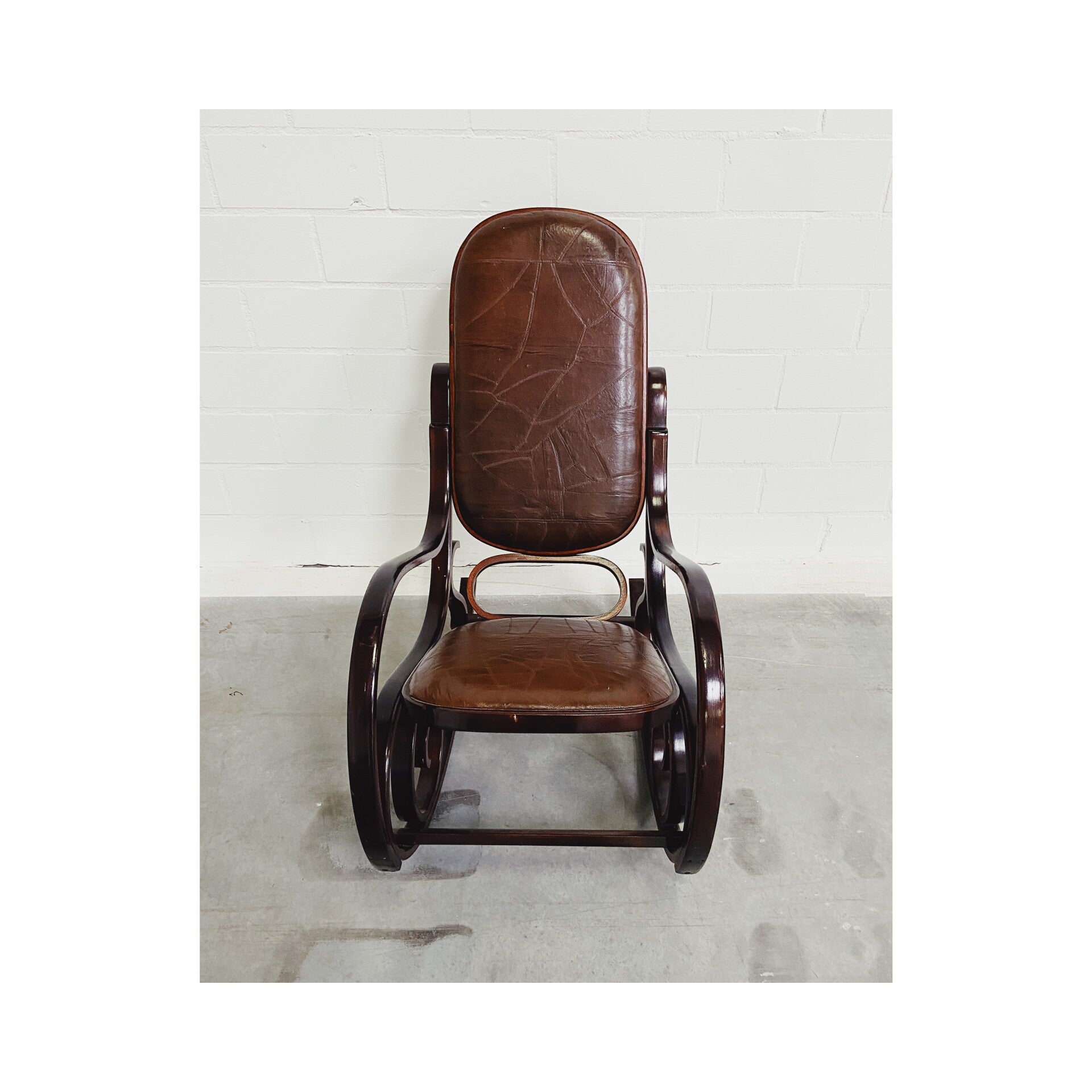 Waanzinnige schommelstoel met skai-lederen rug en zitvlak. Wat deze stoel zo uniek maakt is de vervaardigings techniek, waarbij het hout wordt verwarmd en vervolgens in zijn bijzondere ronde vormen wordt gekruld. De stoel heeft wat gebruikssporen in het leer en wat plekjes op het hout, maar is verder nog in hele goede conditie.