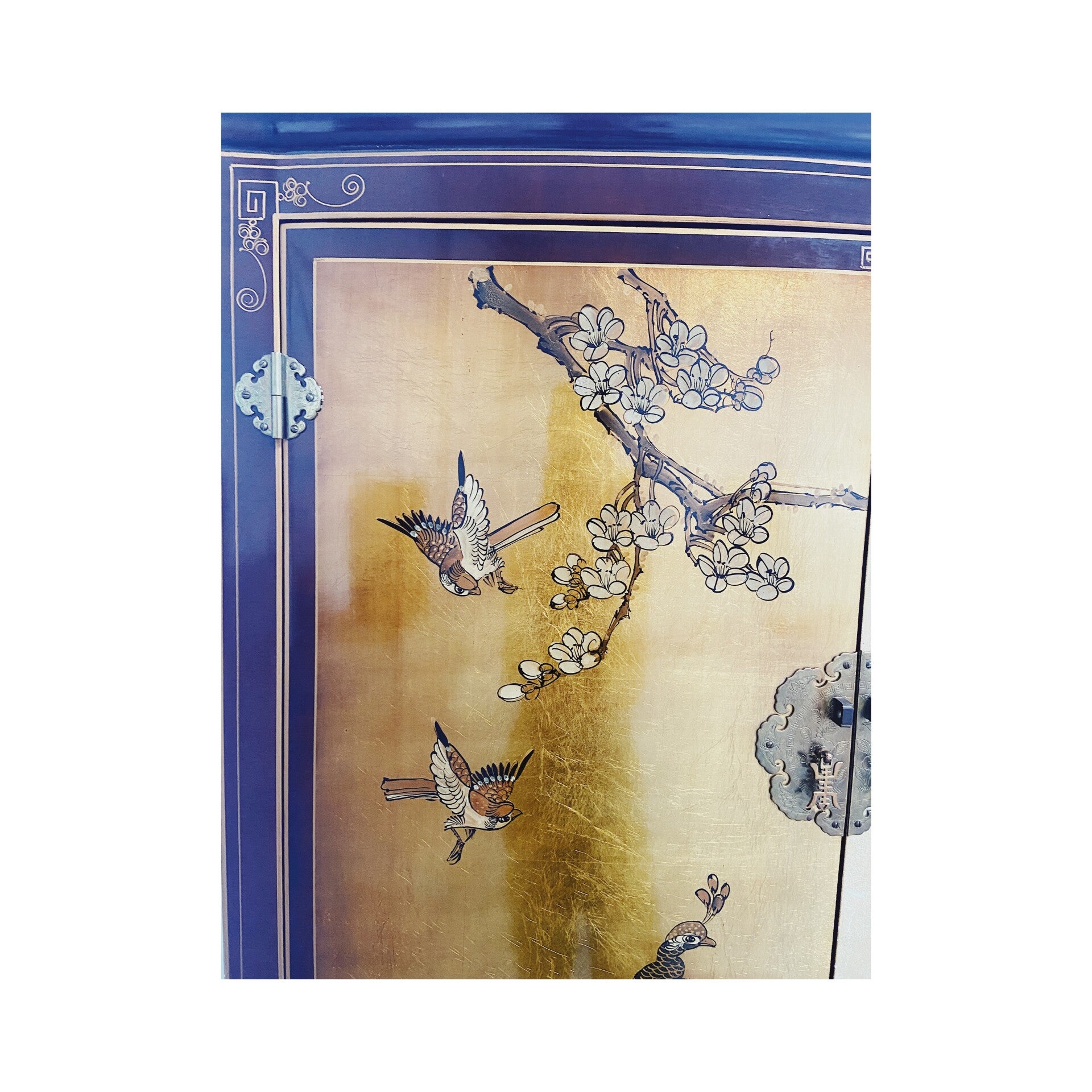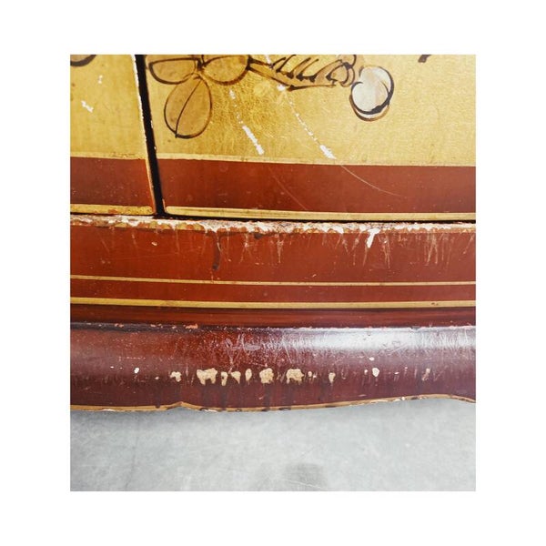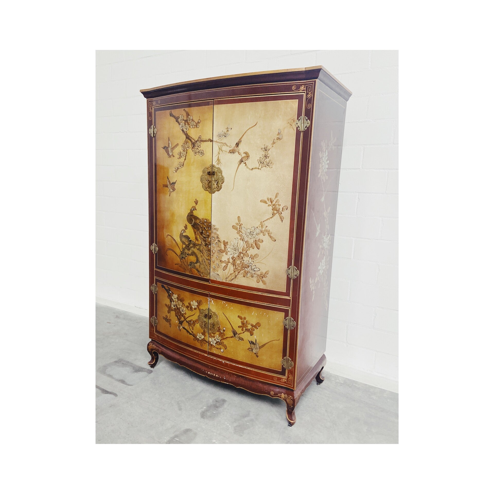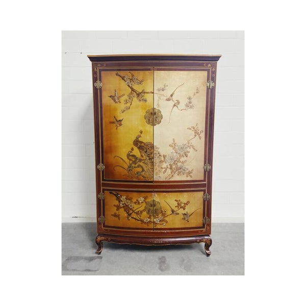Zeer bijzondere handgeschilderde Chinese bruidskast! De kast heeft een prachtige vergulde achtergrond en heeft verschillende met de hand geschilderde plant- en vogelmotieven. Het meubel bestaat uit een boven en onder compartiment die beide worden afgesloten door twee deuren. De deuren hebben beide het traditionele traditionele hang en sluit werk van de chinese bruidskasten!
