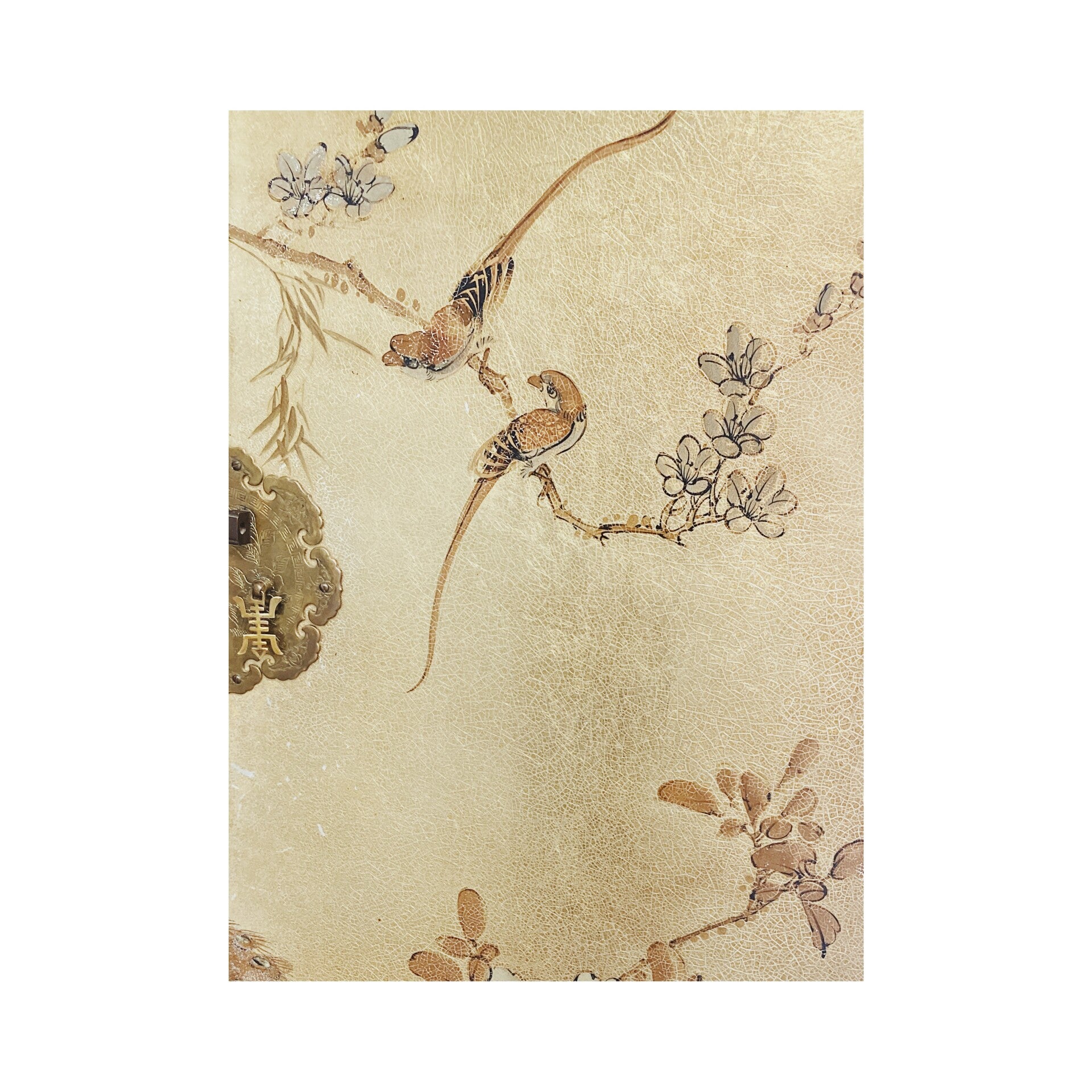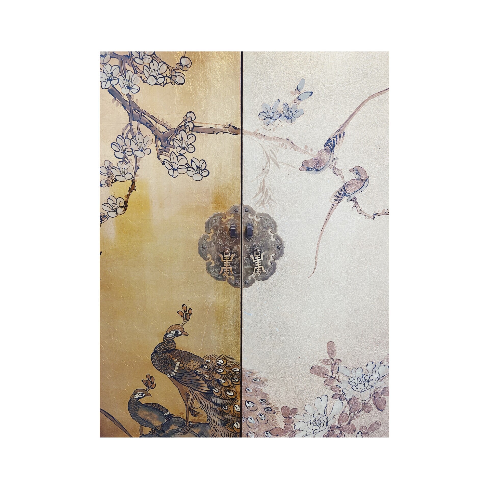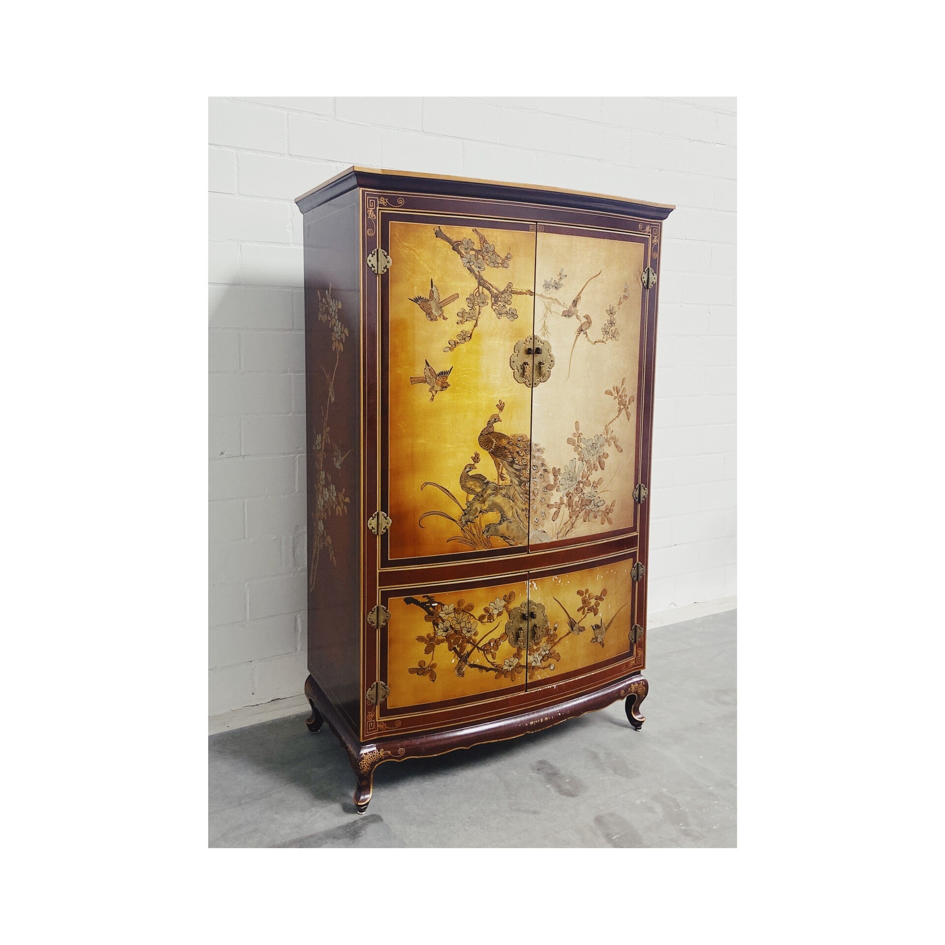 Zeer bijzondere handgeschilderde Chinese bruidskast! De kast heeft een prachtige vergulde achtergrond en heeft verschillende met de hand geschilderde plant- en vogelmotieven. Het meubel bestaat uit een boven en onder compartiment die beide worden afgesloten door twee deuren. De deuren hebben beide het traditionele traditionele hang en sluit werk van de chinese bruidskasten!