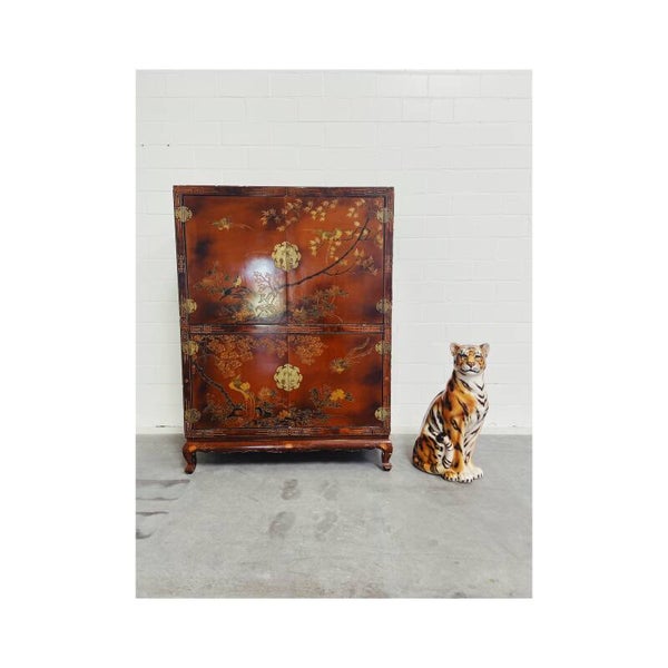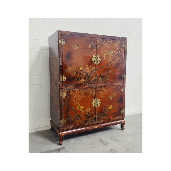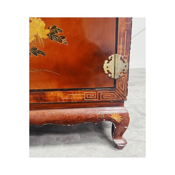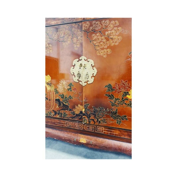 Zeer bijzondere met de hand geschilderde buffet/tv kast. De kast heeft een prachtig bruin gelakte achtergrond en heeft verschillende met de hand geschilderde plant, boom- en vogelmotieven. Het meubel bestaat uit een boven en onder compartiment die beide worden afgesloten door twee deuren. De deuren hebben beide het traditionele hang en sluit werk van de Chinese bruidskasten!