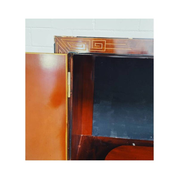 Het bovenvak heeft een uitschuifplank, die gebruikt kan worden voor een televisie en bijbehorende accessoires. Deze plank kan er ook uitgehaald worden. De kast heeft wat gebruikssporen in het lak gezien de leeftijd en de rechter bovendeur die gaat wat stroef open en dicht. Wij raden dan ook aan om een vrijblijvende afspraak te maken en de kast even goed in echt te komen bekijken. Verder is de kast in hele goede conditie en zal het een waanzinnige unieke toevoeging zijn aan je interieur.