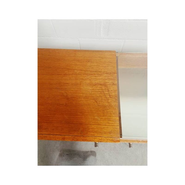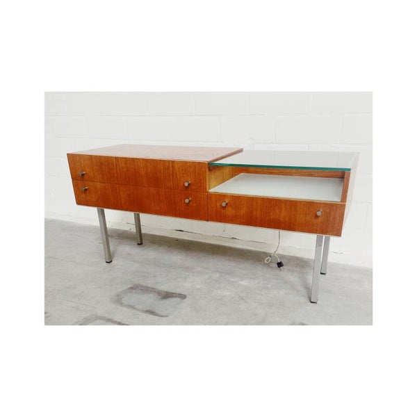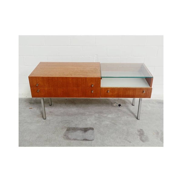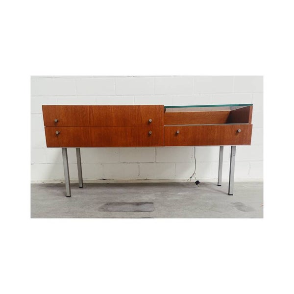 Vintage lowboard met een glazen opbergruimte. Het vintage dressoir is perfect voor in de woonkamer en ook goed te gebruiken als tv-meubel of meubel voor je platenspeler! Het dressoir is voorzien van drie gelijke lades en heeft aan de rechterzijde een glazen opbergvak die opgelicht kan worden met een lampje. Het lowboard heeft metalen handgrepen en pootjes die het geheel een strakke look geven. Het dressoir heeft enkele krasjes in het houten bovenblad, (zie fotos voor meer details) maar is verder in hele goede vintage conditie!