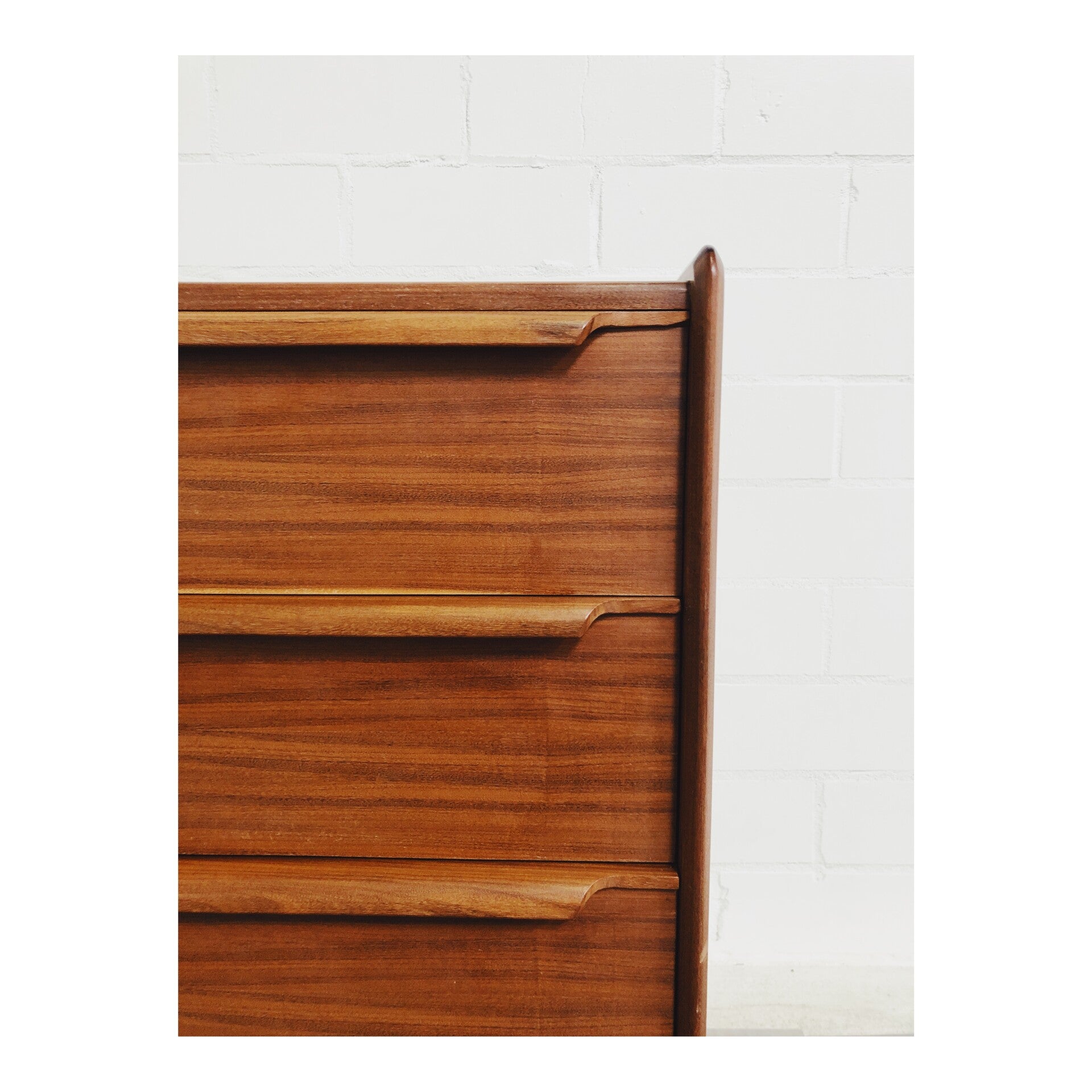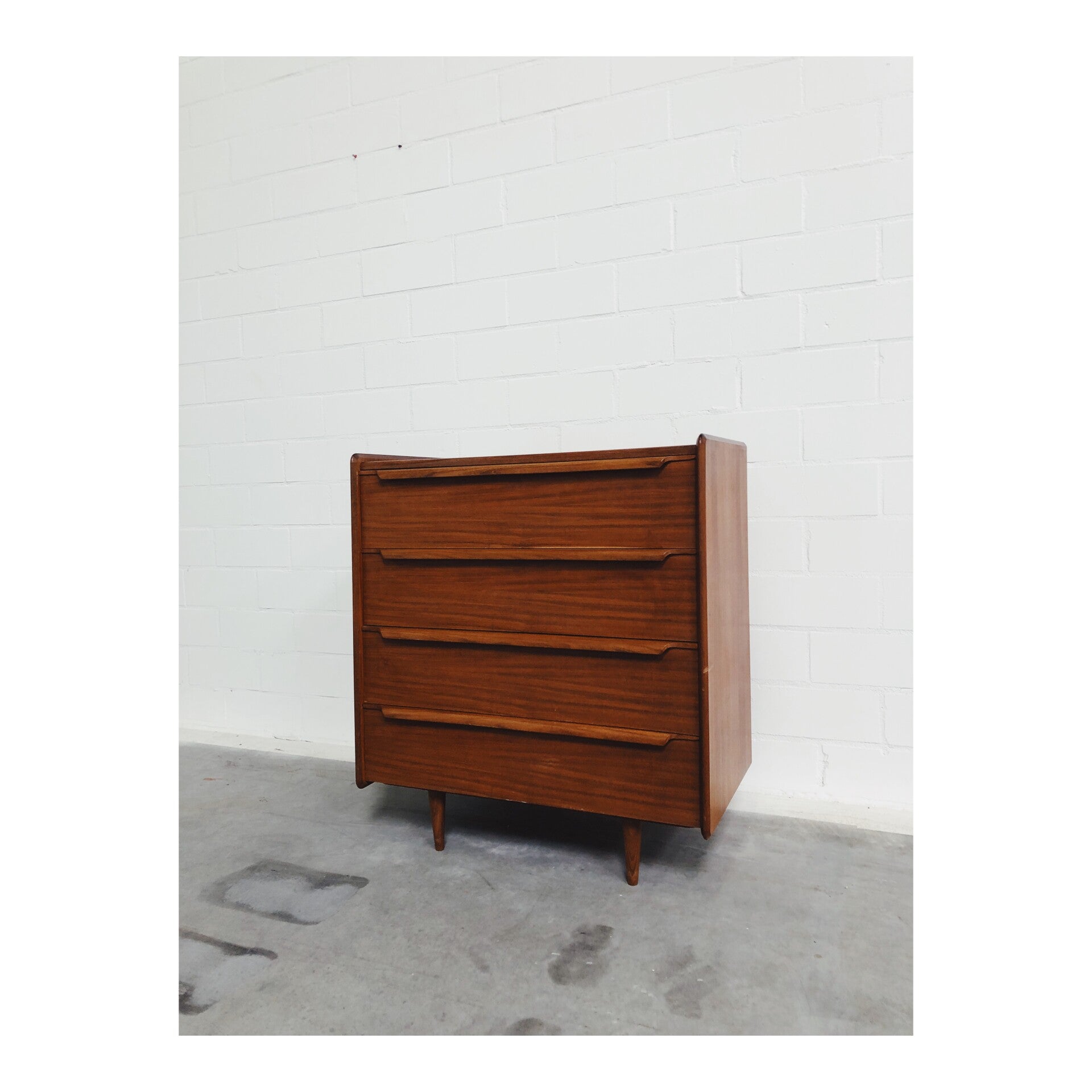Scandinavische vintage meubels zijn op dit moment helemaal hip! Deze authentieke ladenkast past helemaal in dit straatje. De teak houten kast heeft vier ruime opbergladen met prachtige uit hout gesneden handgrepen. De kast is uitgevoerd in prachtig teak fineer en is in uitstekende staat. Er zijn wat minimale verkleuringen zichtbaar maar is verder bijna als nieuw.