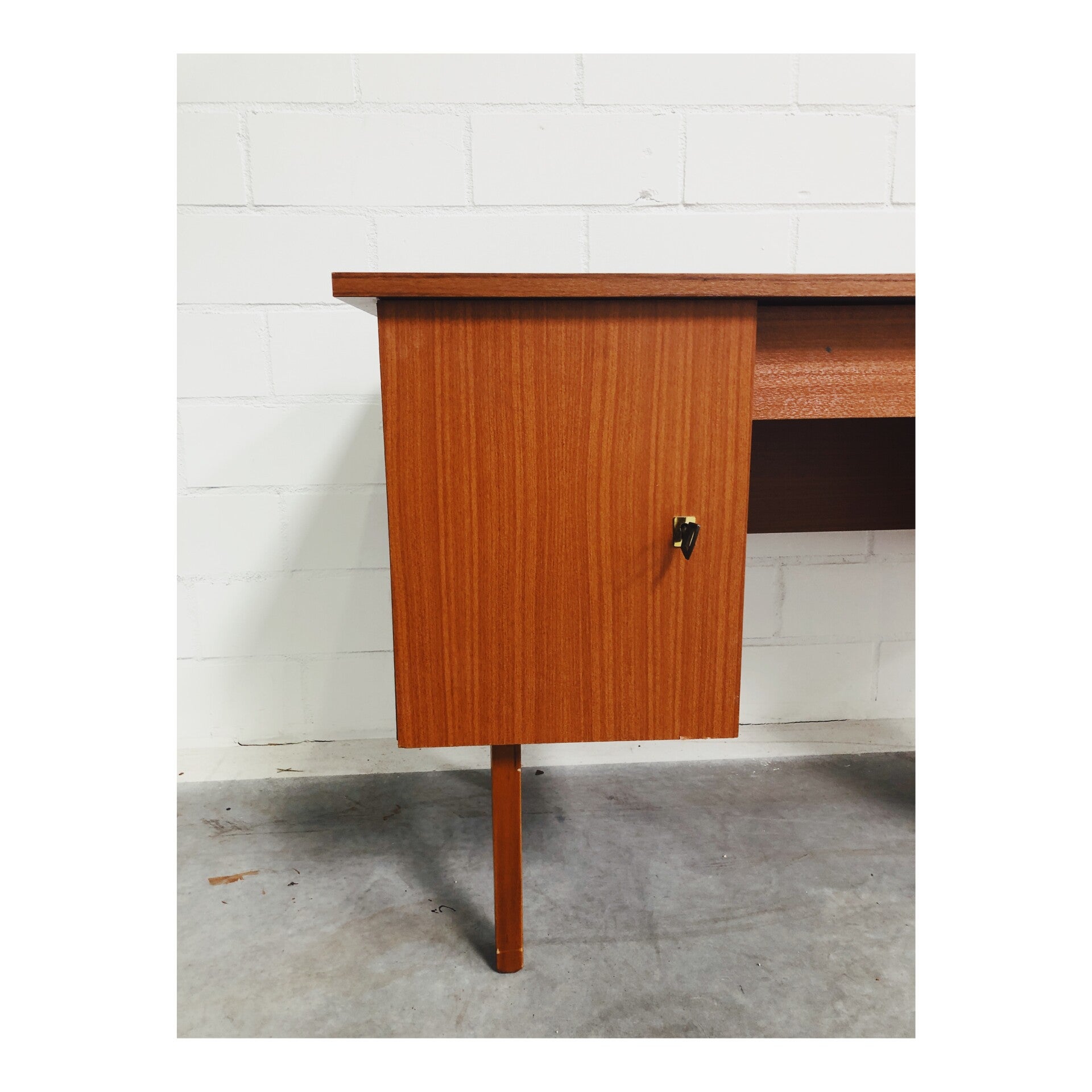 Dit prachtige vintage bureau is het ideale studeer- of werk meubel. Het bureau is vervaardigd in teak fineer. Het meubel heeft links en rechts twee kastjes die worden afgesloten met metalen sleutel en slot. Ook heeft het mid-century bureau een handige lade in het midden. Het meubel heeft een paar kleine beschadigingen, maar is in het algemeen in goede staat!