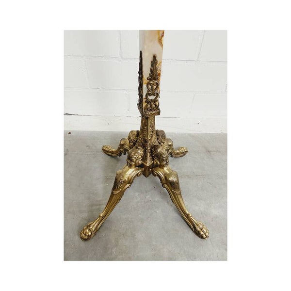 Aan deze Hollywood Regency kapstok kan je je jassen ophangen in stijl! Deze papegaaien kapstok heeft een prachtig goud-messing statief versierd met hoofden. Het bovenste stuk heeft vier dubbele vacht haken en het geheel staat op een stang van marmer. De kapstok is in top conditie en de bovenkant is demonteerbaar voor vervoer.