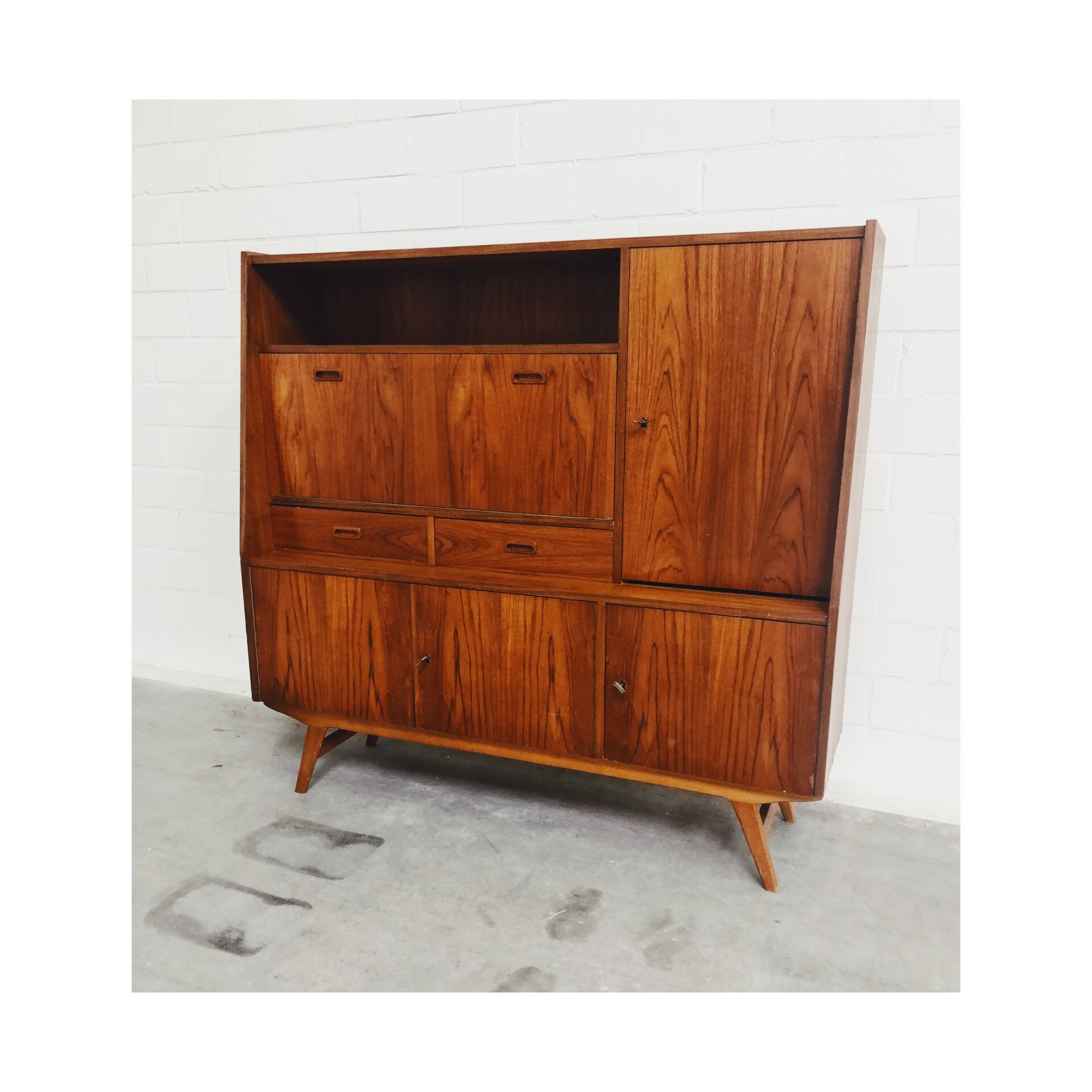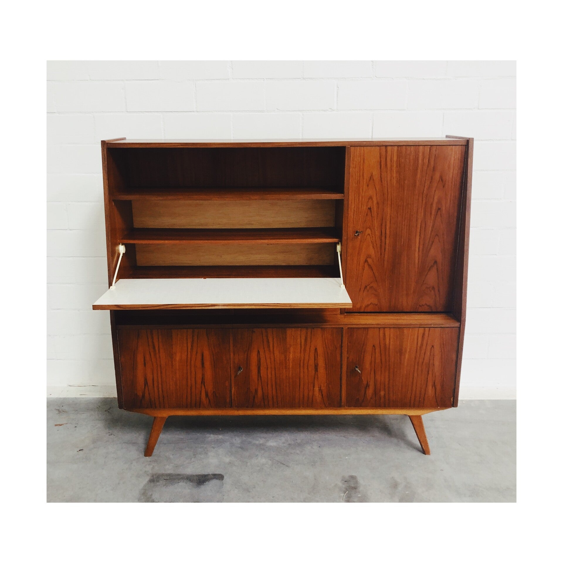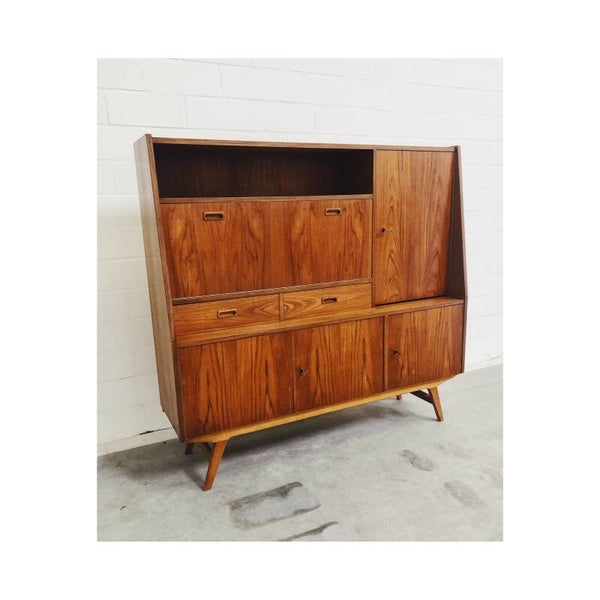 Het bovenste deel van de kast bestaat uit een kleplade met opbergruimte die ook als bureau gebruikt kan worden. De deense designkast staat op unieke uiteenlopende poten en heeft prachtig afgewerkte handgrepen! Het highboard heeft wat kleine verfvlekjes en aan de zijkant wat beschadigingen in het fineer. Zie de foto's voor meer details of maak geheel vrijblijvend een afspraak om het meubel te komen bekijken.