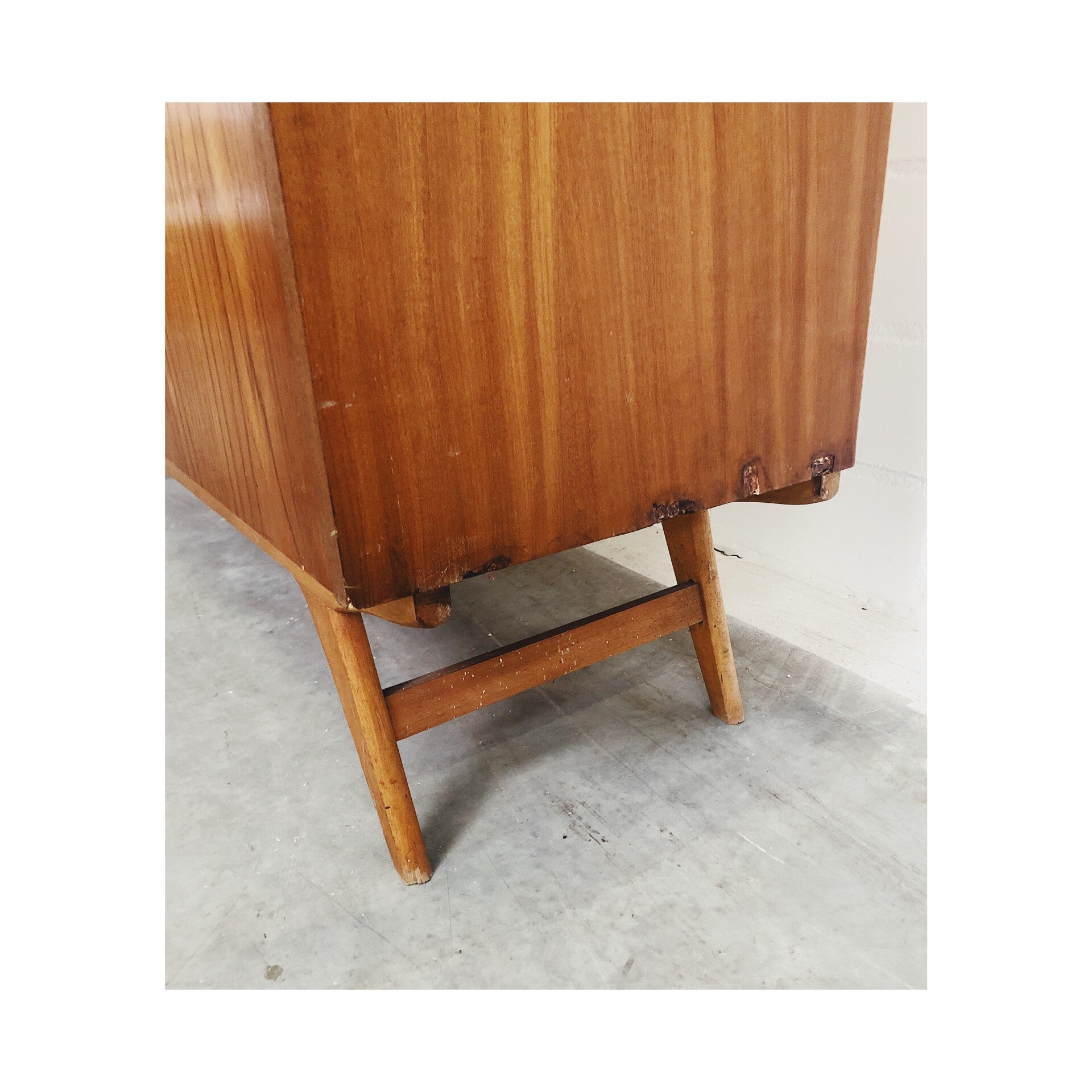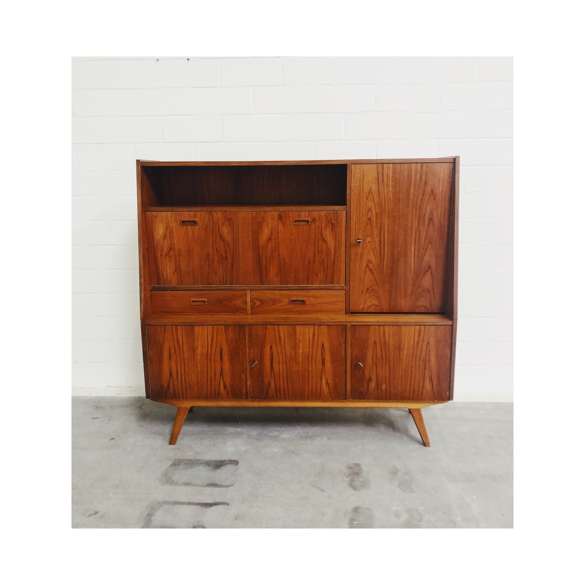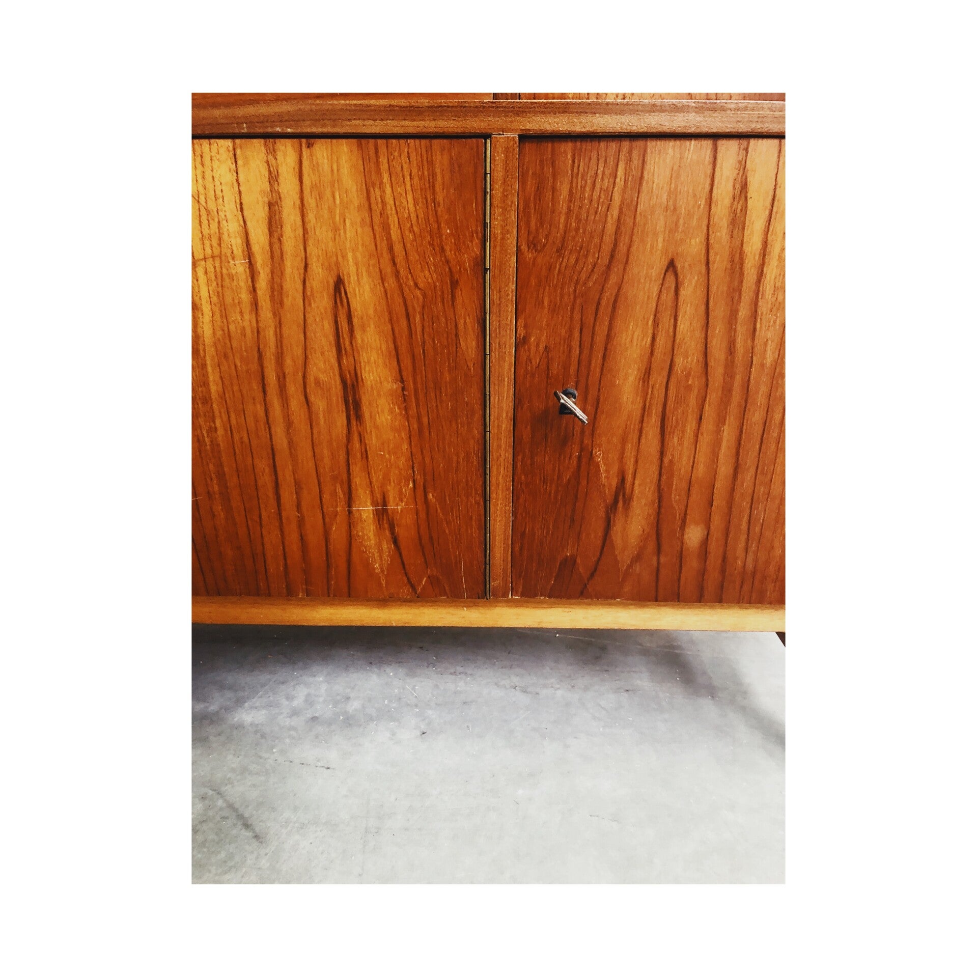 Het bovenste deel van de kast bestaat uit een kleplade met opbergruimte die ook als bureau gebruikt kan worden. De deense designkast staat op unieke uiteenlopende poten en heeft prachtig afgewerkte handgrepen! Het highboard heeft wat kleine verfvlekjes en aan de zijkant wat beschadigingen in het fineer. Zie de foto's voor meer details of maak geheel vrijblijvend een afspraak om het meubel te komen bekijken.