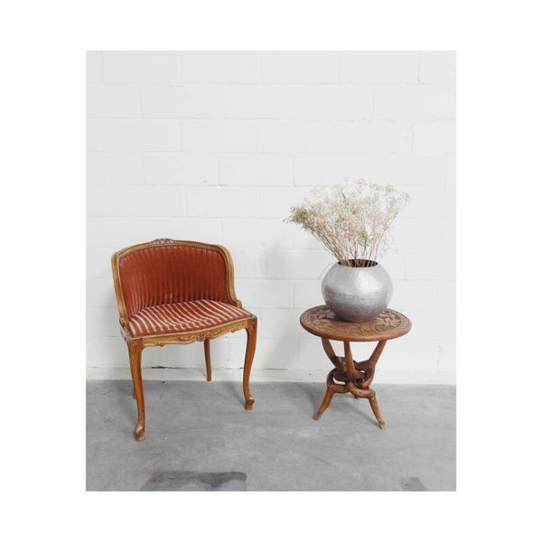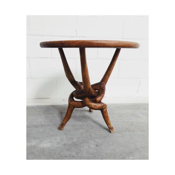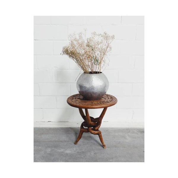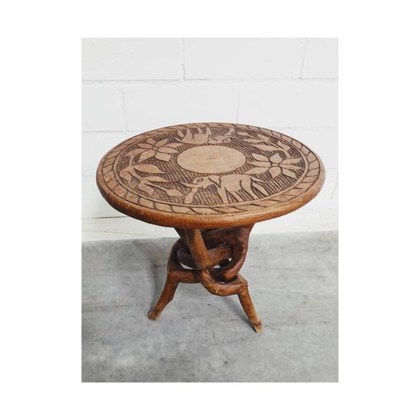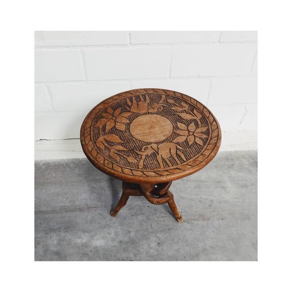 Uniek Afrikaans bijzettafeltje met een bijzonder houtgegraveerd blad. Het bovenblad heeft een mooi sierlijk patroon met uit hout gesneden olifantjes. Het blad steunt op een in elkaar draaiende voet die in elkaar verbonden zijn. Het tafeltje is in perfecte vintage staat. Ideaal als bijzetttafel maar ook super om je plantjes op te zetten!