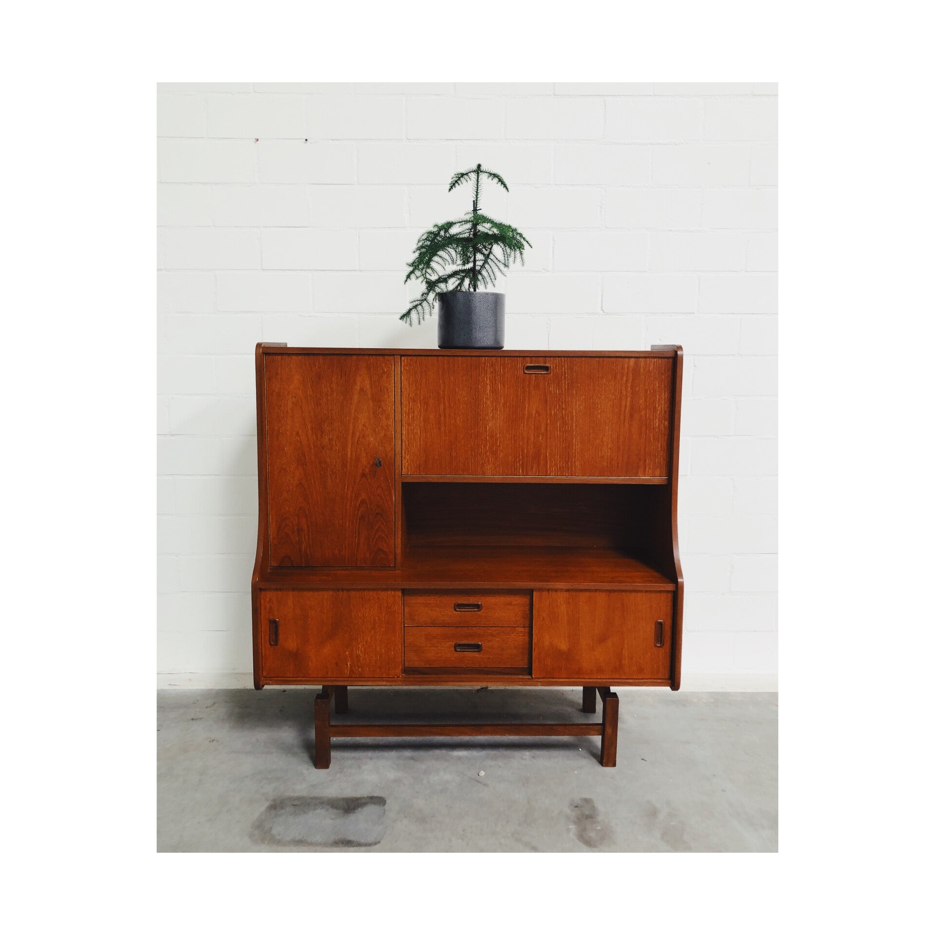Prachtig Deens Design highboard! De kast heeft enorm veel opbergruimte en een super handige kleplade. De kast heeft 2 kleine laden en twee schuifdeurtjes aan de onderzijde, die elk zijn afgewerkt met houten handgreepjes. De rechterzijde heeft een groot opberggedeelte dat wordt afgewerkt met een afsluitbare deur. De wandkast staat op een uniek onderstel wat het geheel een strakke look geeft. Het highboard is in hele goede conditie en heeft minimale gebruikssporen.