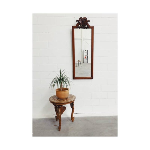 Sierlijk uit hout gesneden salontafeltje. Het tafeltje heeft poten in de vorm van olifantenkoppen die rijkelijk versierd zijn! Het tafeltje heeft prachtig inlegwerk en prachtige houtgesneden details. Het meubel heeft wat gebruikssporen naar leeftijd en omdat het om een handgemaakt product gaat. Er missen wat slagtanden van de olifantenkoppen en missen er wat kleine stukjes uit het bovenblad. Desalniettemin zal dit unieke tafeltje een prachtige aanwinst zijn voor je interieur!