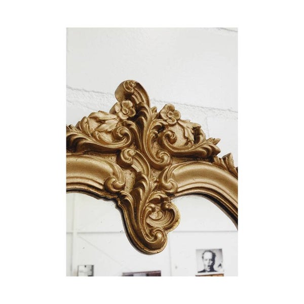 Klassieke barok spiegel met decoratief gouden frame. De spiegel heeft een prachtige houten lijst met een sierlijke kuif. Deze gouden klassieker is in hele goede conditie en heeft een stevig ophangsysteem. Afmetingen Hoogte: 86cmBreedte: 61cm