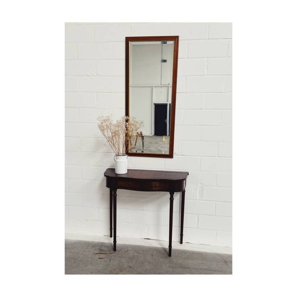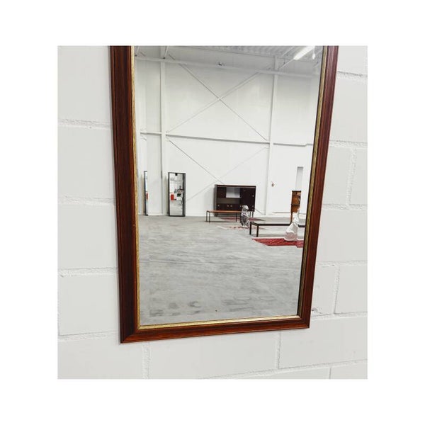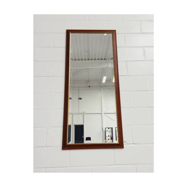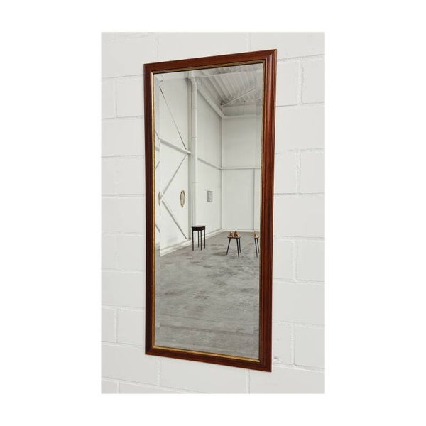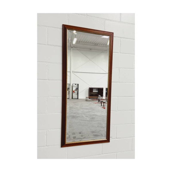 Een prachtige passpiegel met een gouden detail en houten frame. De spiegel is perfect voor aan de muur maar kan ook op een dressoir geplaatst worden. Aan de achterzijde bevind zich een stevig ophanghaakje. De spiegel is in erg goede staat en een pareltje voor je interieur.